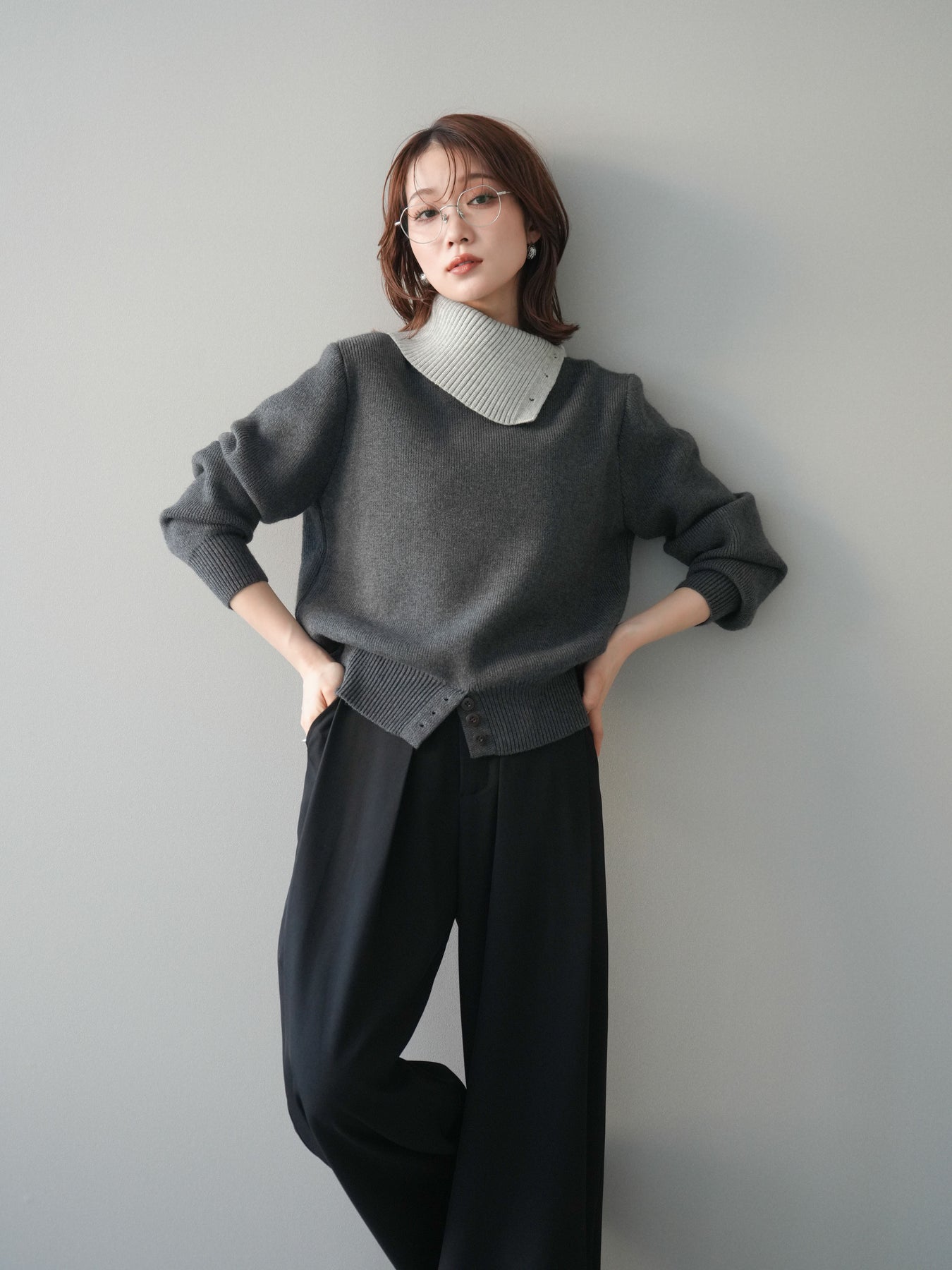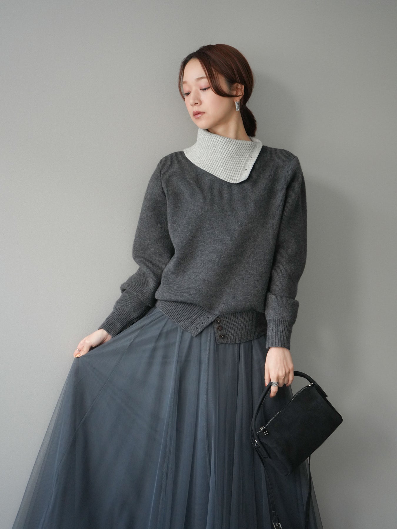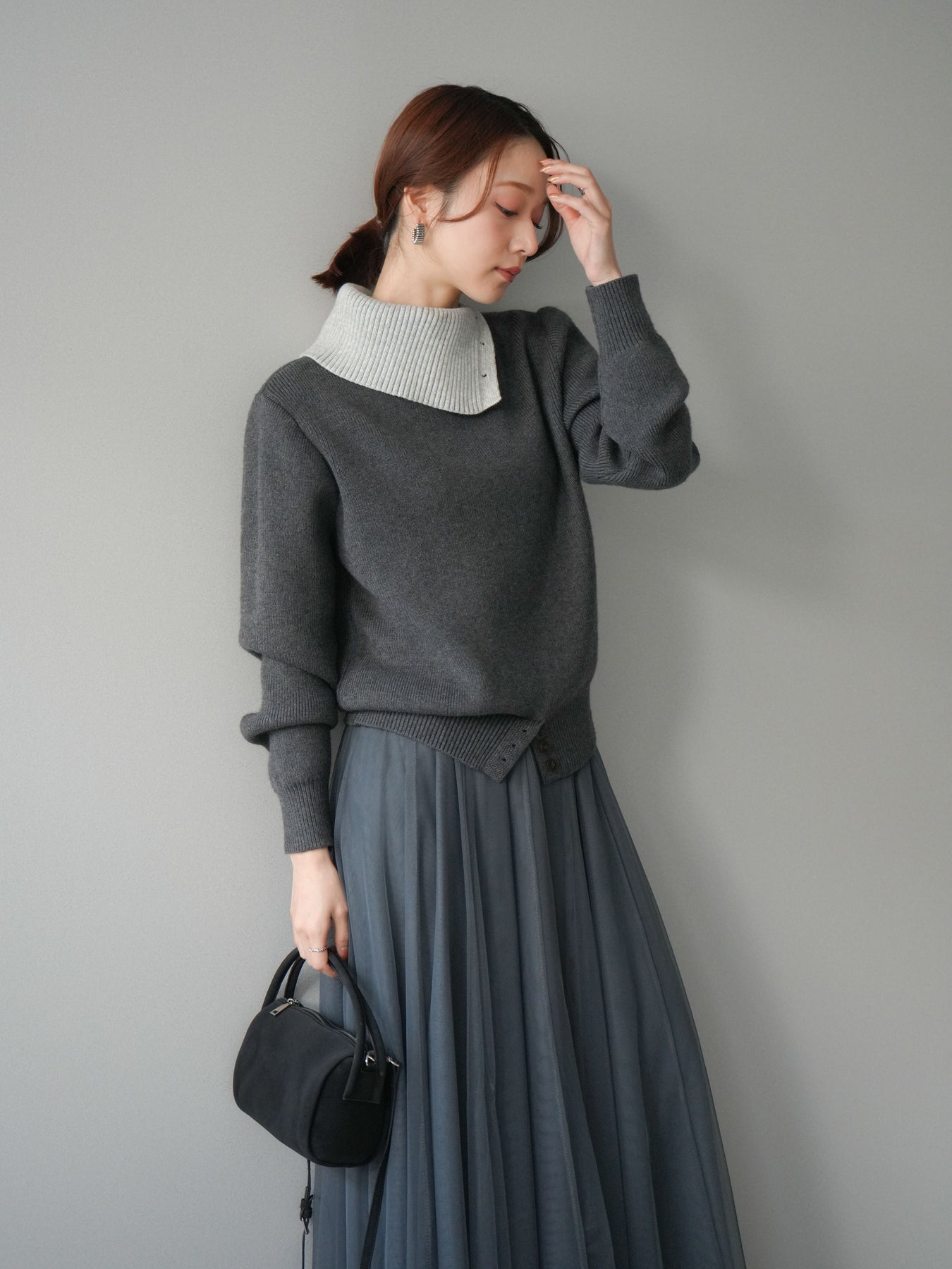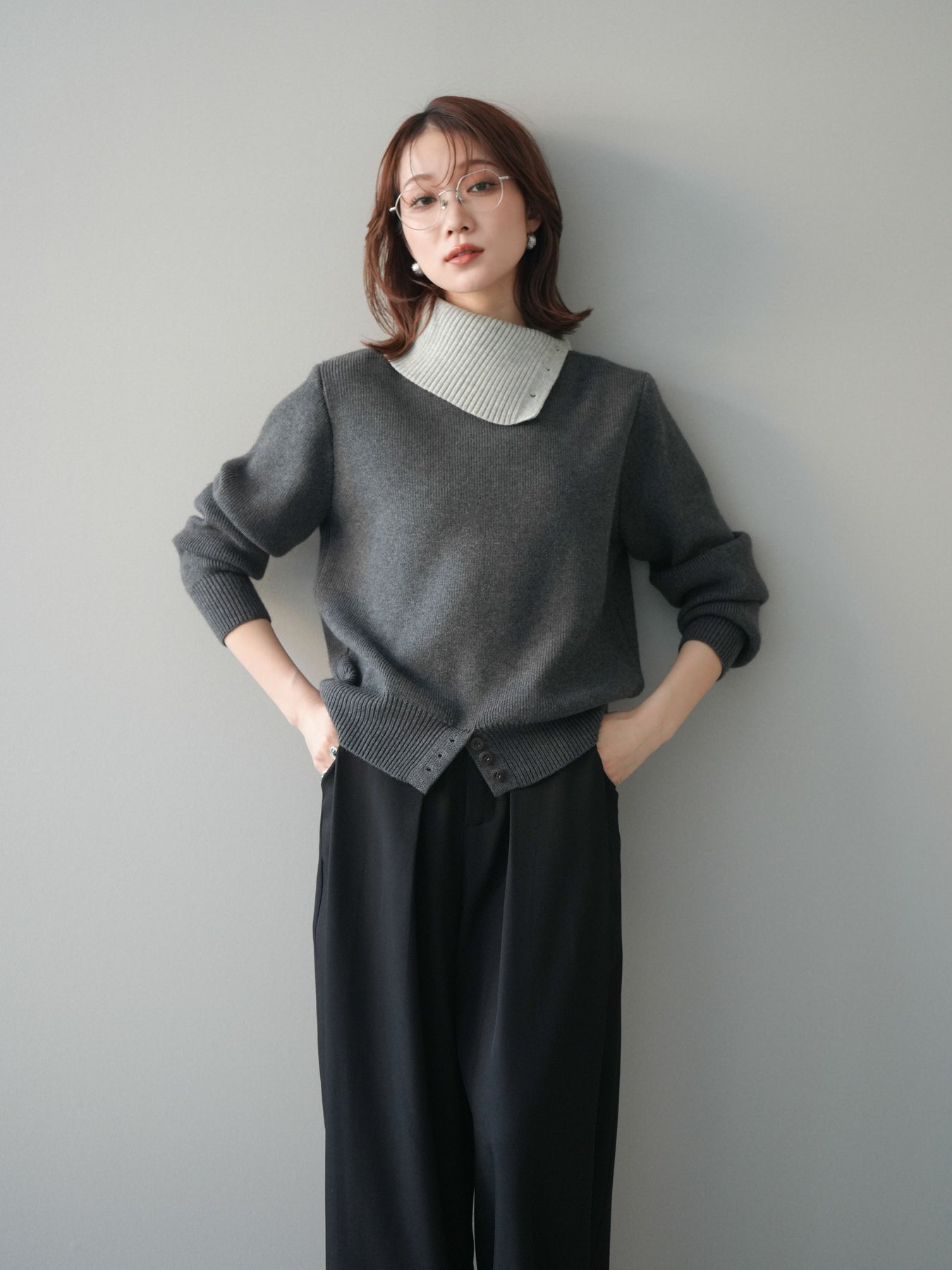 [予約]デザインネックバイカラーニットプルオーバー/charcoal