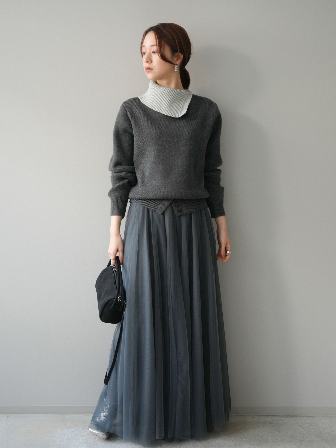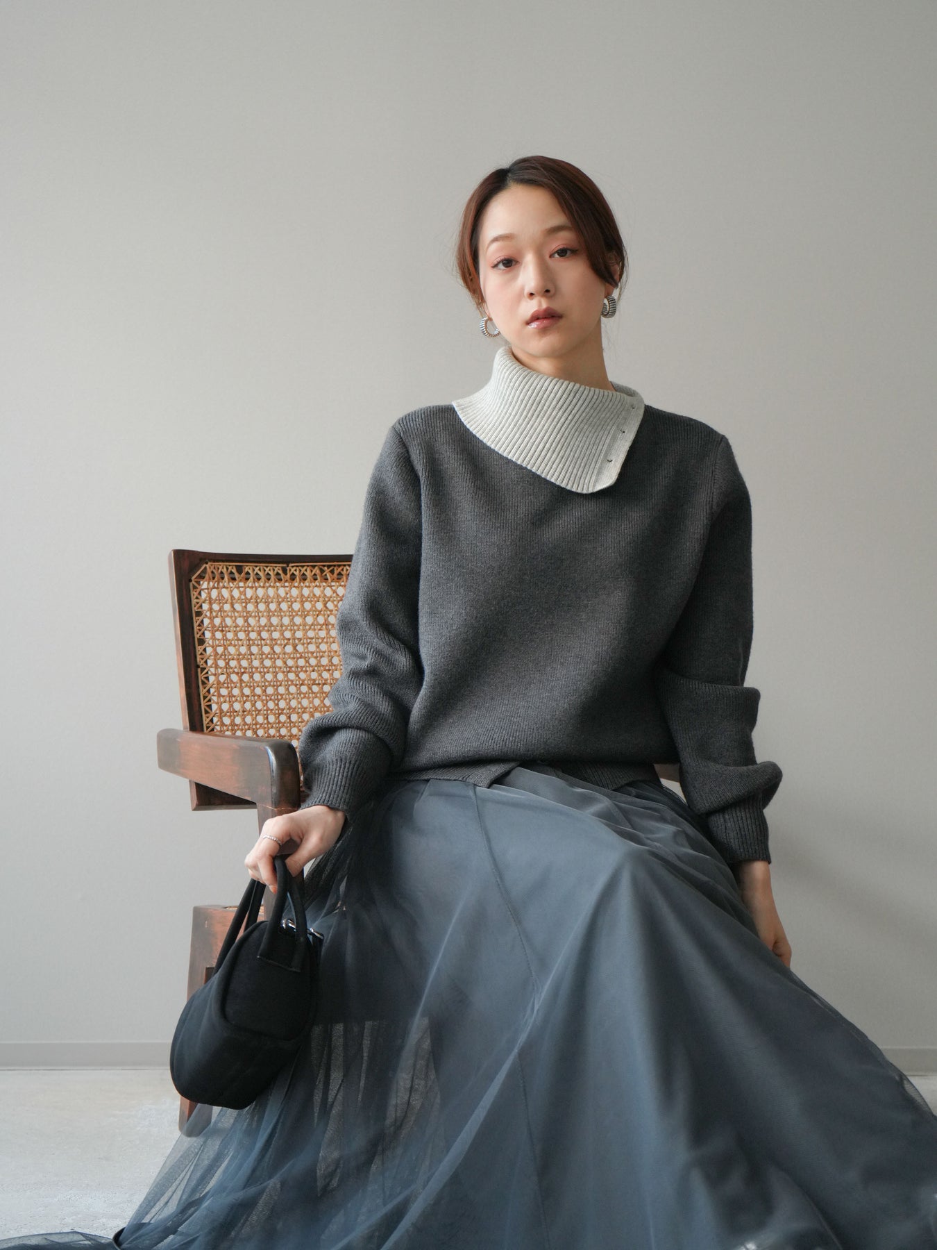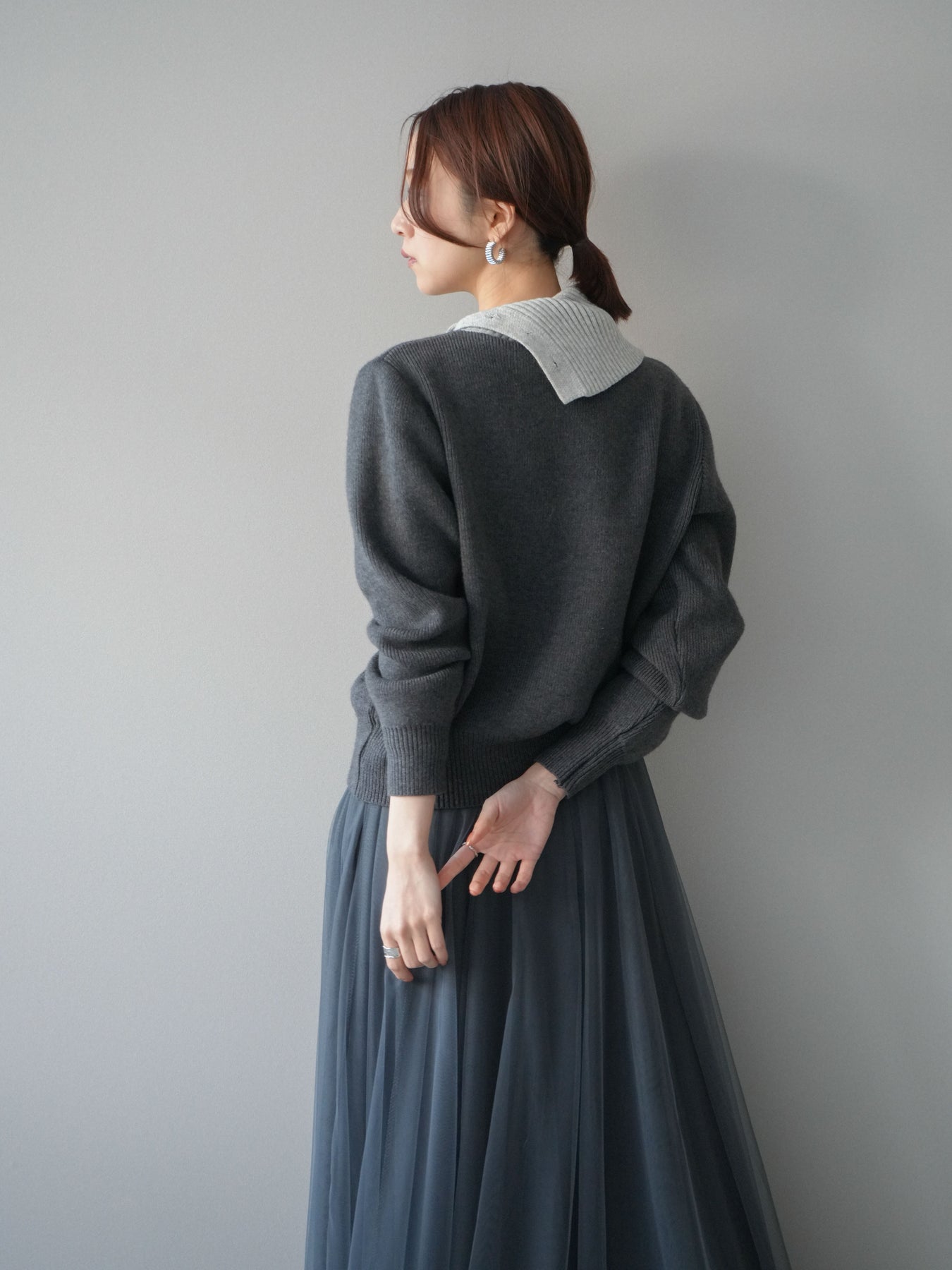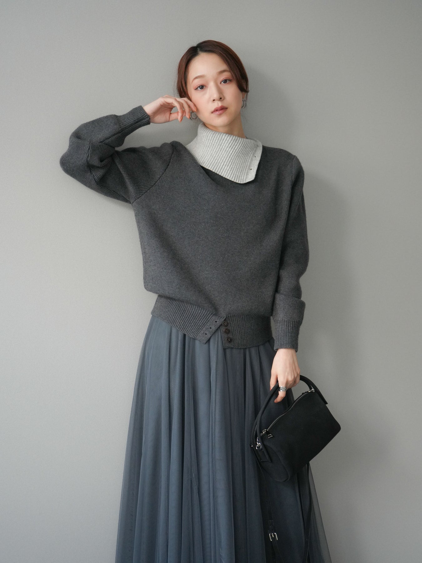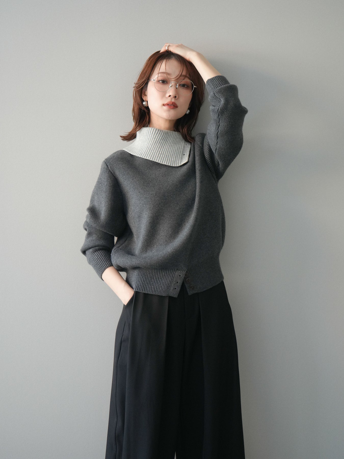 [予約]デザインネックバイカラーニットプルオーバー/charcoal