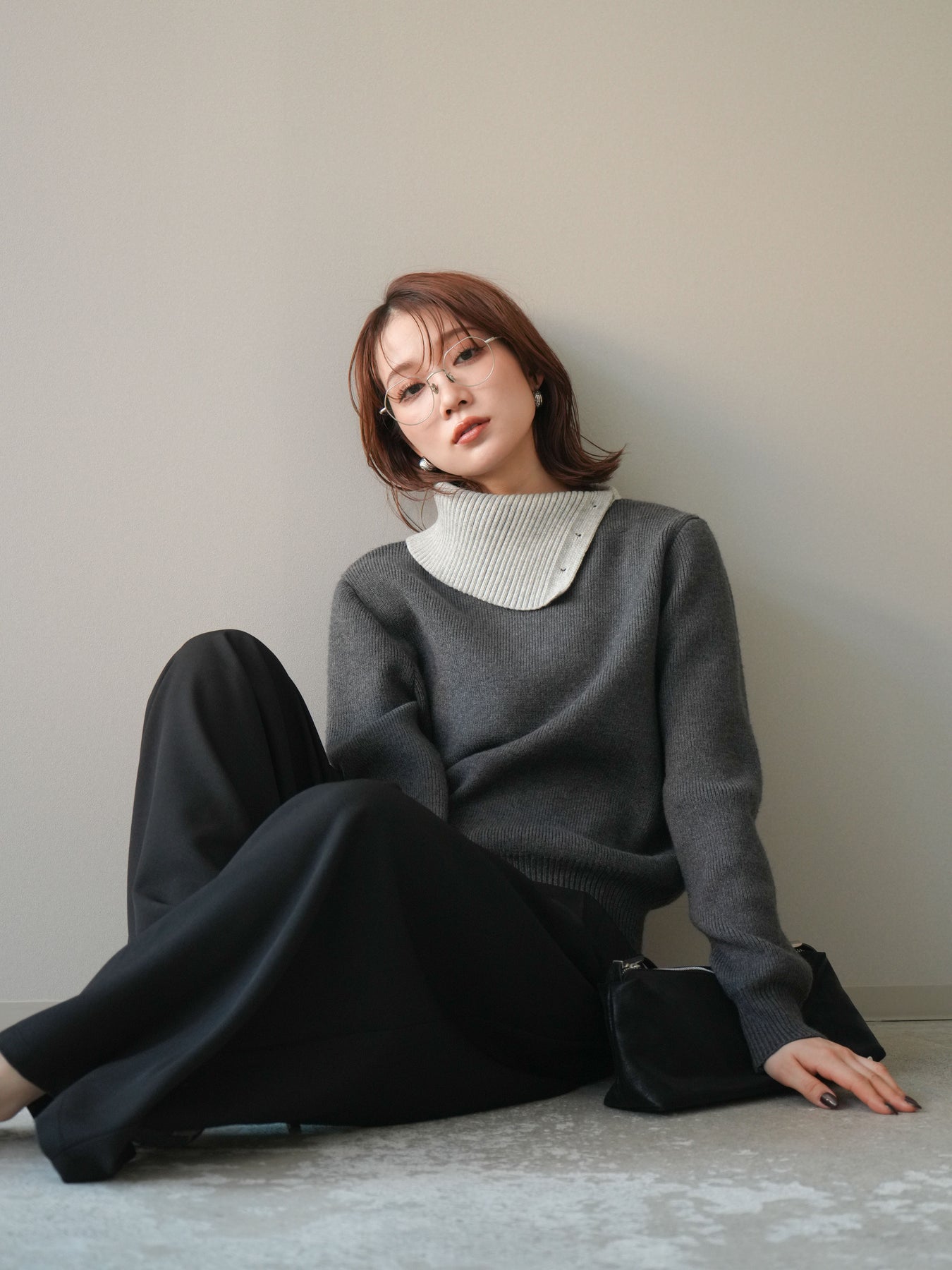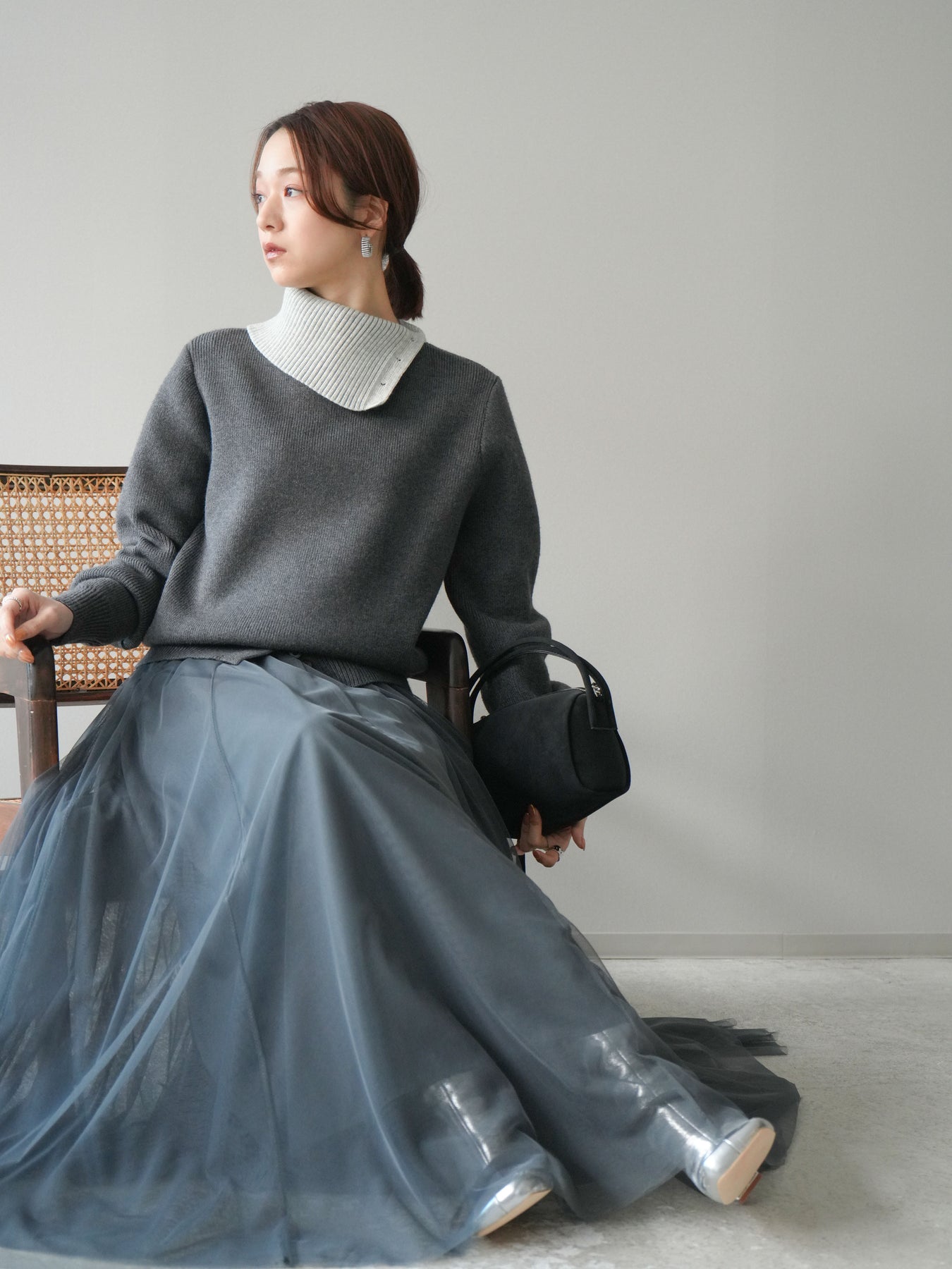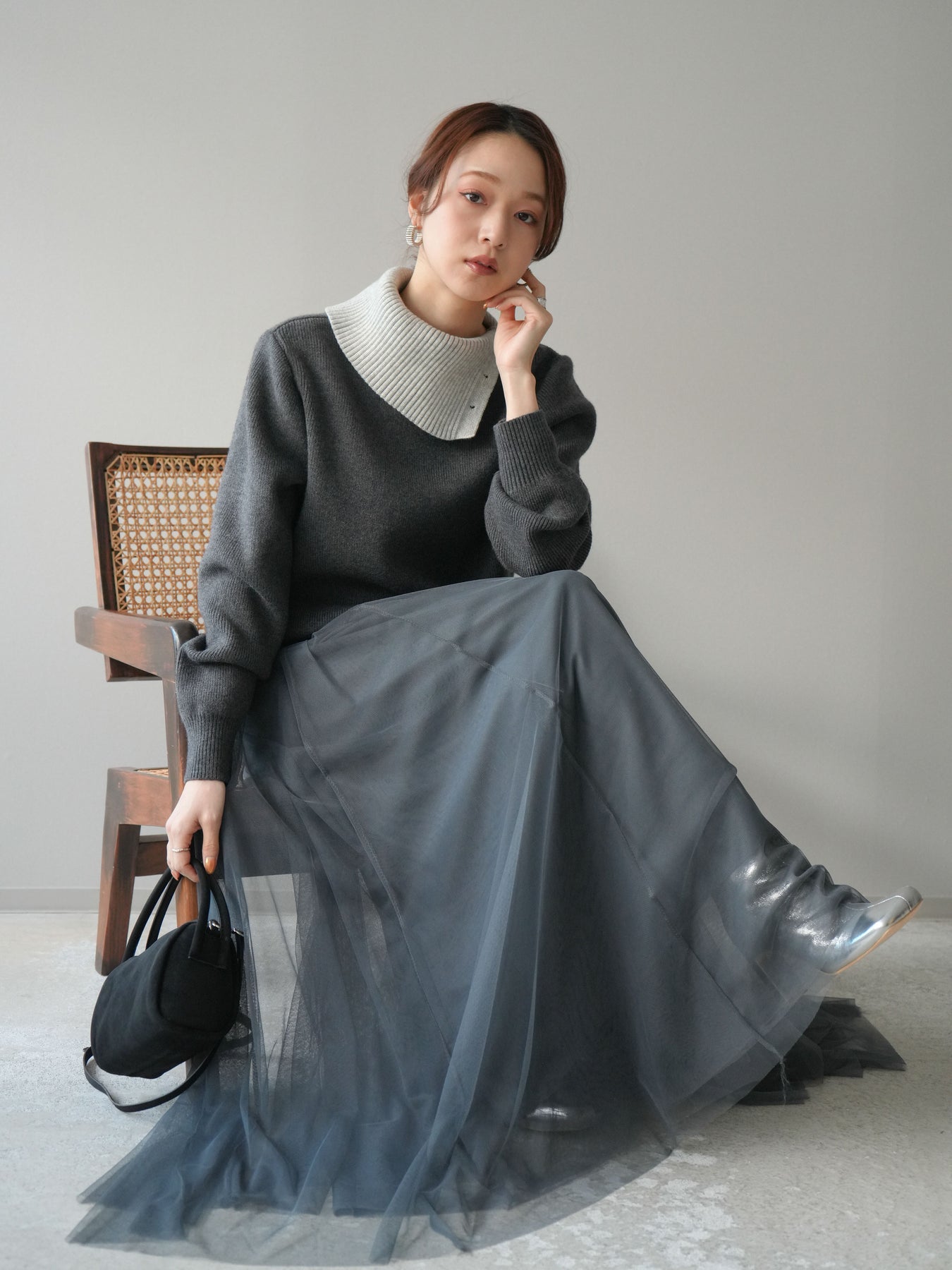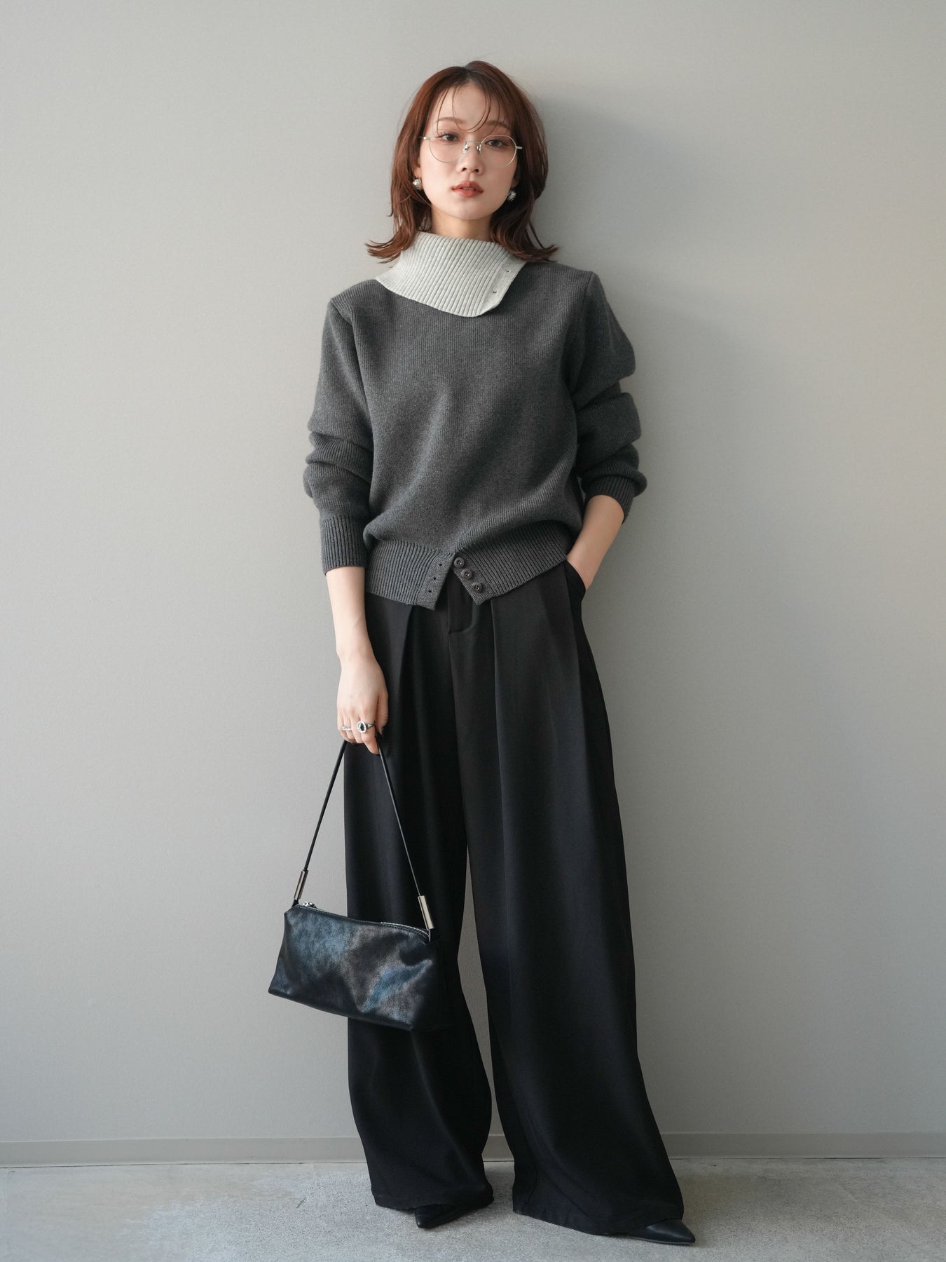 [予約]デザインネックバイカラーニットプルオーバー/charcoal