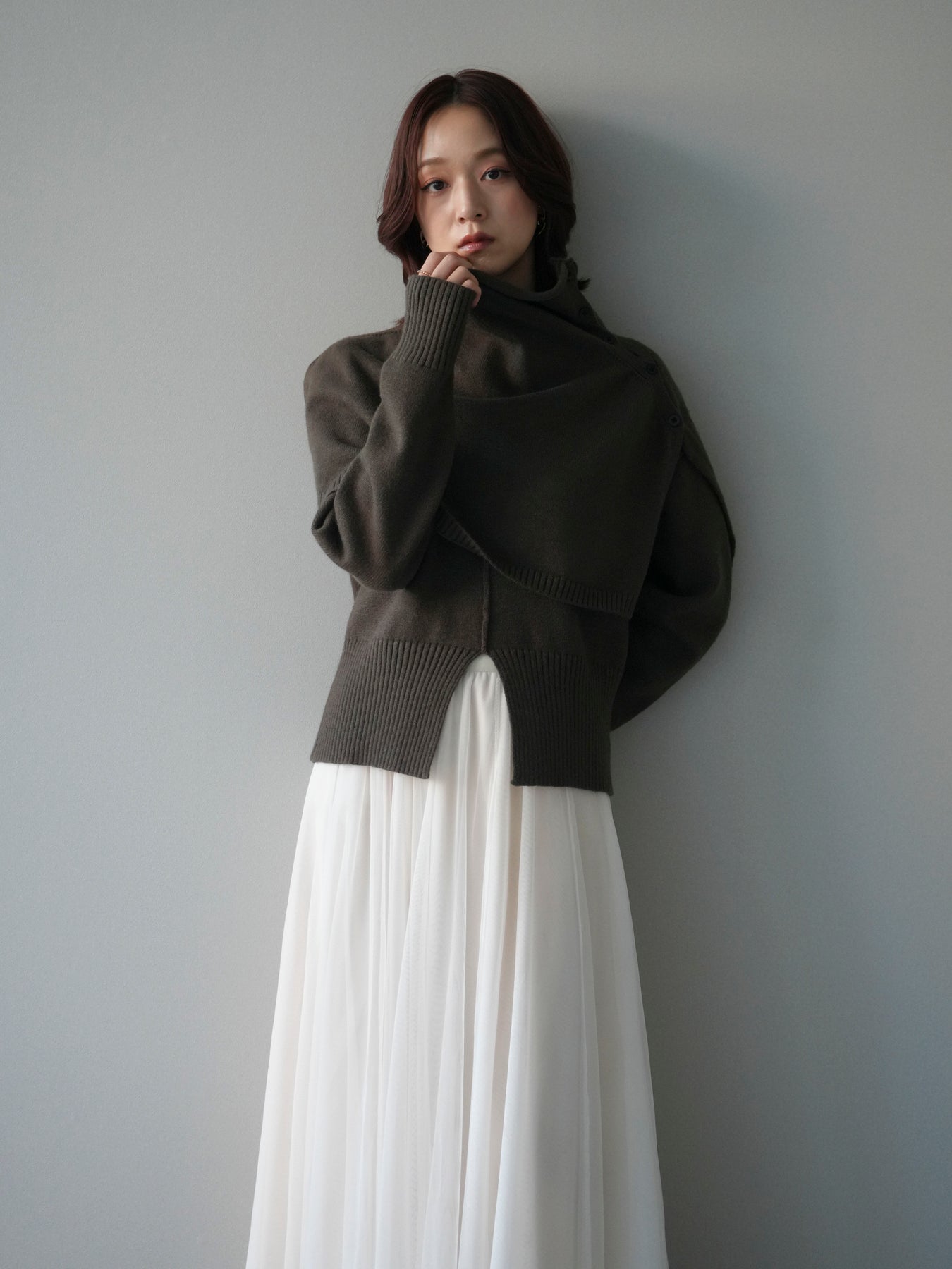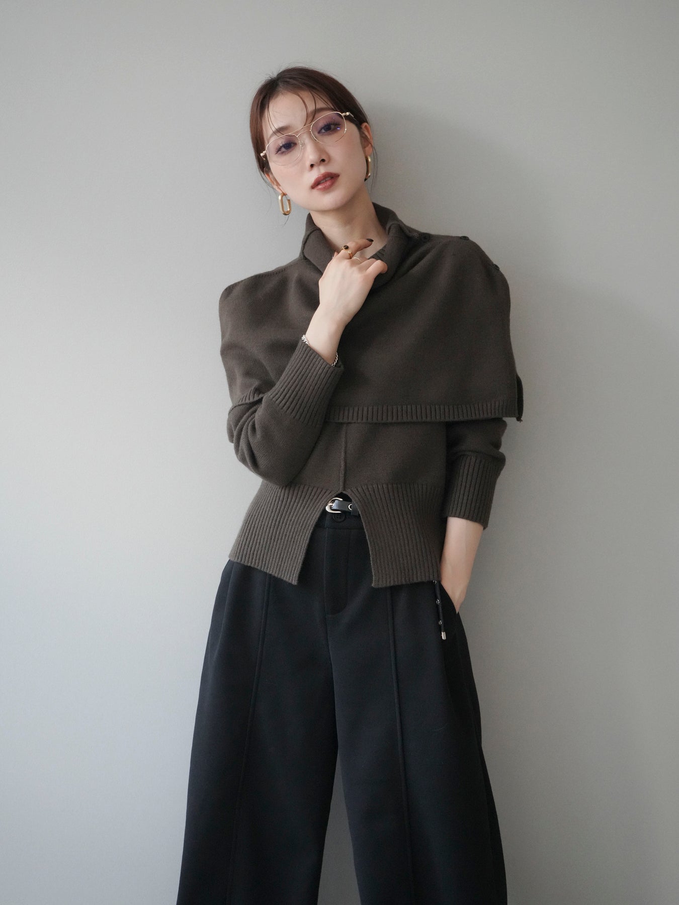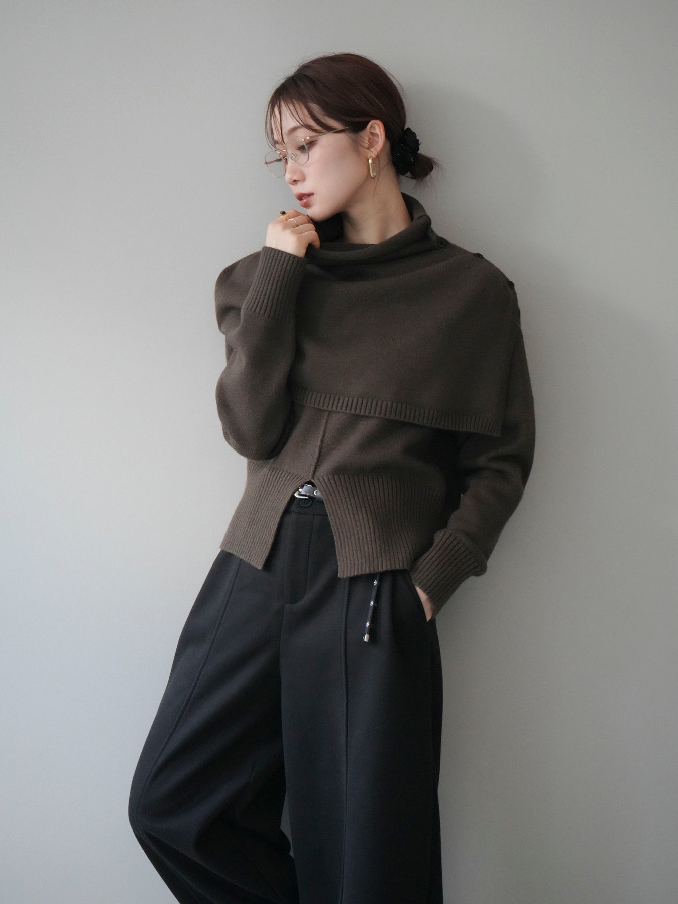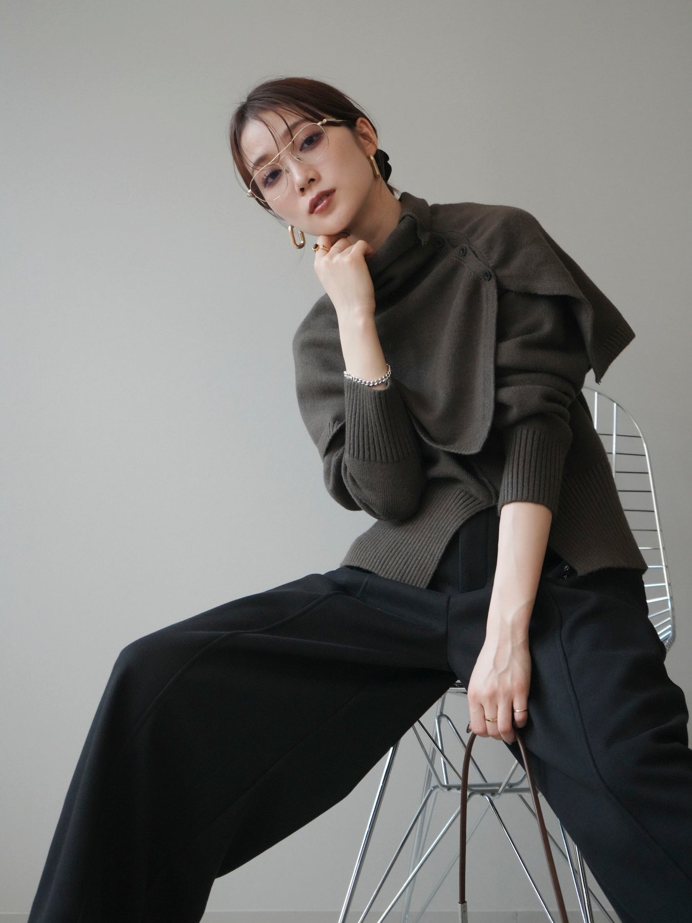 スリット入りのネックデザインが印象的なアンサンブルニット。レイヤードしたように見えるフロントのデザインがスタイリングに奥行きを生み、シンプルながら存在感のある一枚に仕上がっています。柔らかな風合いのニットは着心地がよく、程よくゆとりを持たせたシルエットがこなれ感をプラス。首元のボタンディテールは開閉によってニュアンスの変化が楽しめ、気分に合わせてアレンジできるのも魅力です。パンツにもスカートにも合わせやすく、デイリーに長く愛用できるアイテム。 ※ボトムス、キャミソール(インナー)以外の商品は一律でインナーは付属していません。