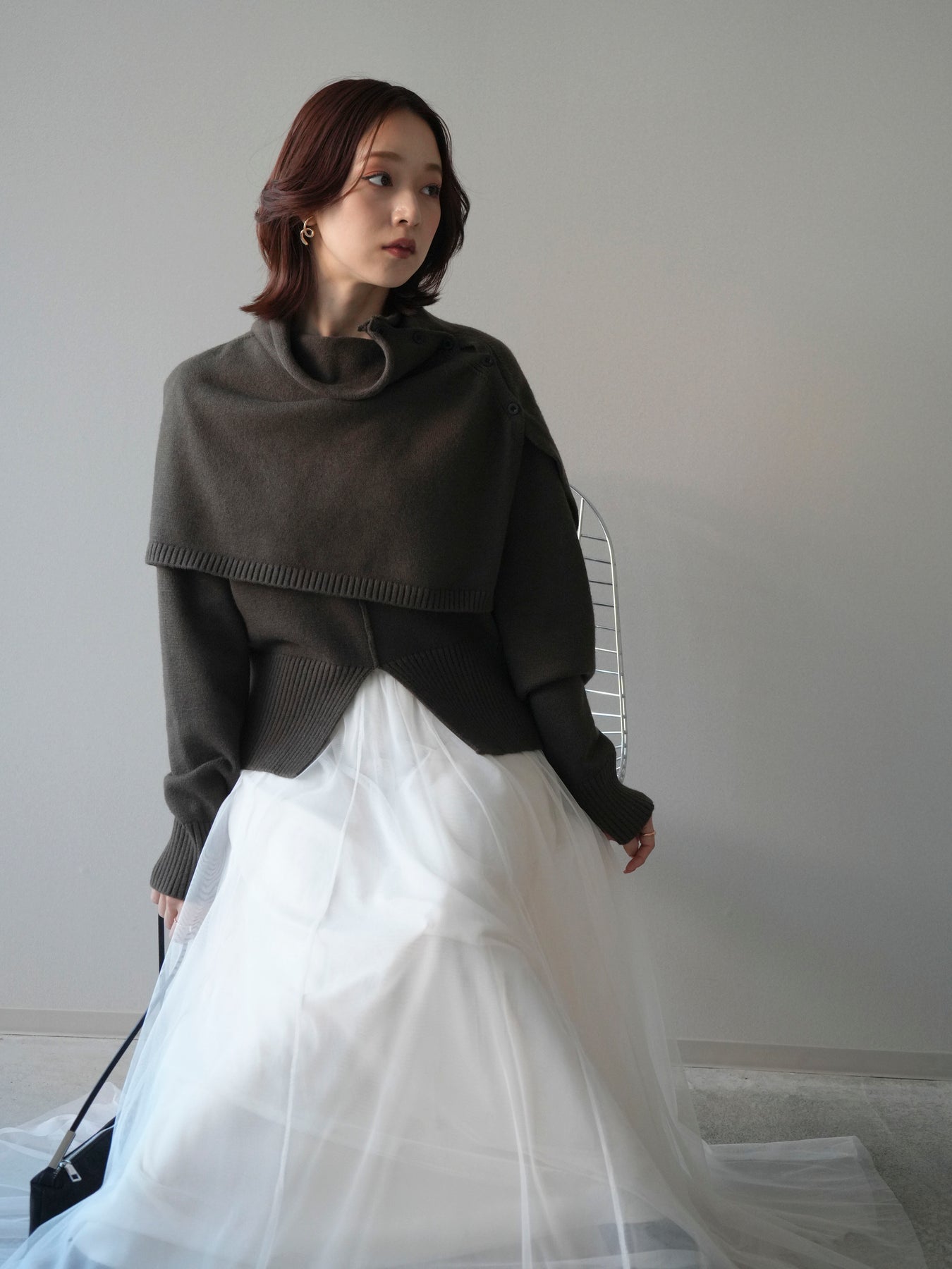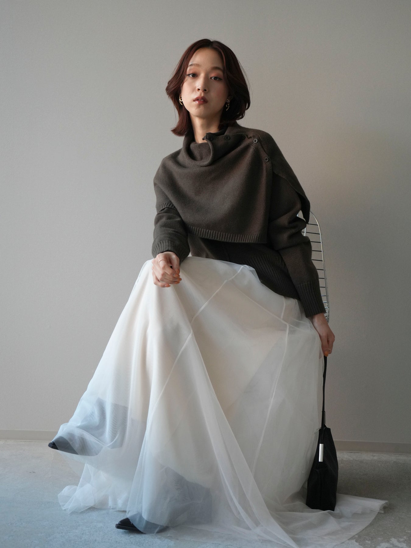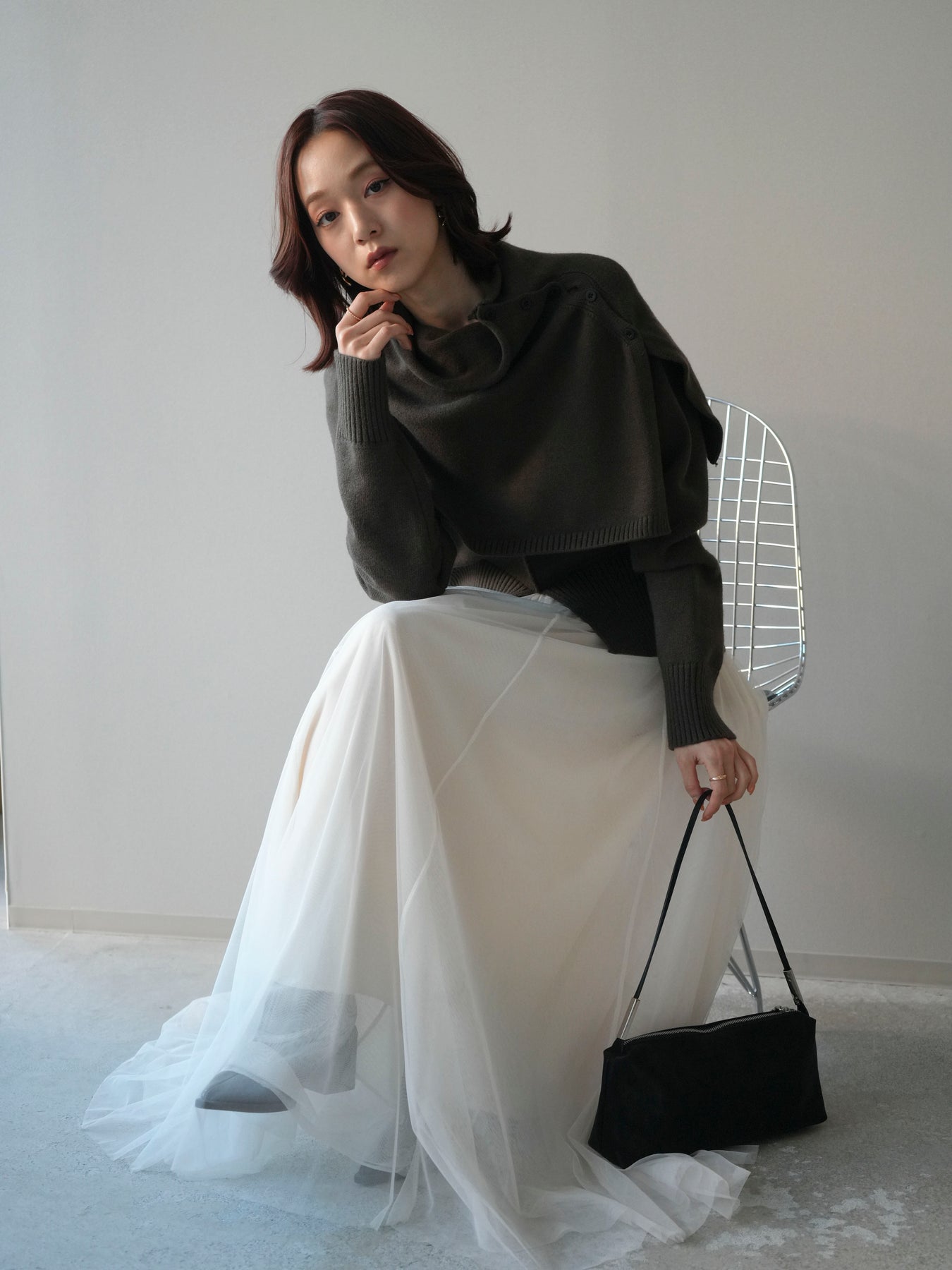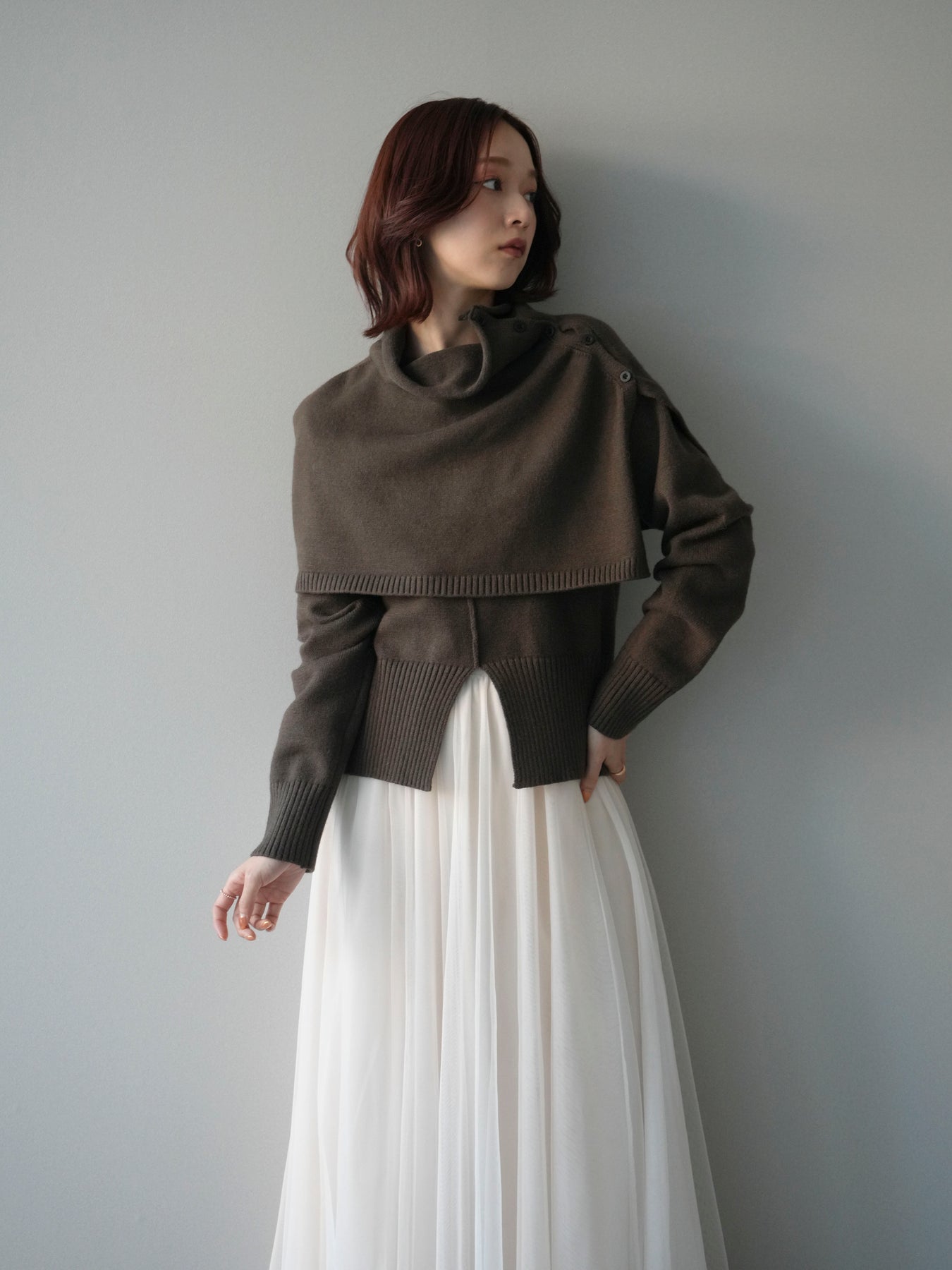 スリット入りのネックデザインが印象的なアンサンブルニット。レイヤードしたように見えるフロントのデザインがスタイリングに奥行きを生み、シンプルながら存在感のある一枚に仕上がっています。柔らかな風合いのニットは着心地がよく、程よくゆとりを持たせたシルエットがこなれ感をプラス。首元のボタンディテールは開閉によってニュアンスの変化が楽しめ、気分に合わせてアレンジできるのも魅力です。パンツにもスカートにも合わせやすく、デイリーに長く愛用できるアイテム。 ※ボトムス、キャミソール(インナー)以外の商品は一律でインナーは付属していません。
