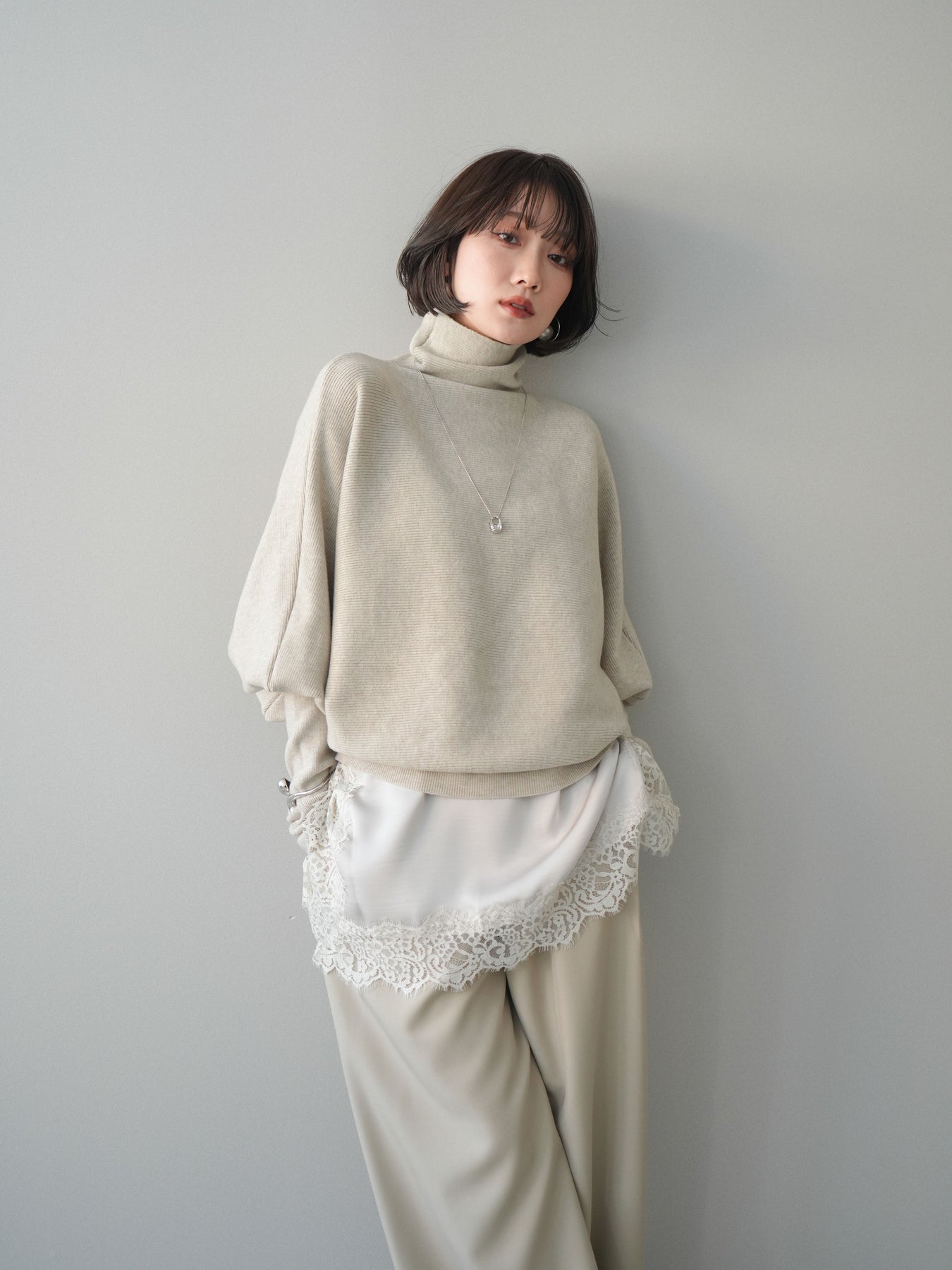 ゆったりとしたドルマンシルエットが印象的なタートルニットプルオーバー。肩から腕にかけて自然に落ちるラインが、体のラインを拾いにくく、リラックス感のある着こなしを叶えます。程よく高さのあるタートルネックが首元をやさしく包み込み、シンプルながらも存在感のあるデザインに。前後差のある裾がスタイリングに動きをプラスし、パンツにもスカートにもバランスよく合わせやすい一着です。デイリーからお出かけまで幅広いシーンで活躍します。 ※ボトムス、キャミソール(インナー)以外の商品は一律でインナーは付属していません。