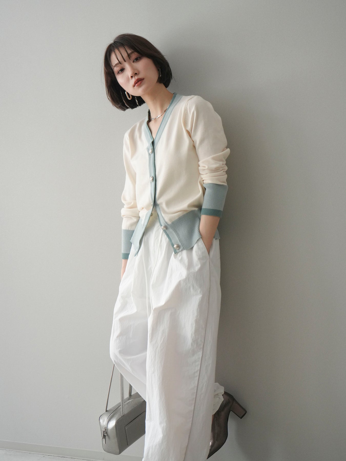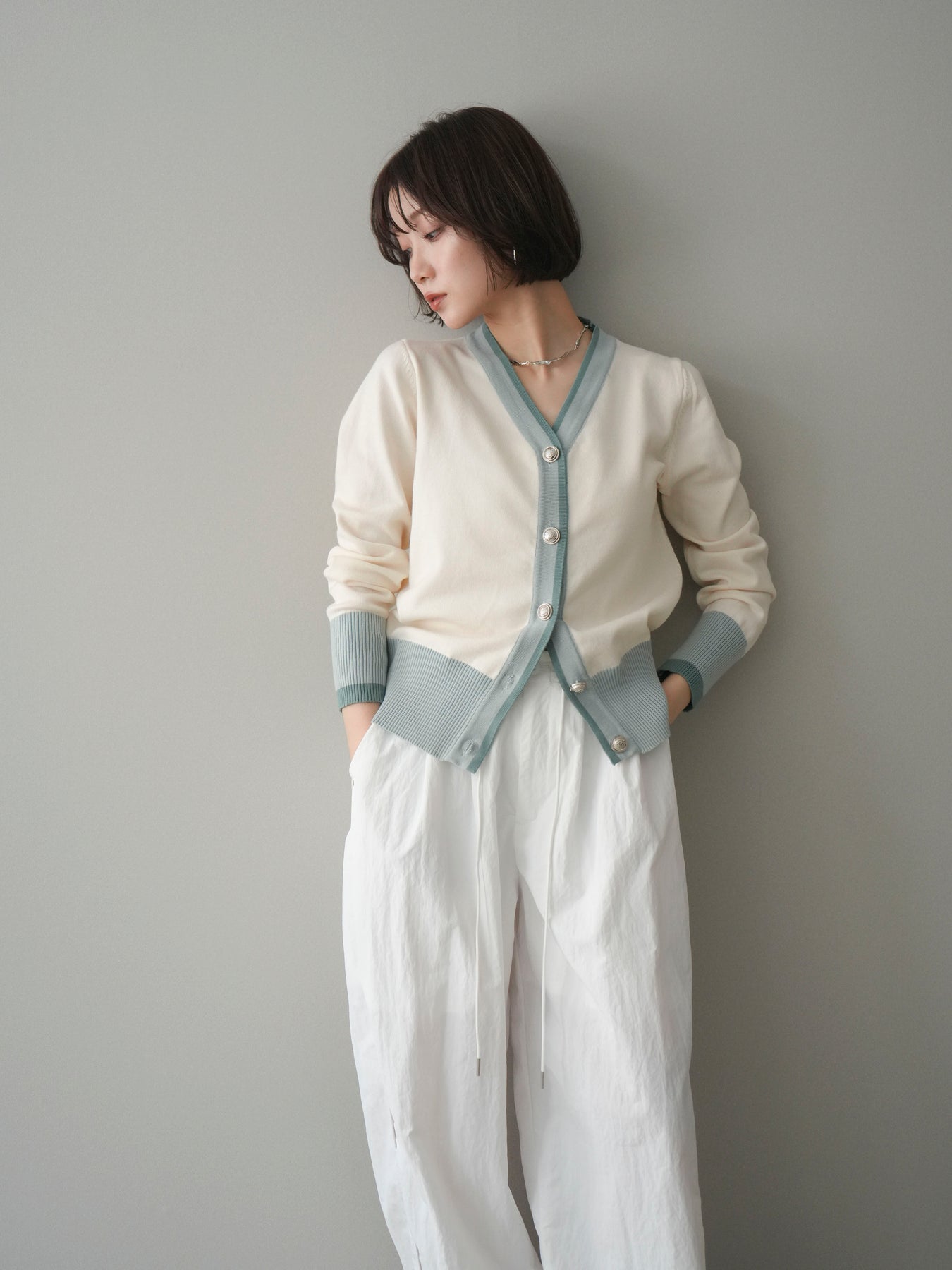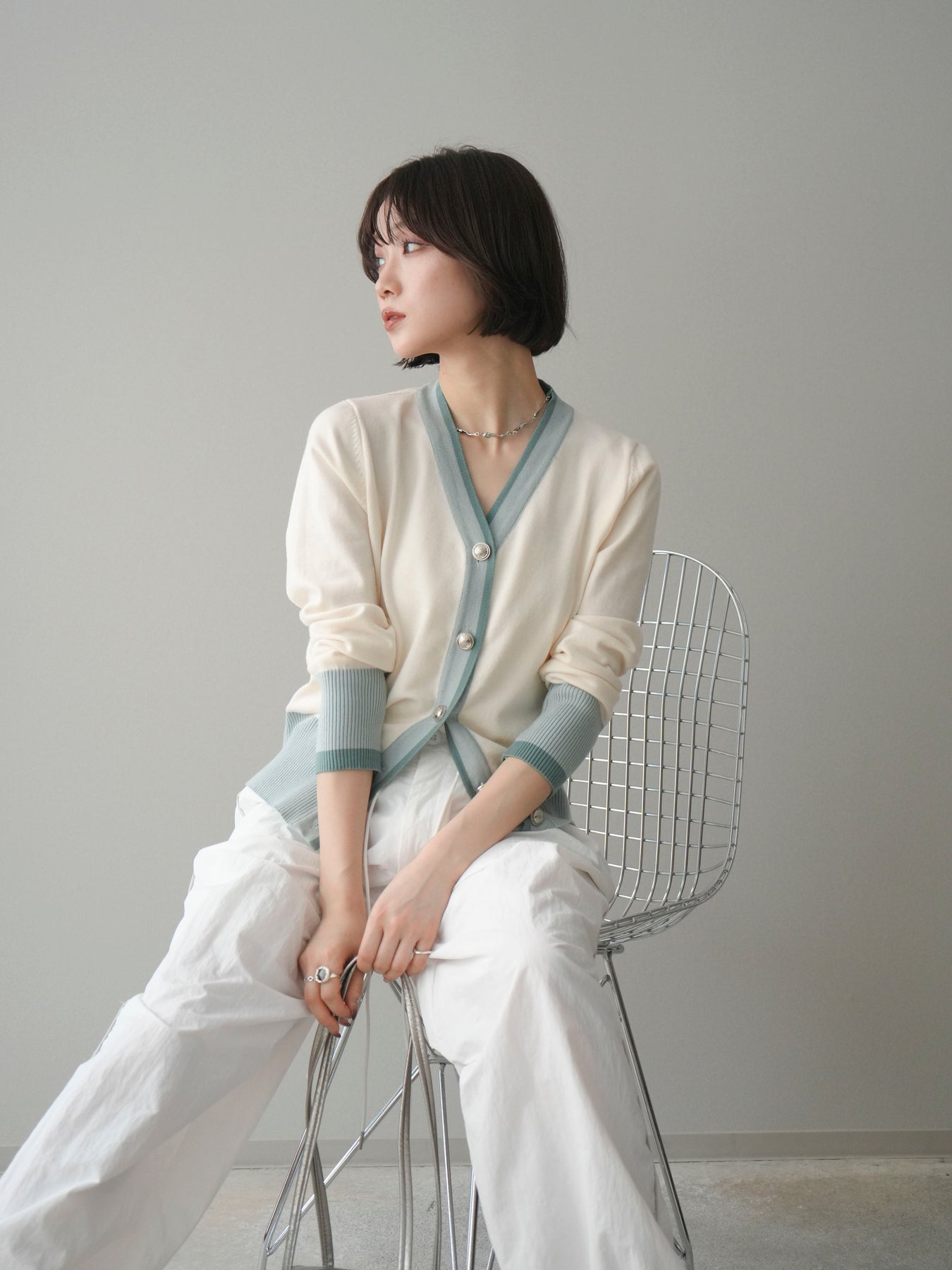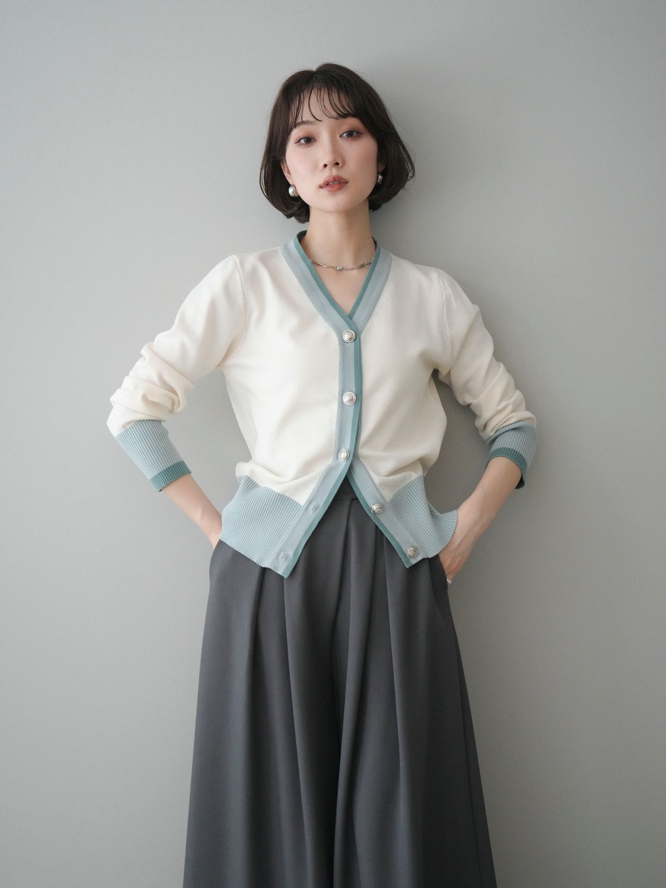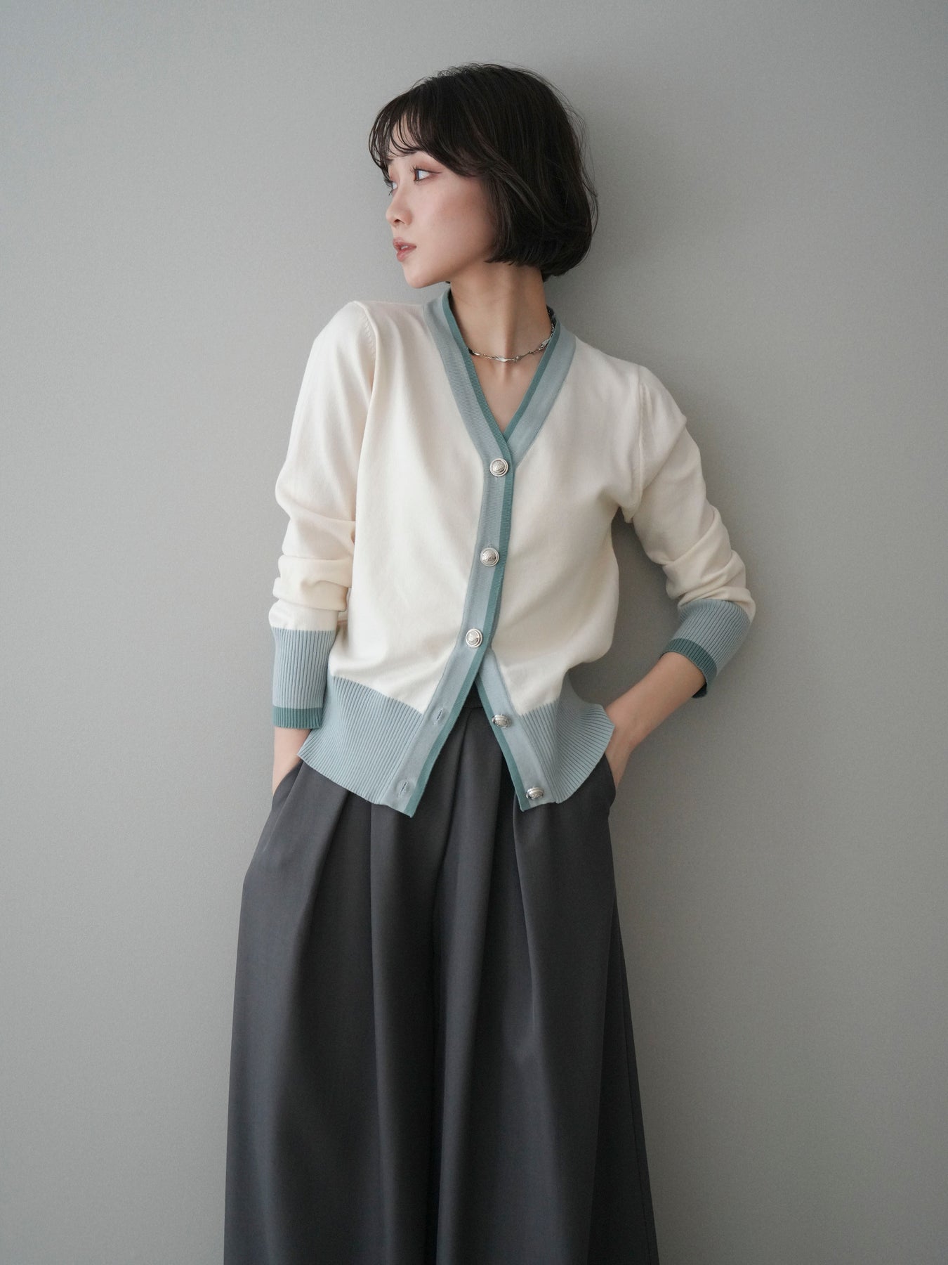 配色ラインとデザイン性のあるボタンが目を惹くVネックニットカーディガン。シンプルなシルエットをベースに、襟元から前立て、裾にかけて施した配色がスタイリングに程よいアクセントを添えます。すっきりとしたVネックが顔まわりをシャープに見せ、前を留めてトップスとしても、羽織りとしてもバランス良く着用可能。きれいめにもカジュアルにも合わせやすく、コーディネートを引き締めてくれる一着です。 ※ボトムス、キャミソール(インナー)以外の商品は一律でインナーは付属していません。