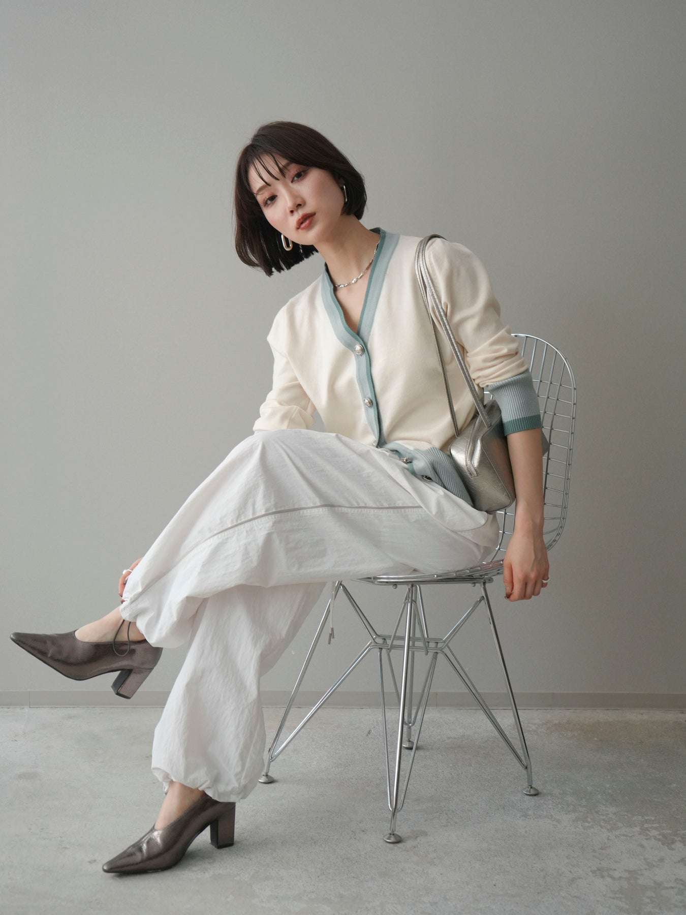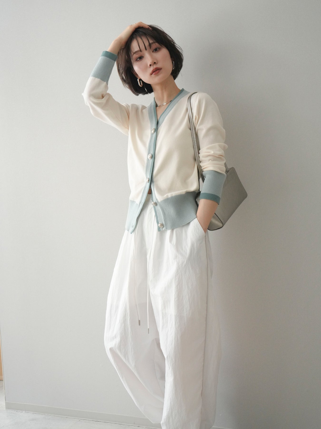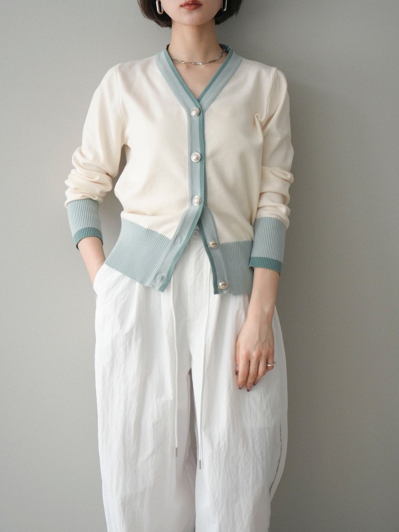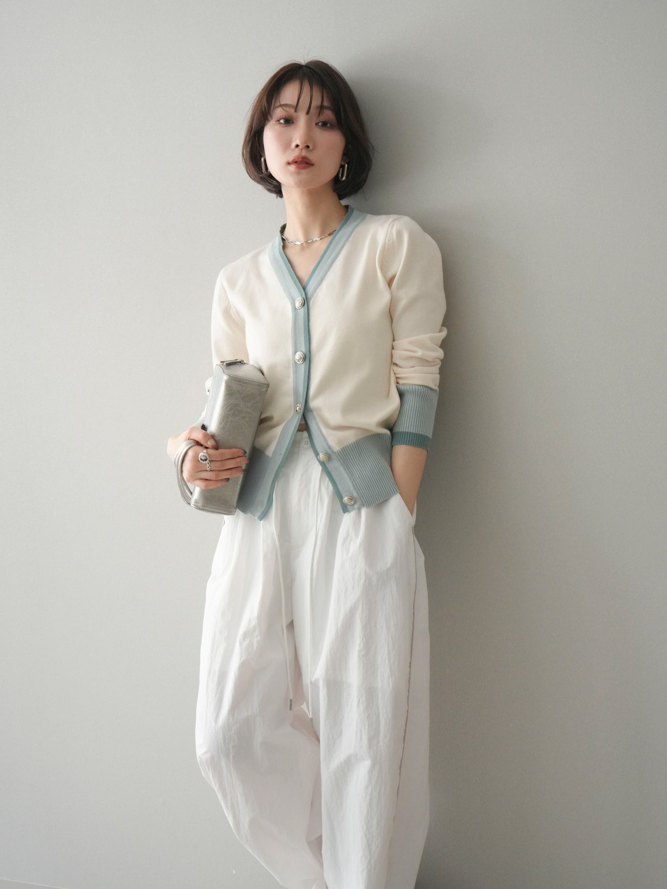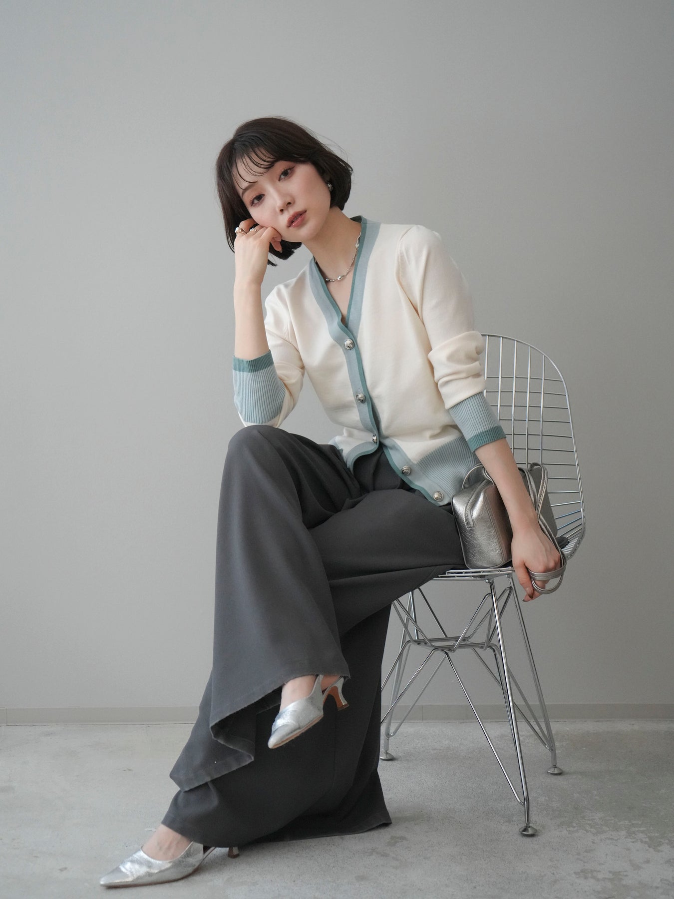 配色ラインとデザイン性のあるボタンが目を惹くVネックニットカーディガン。シンプルなシルエットをベースに、襟元から前立て、裾にかけて施した配色がスタイリングに程よいアクセントを添えます。すっきりとしたVネックが顔まわりをシャープに見せ、前を留めてトップスとしても、羽織りとしてもバランス良く着用可能。きれいめにもカジュアルにも合わせやすく、コーディネートを引き締めてくれる一着です。 ※ボトムス、キャミソール(インナー)以外の商品は一律でインナーは付属していません。