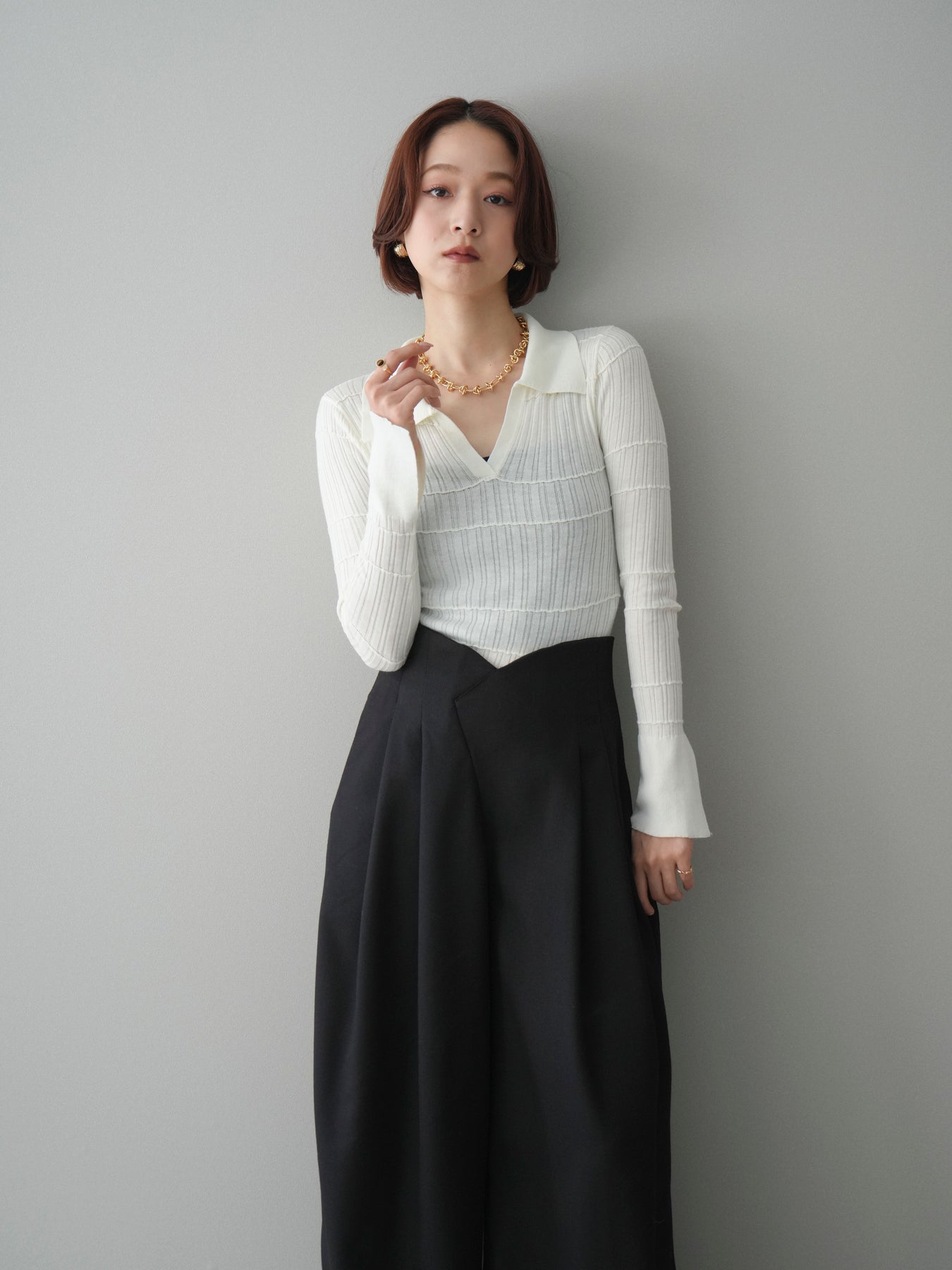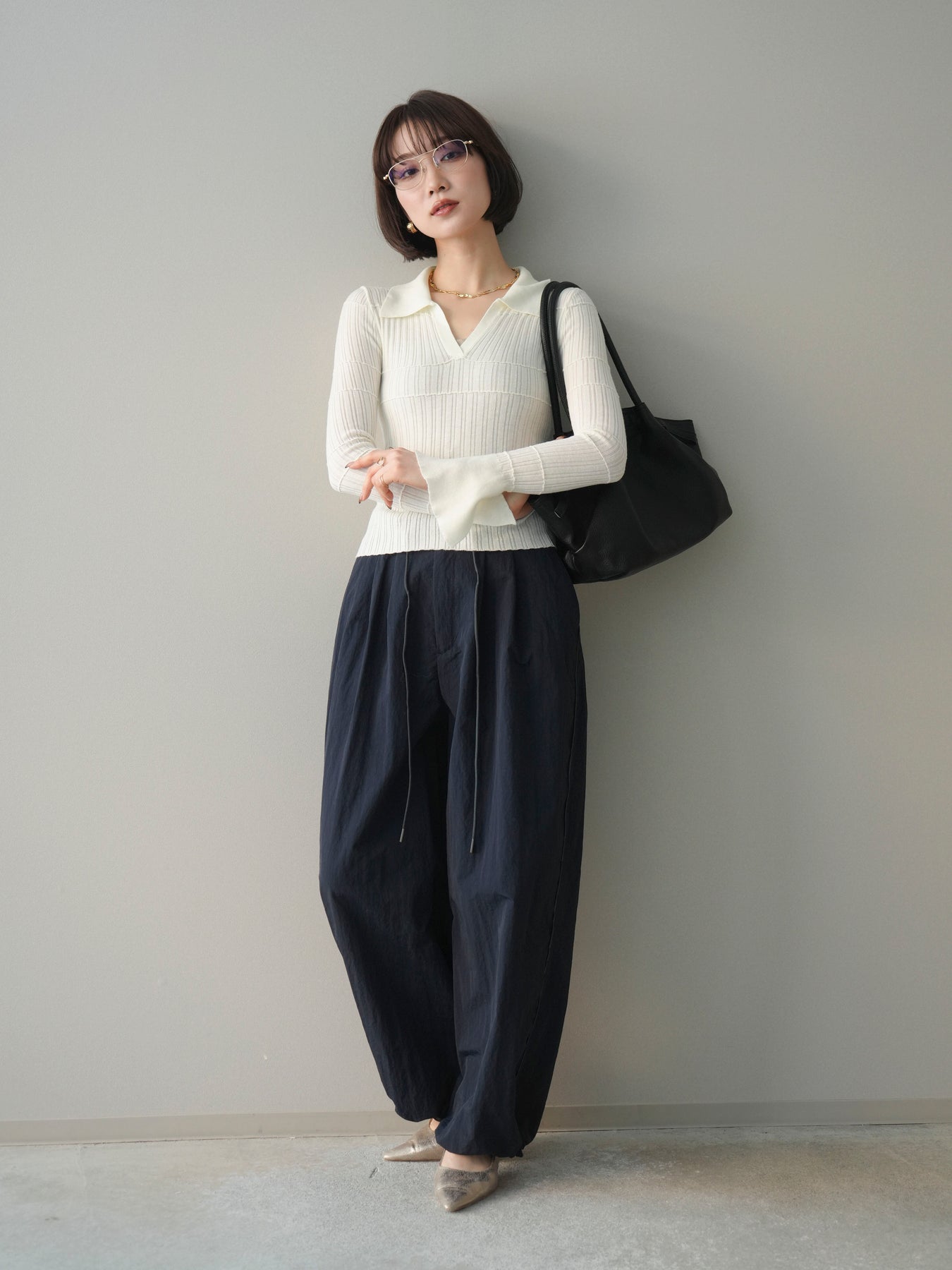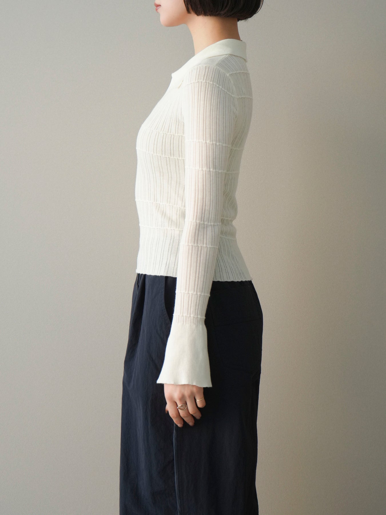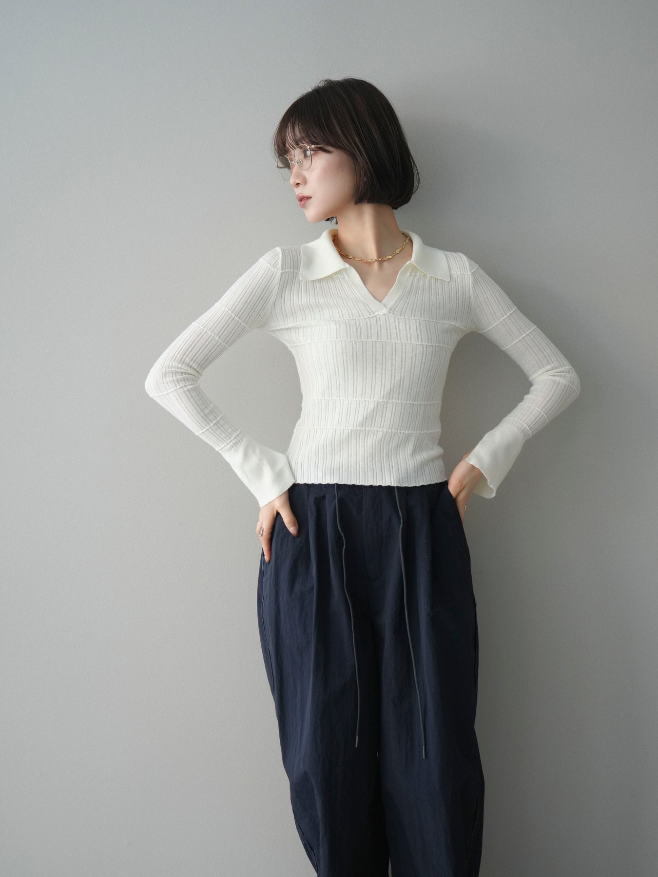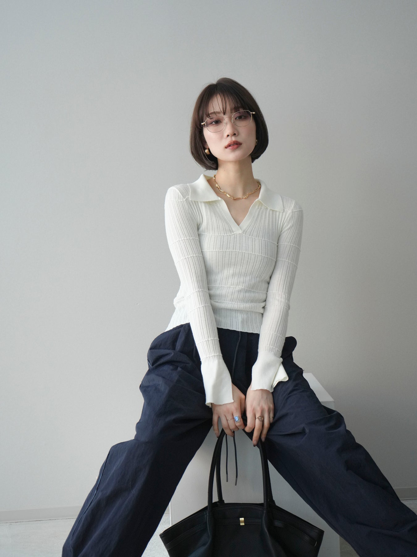 程よい透け感が魅力のシアーリブ素材を使用した、スキッパーデザインのニットトップス。デコルテをすっきりと見せる襟元が抜け感を演出し、女性らしいバランスの取れた印象に仕上げます。縦ラインを強調するリブ編みが、身体のラインをきれいに見せつつ、軽やかな着心地もポイント。1枚ではもちろん、ジャケットやカーディガンのインナーとしても活躍し、きれいめからカジュアルまで幅広いスタイリングに取り入れやすい一着です。 ※ボトムス、キャミソール(インナー)以外の商品は一律でインナーは付属していません。