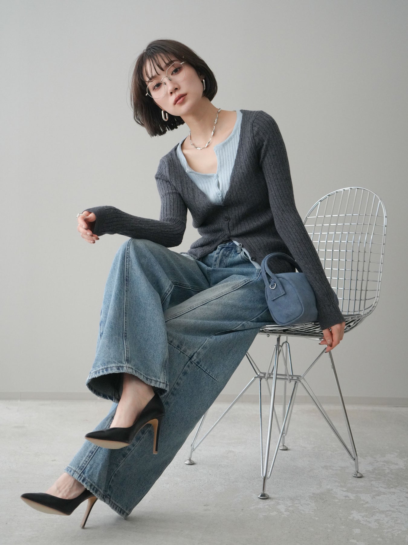 レイヤード風のバイカラーデザインが目を惹くニットカーディガン。異なる表情のニットを重ねたような配色が、シンプルな着こなしにも奥行きと立体感をプラスします。程よくフィットするリブ編みが縦のラインを強調し、すっきりとした印象に。前を留めてトップスとして着用しても、羽織りとしてもバランス良く決まり、デニムからスカートまで幅広いボトムスと相性の良い一着です。デイリーからお出かけまで活躍します。 ※ボトムス、キャミソール(インナー)以外の商品は一律でインナーは付属していません。
