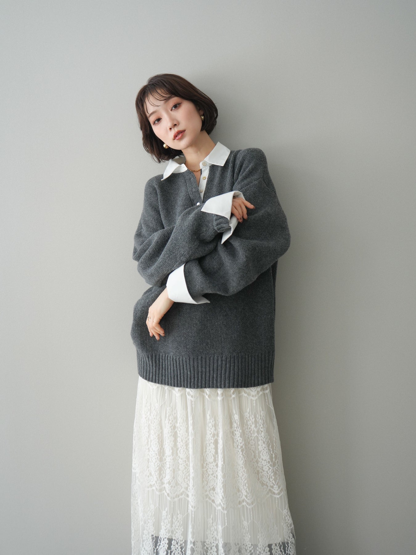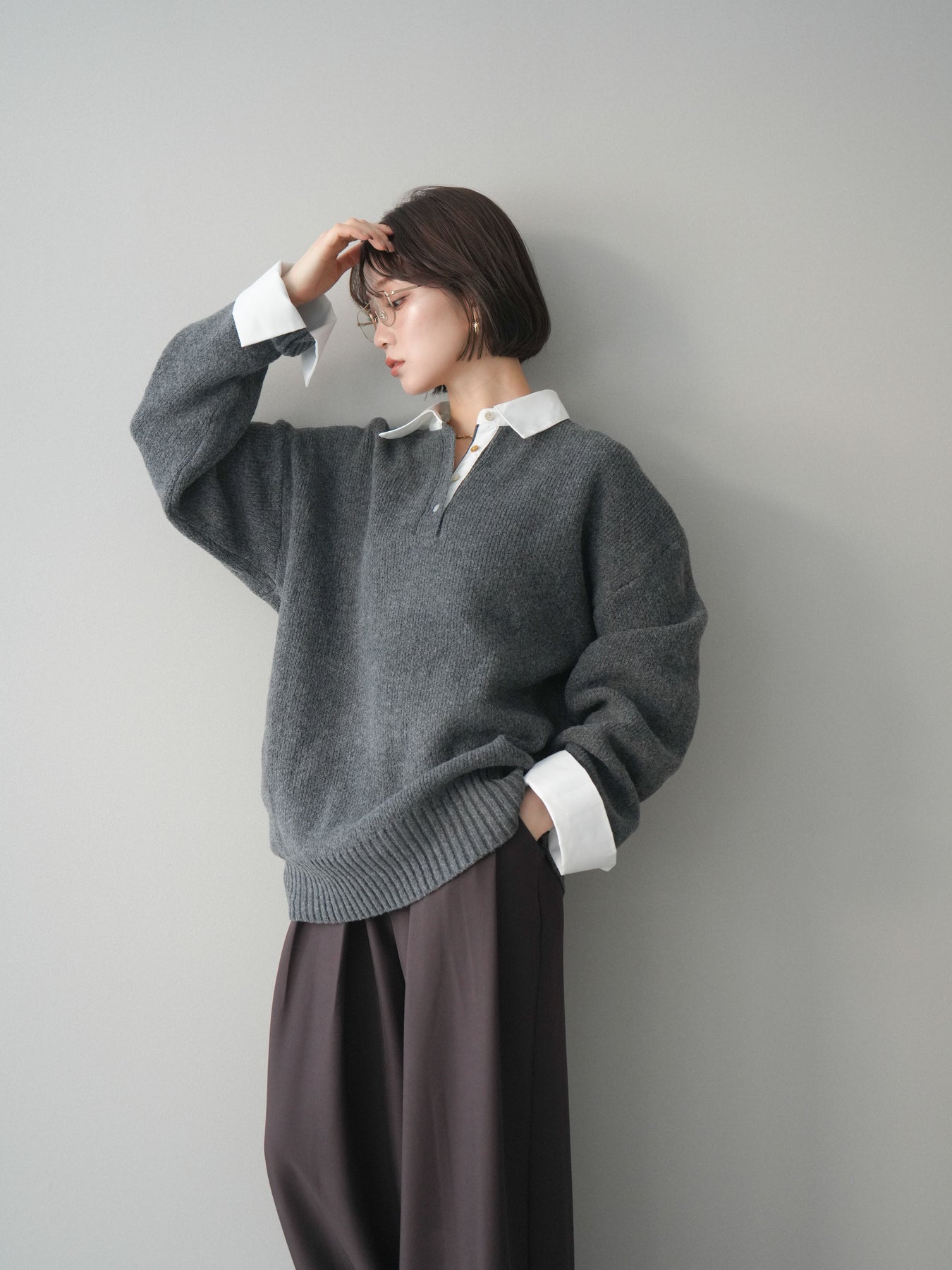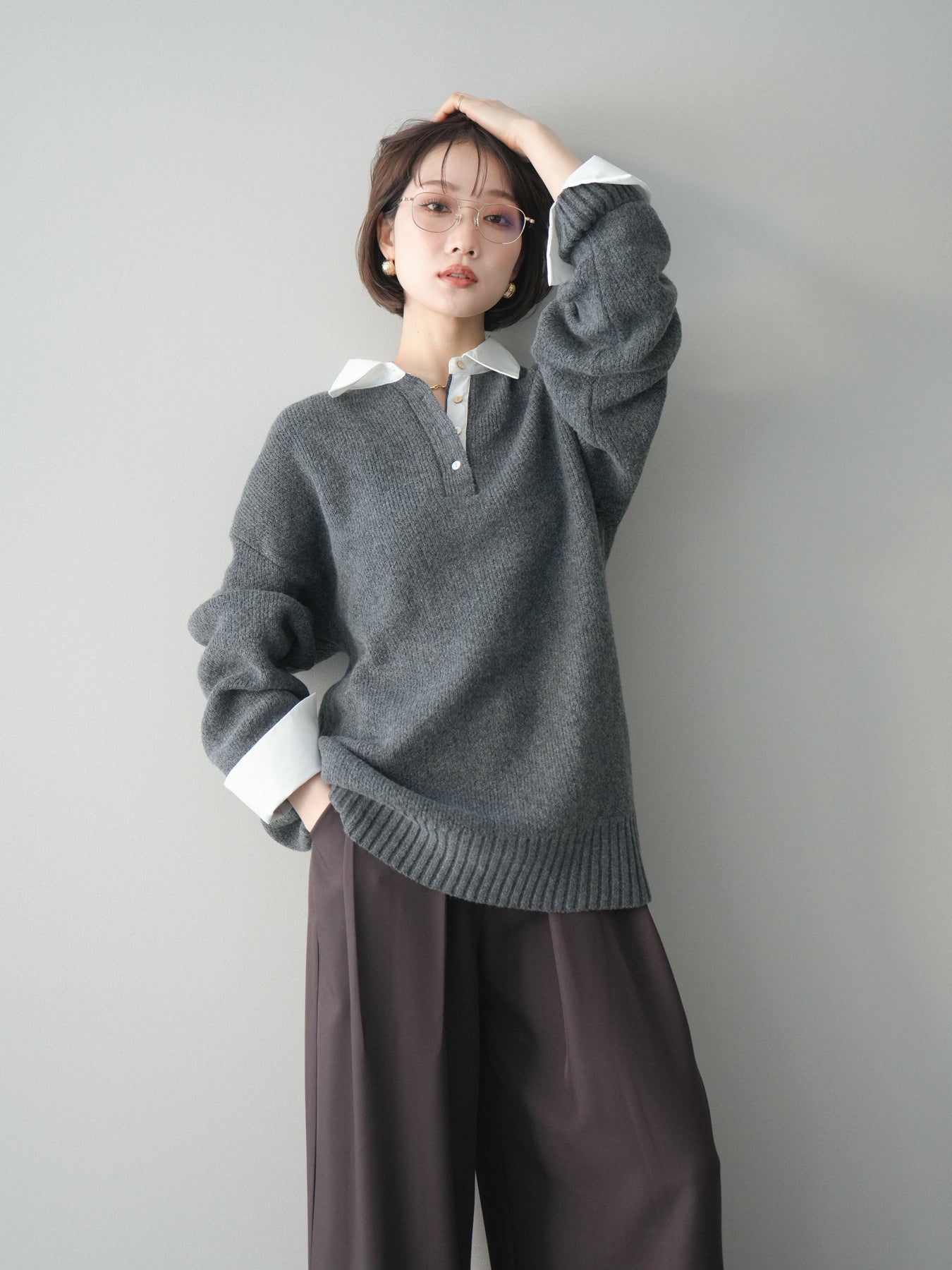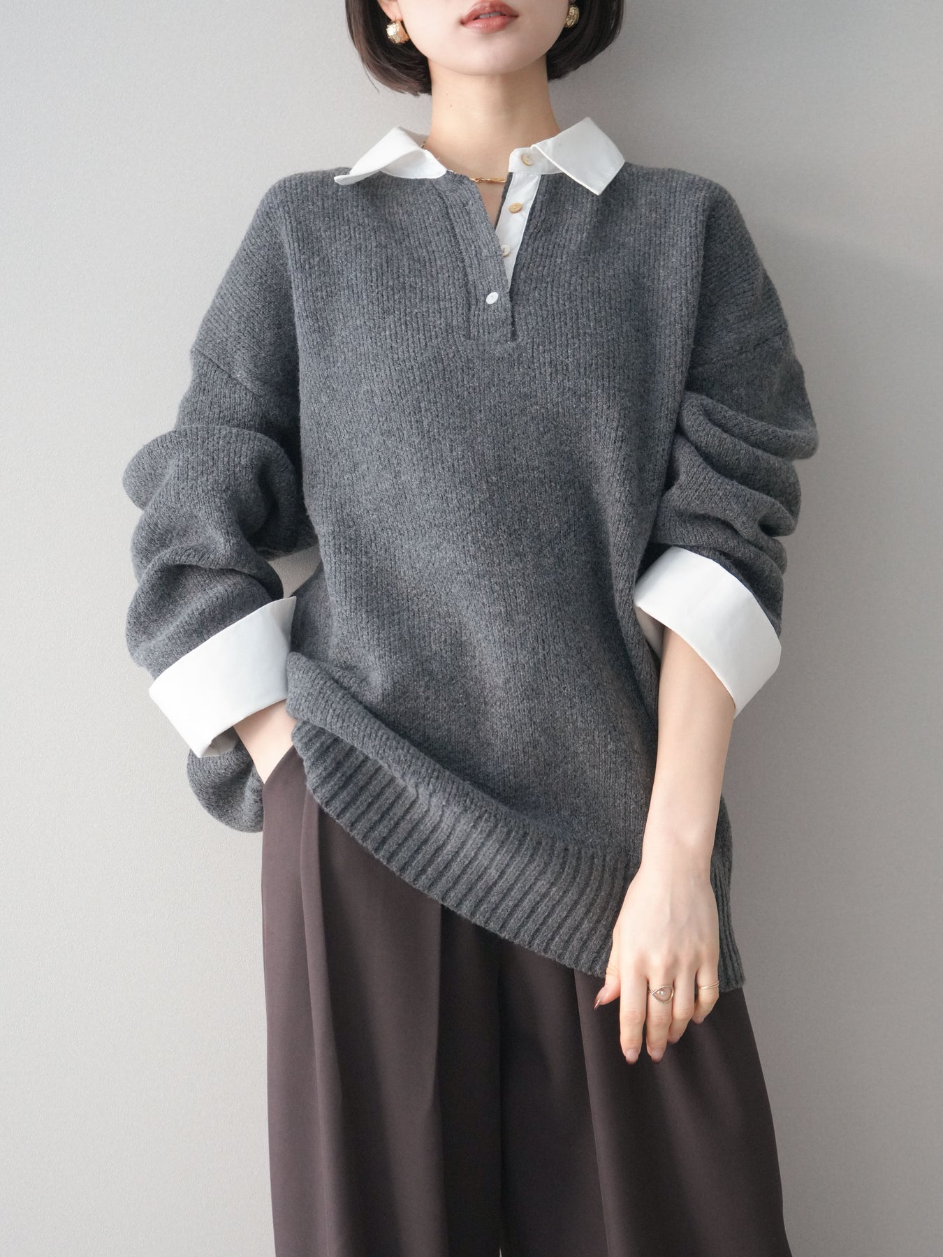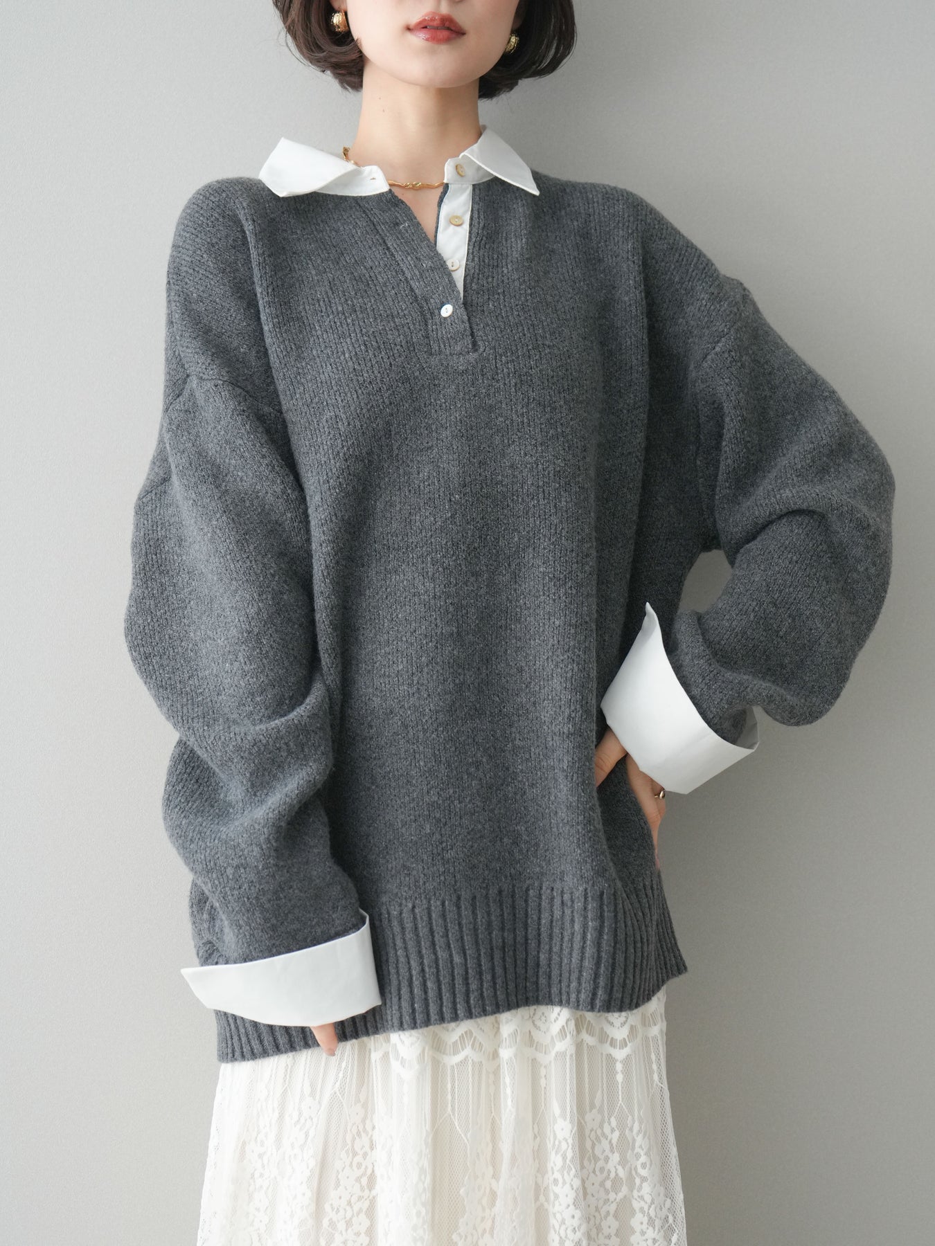 シャツを重ねたようなデザインが特徴の、ドッキング仕様オーバーニットプルオーバー。襟元や袖口、裾から覗くシャツディテールが、ニットスタイルに程よいきちんと感と抜け感をプラスします。ゆったりとしたオーバーシルエットで体のラインを拾いにくく、リラックス感のある着心地も魅力。1枚でレイヤード風の着こなしが完成し、パンツにもスカートにも合わせやすく、デイリーからお出かけまで幅広く活躍する一着です。 ※ボトムス、キャミソール(インナー)以外の商品は一律でインナーは付属していません。