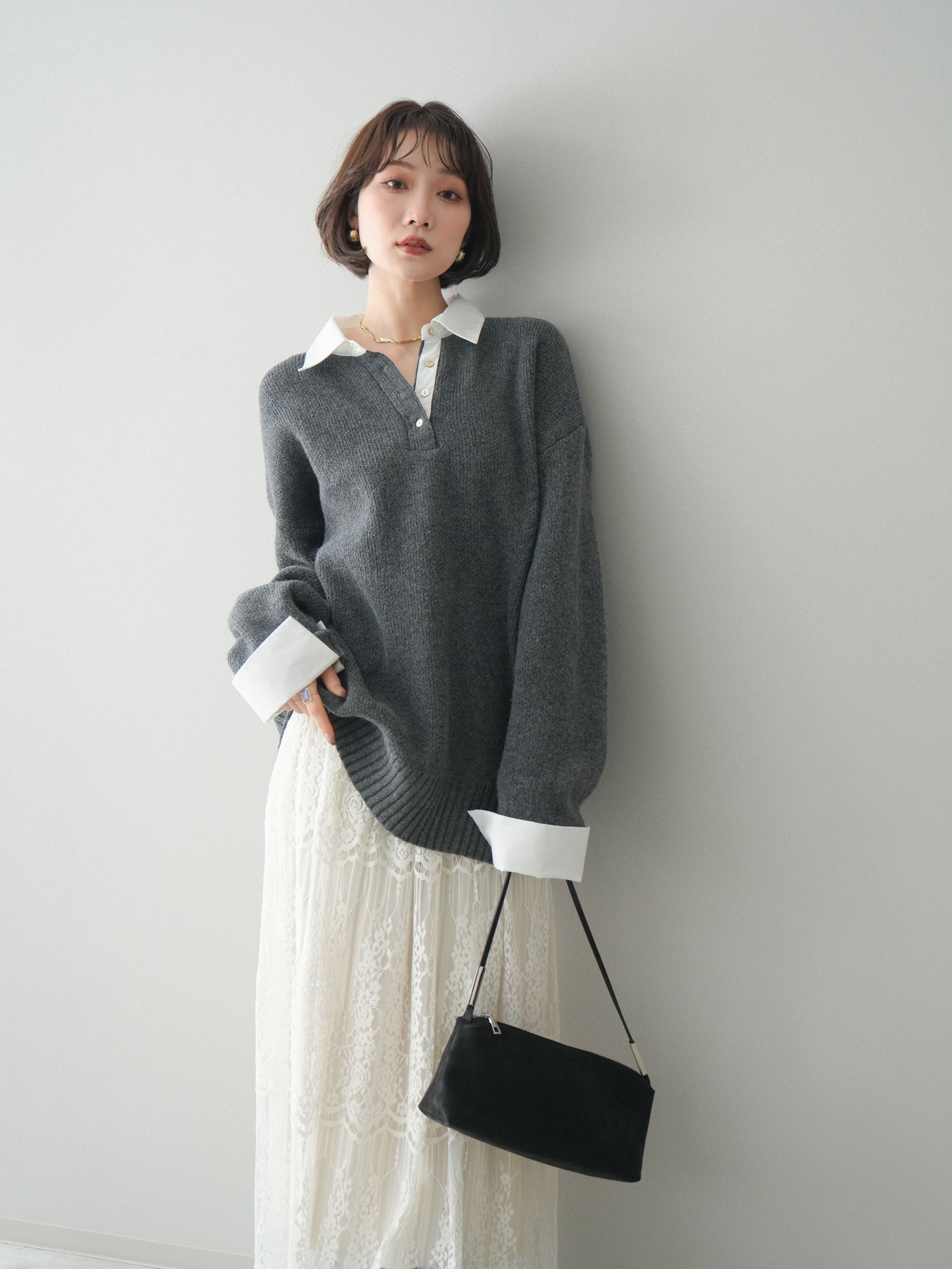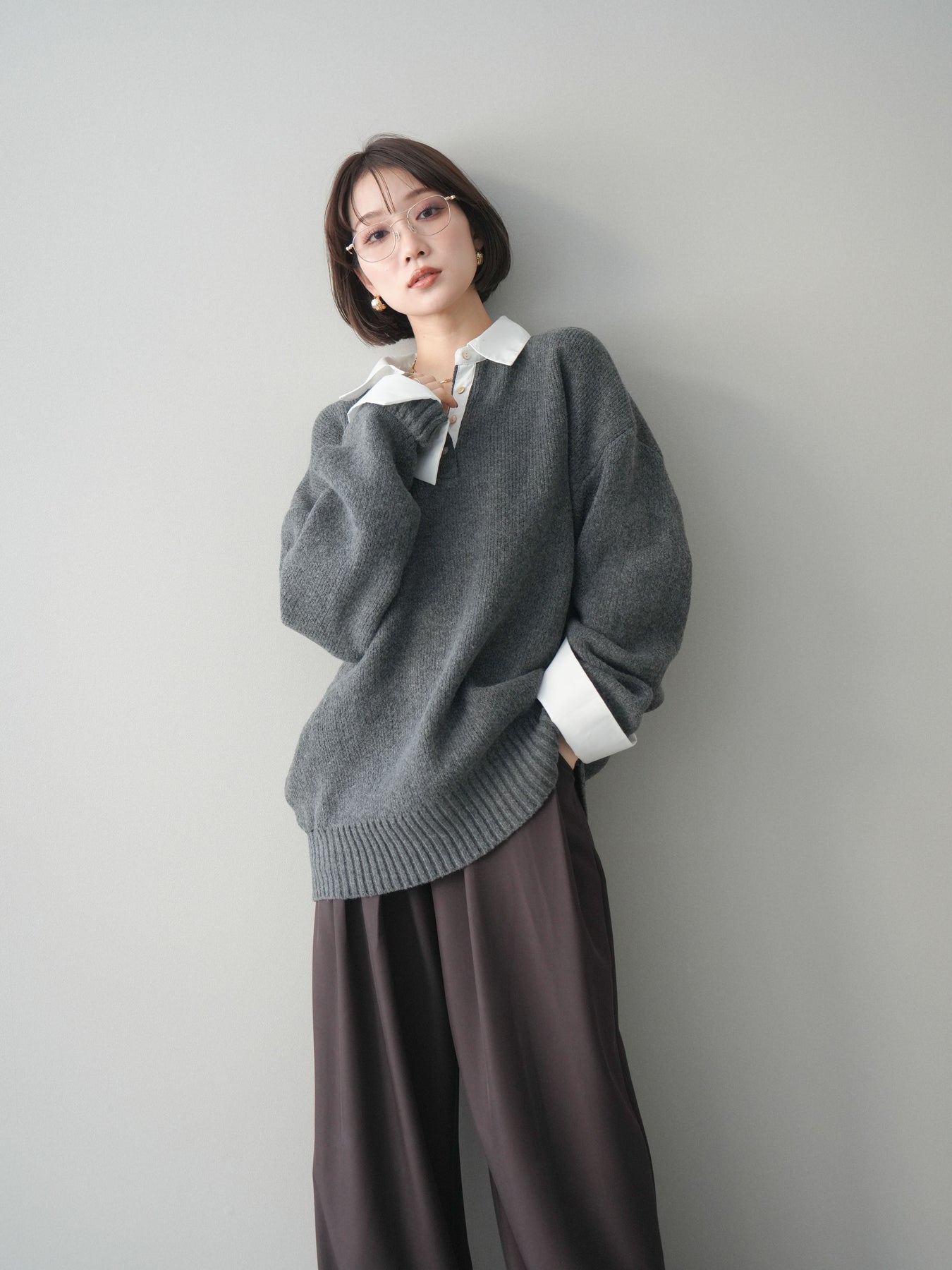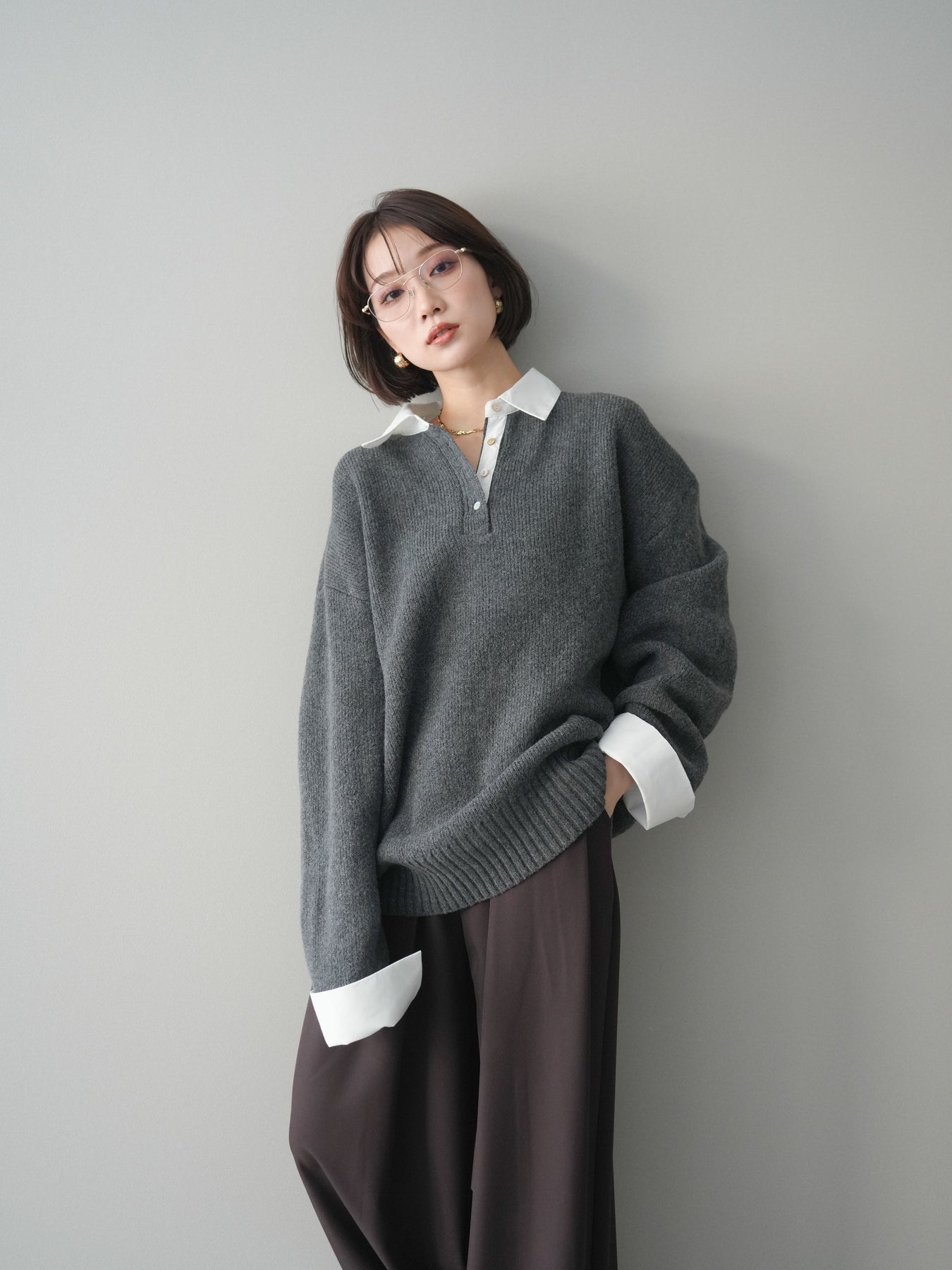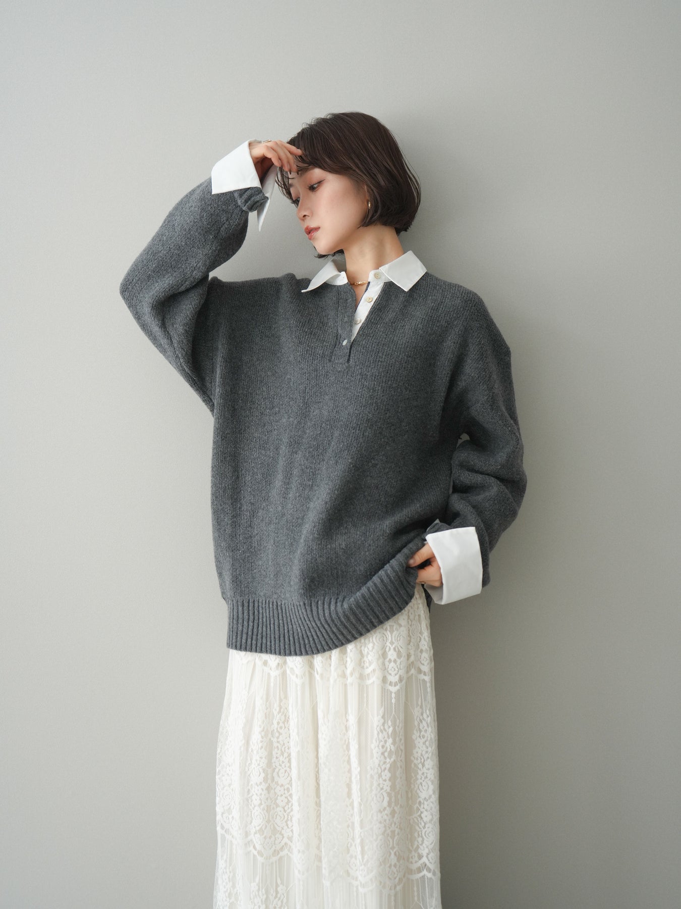 シャツを重ねたようなデザインが特徴の、ドッキング仕様オーバーニットプルオーバー。襟元や袖口、裾から覗くシャツディテールが、ニットスタイルに程よいきちんと感と抜け感をプラスします。ゆったりとしたオーバーシルエットで体のラインを拾いにくく、リラックス感のある着心地も魅力。1枚でレイヤード風の着こなしが完成し、パンツにもスカートにも合わせやすく、デイリーからお出かけまで幅広く活躍する一着です。 ※ボトムス、キャミソール(インナー)以外の商品は一律でインナーは付属していません。