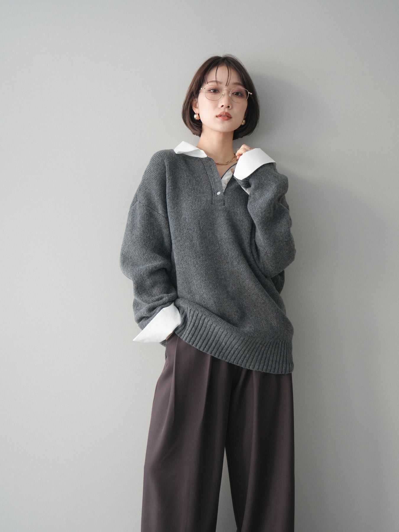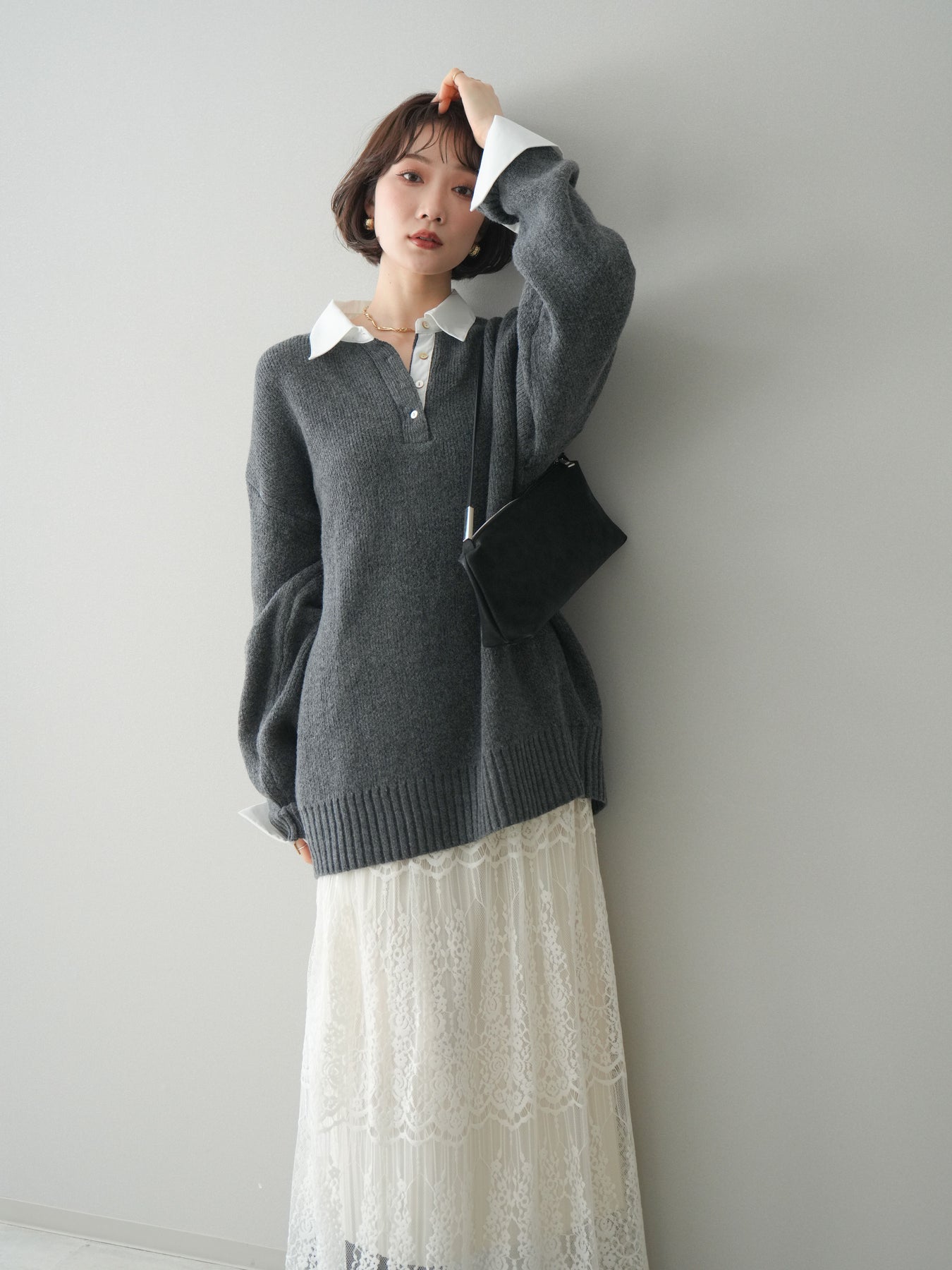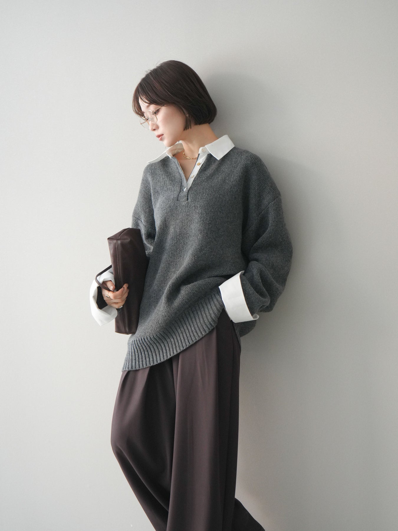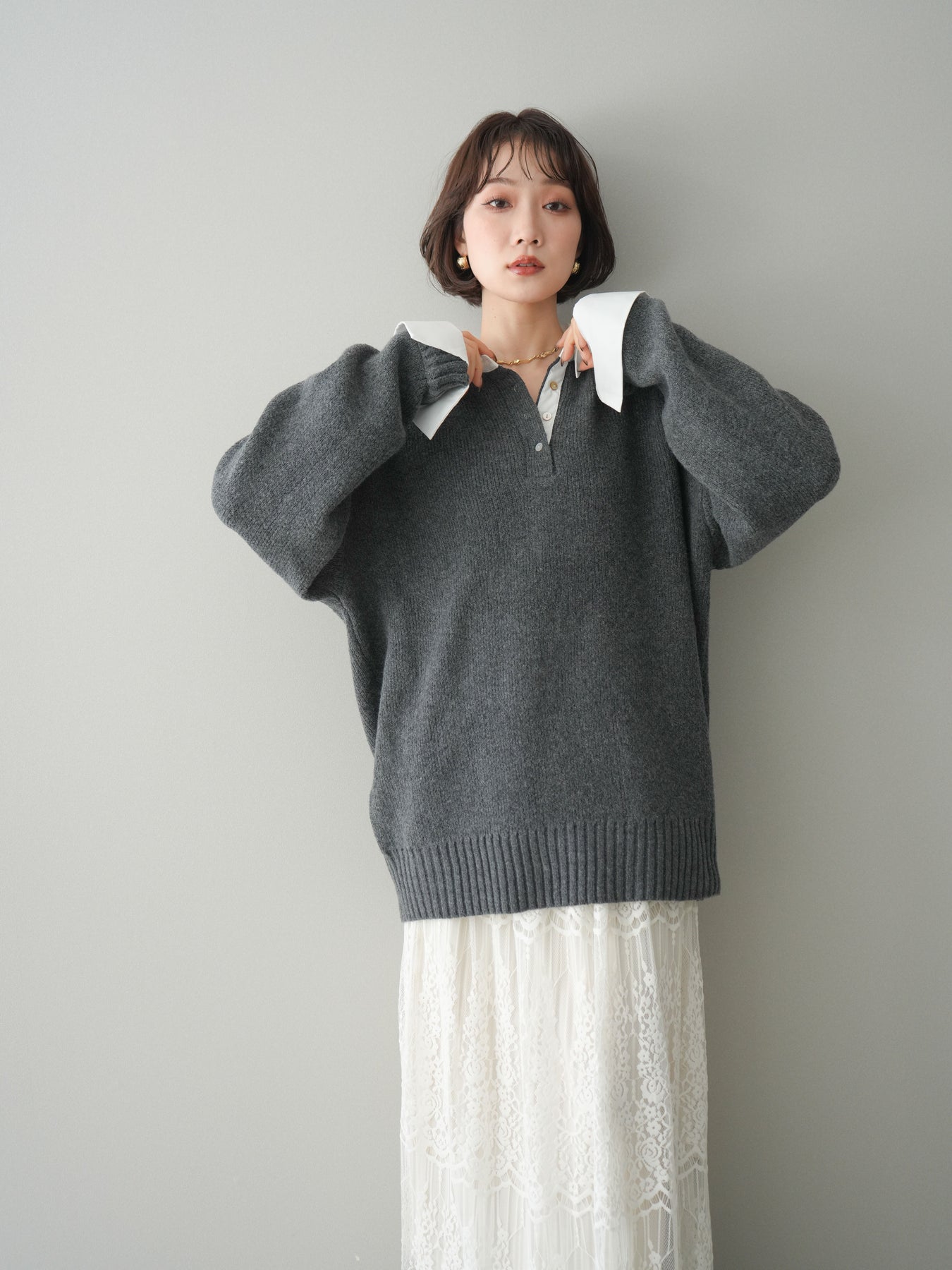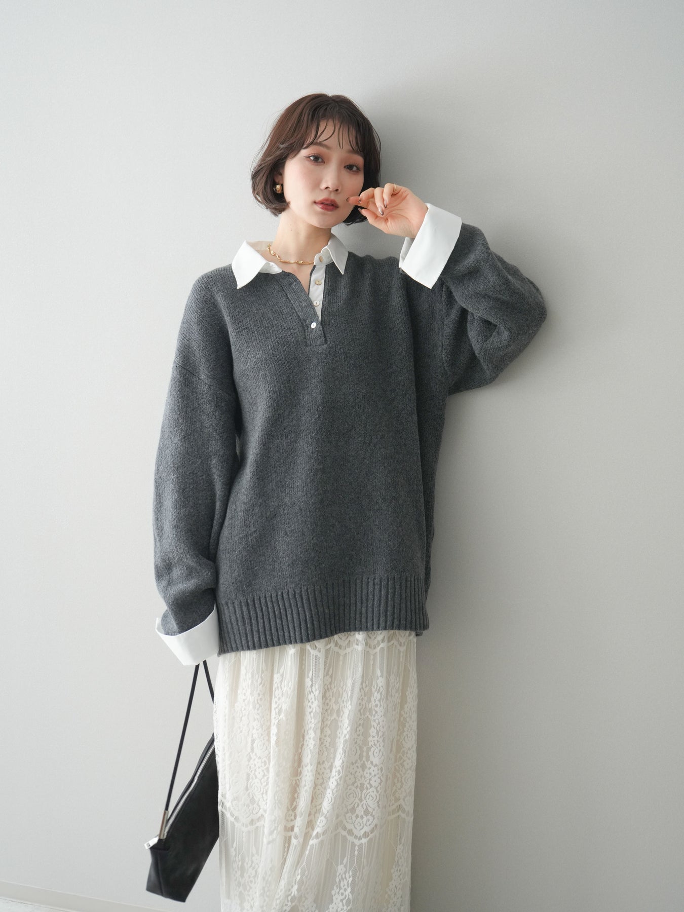 シャツを重ねたようなデザインが特徴の、ドッキング仕様オーバーニットプルオーバー。襟元や袖口、裾から覗くシャツディテールが、ニットスタイルに程よいきちんと感と抜け感をプラスします。ゆったりとしたオーバーシルエットで体のラインを拾いにくく、リラックス感のある着心地も魅力。1枚でレイヤード風の着こなしが完成し、パンツにもスカートにも合わせやすく、デイリーからお出かけまで幅広く活躍する一着です。 ※ボトムス、キャミソール(インナー)以外の商品は一律でインナーは付属していません。