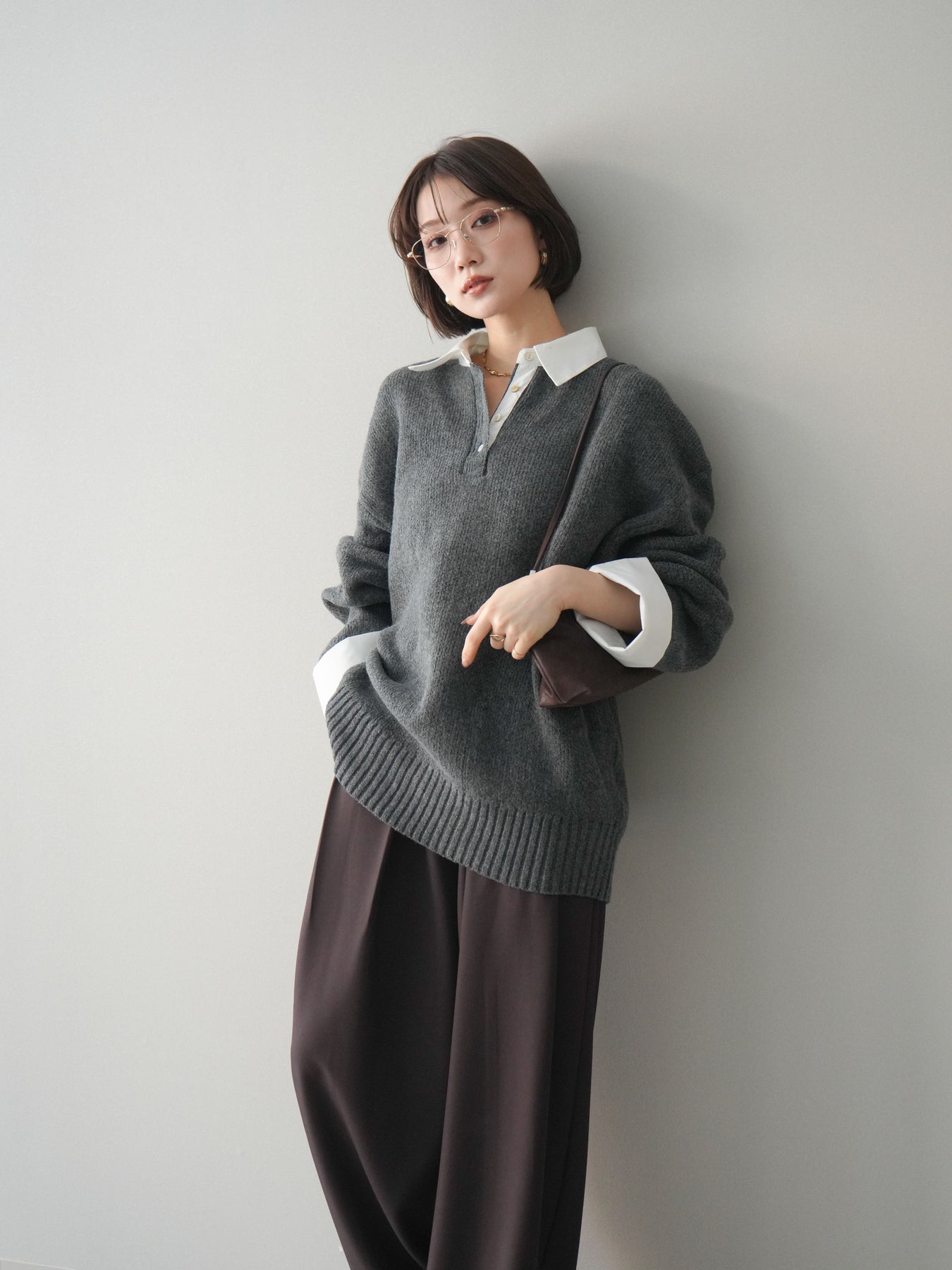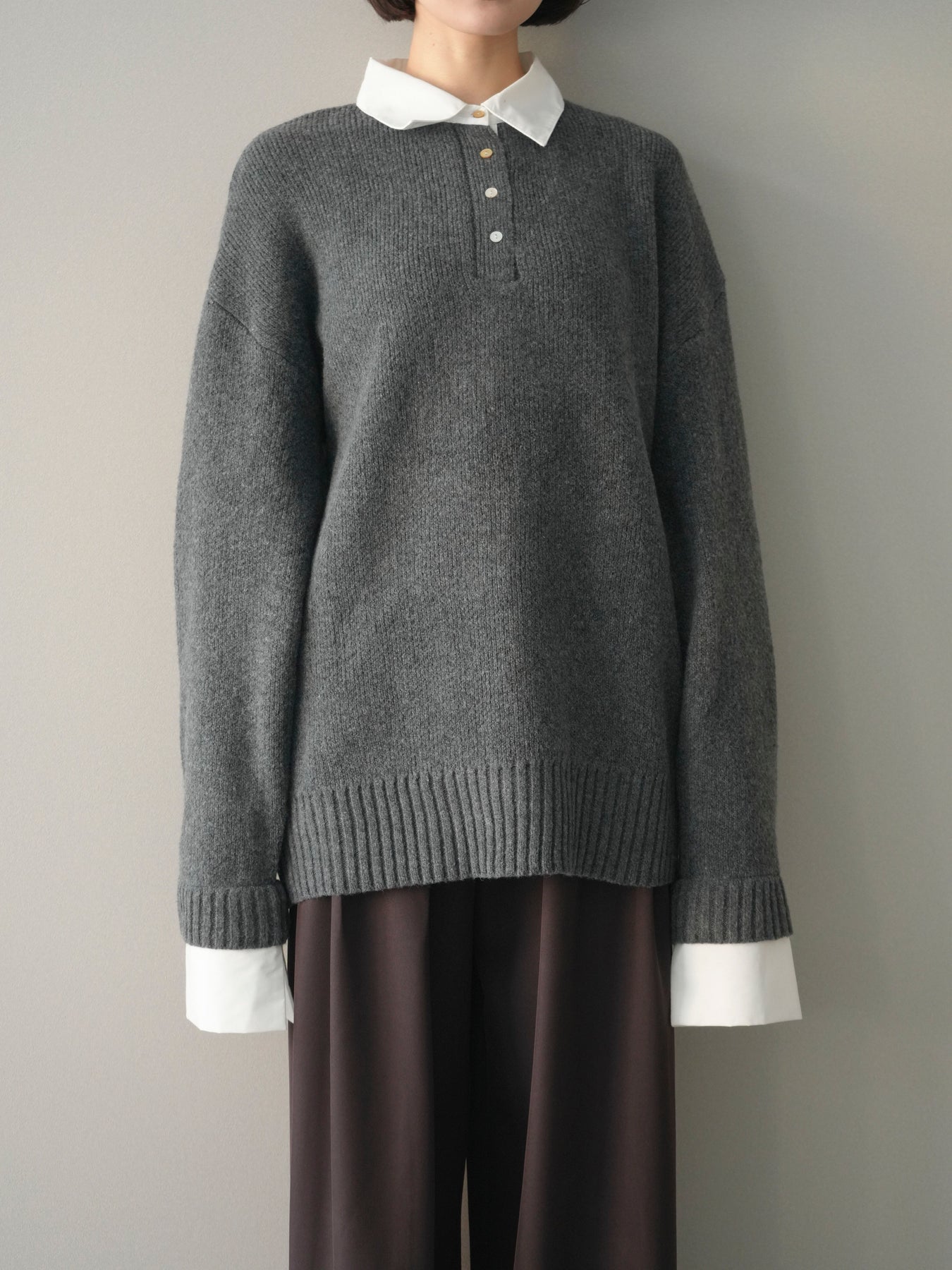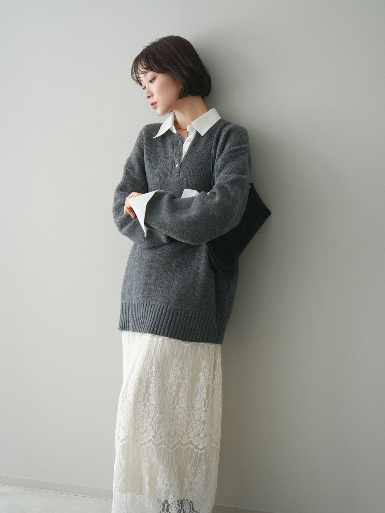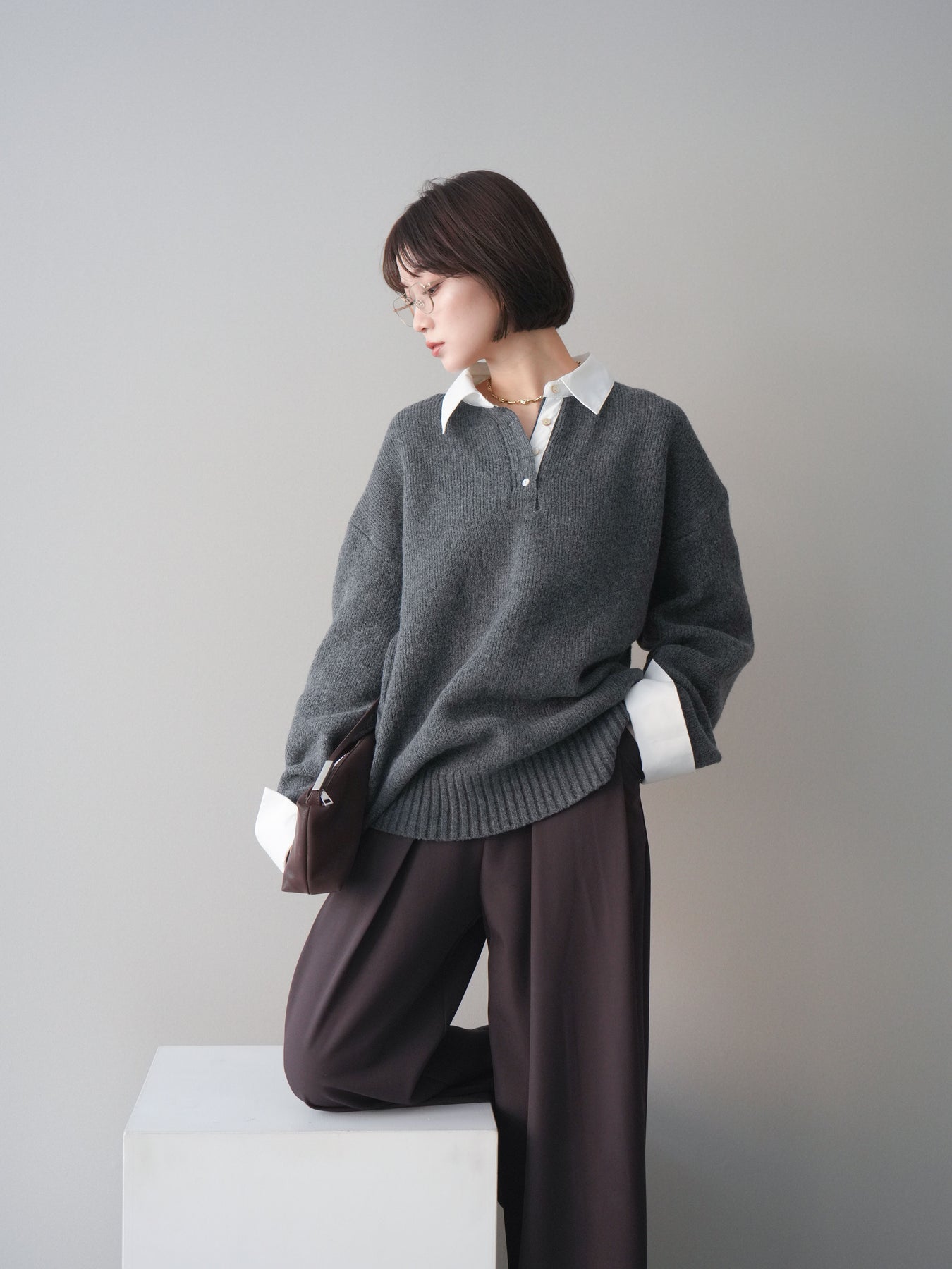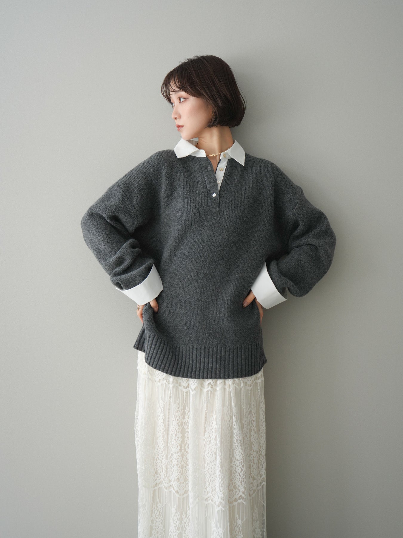 シャツを重ねたようなデザインが特徴の、ドッキング仕様オーバーニットプルオーバー。襟元や袖口、裾から覗くシャツディテールが、ニットスタイルに程よいきちんと感と抜け感をプラスします。ゆったりとしたオーバーシルエットで体のラインを拾いにくく、リラックス感のある着心地も魅力。1枚でレイヤード風の着こなしが完成し、パンツにもスカートにも合わせやすく、デイリーからお出かけまで幅広く活躍する一着です。 ※ボトムス、キャミソール(インナー)以外の商品は一律でインナーは付属していません。