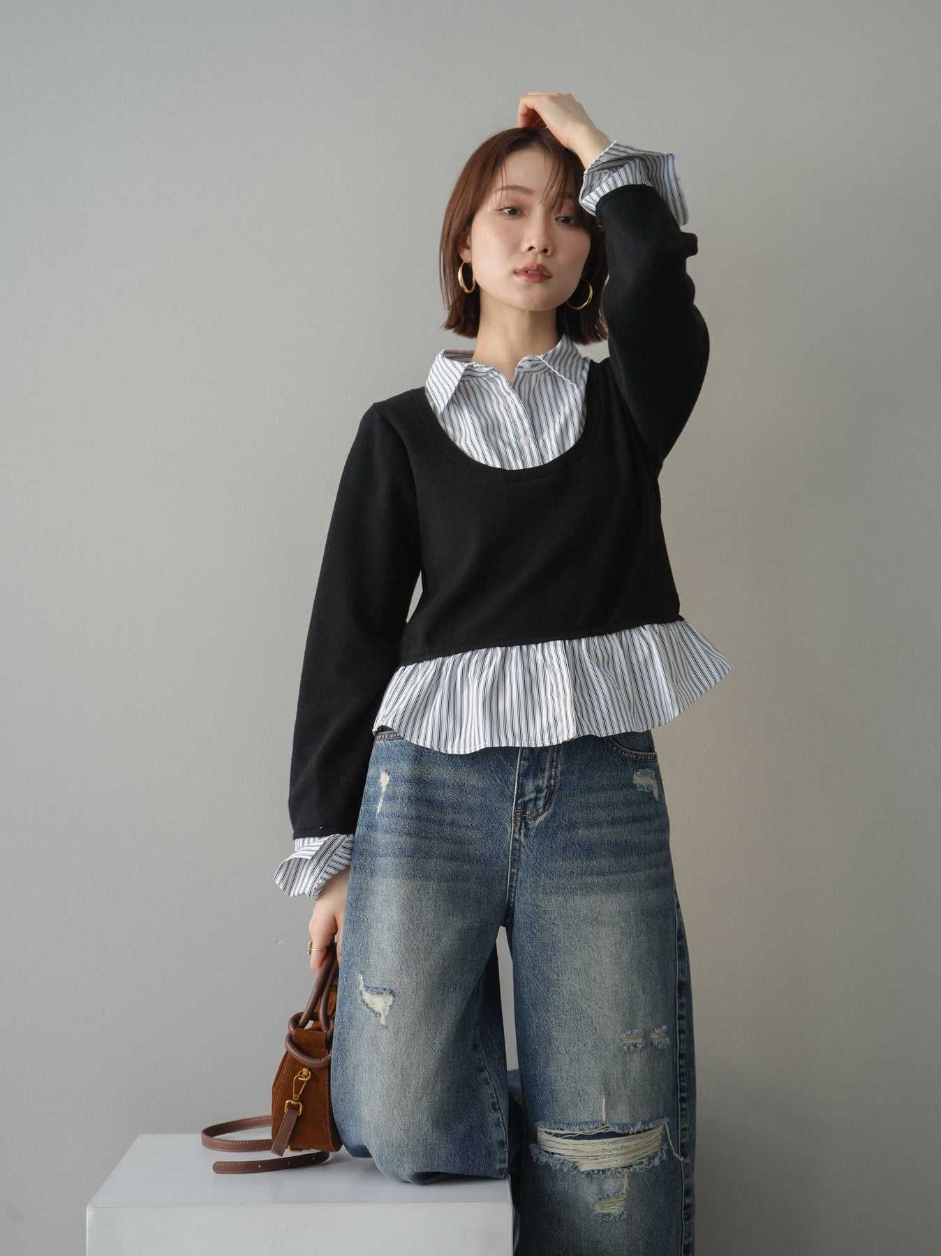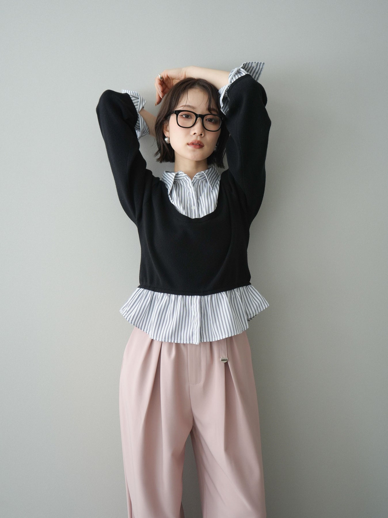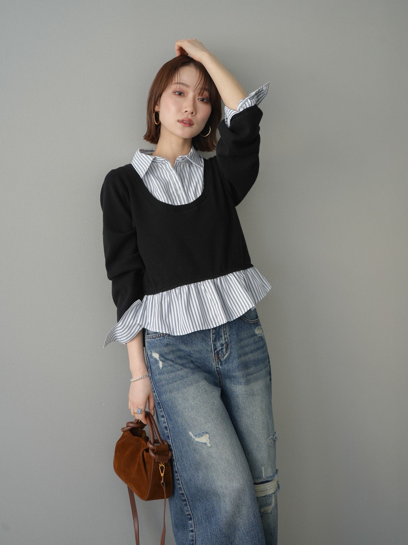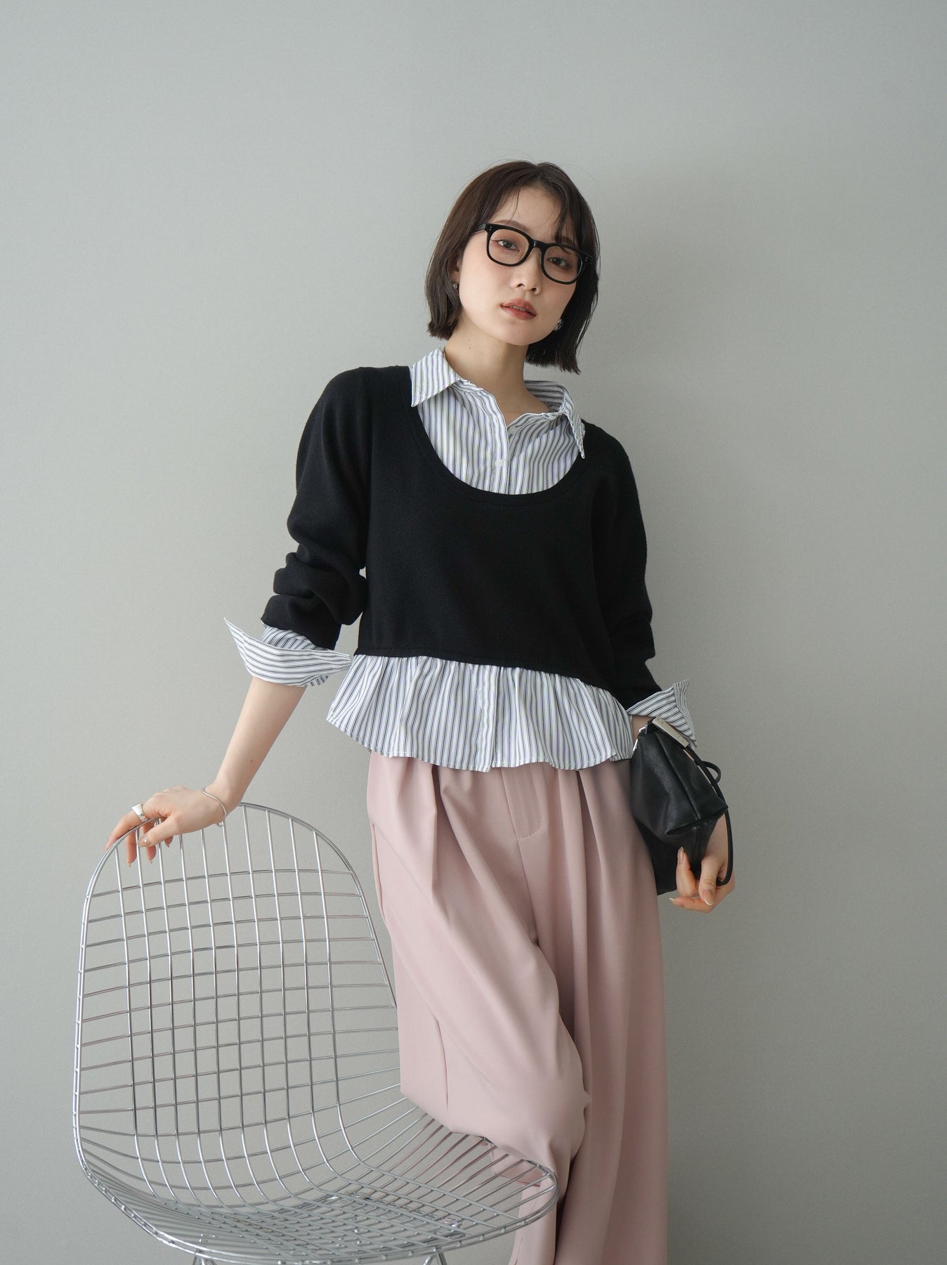 クルーネックニットにストライプシャツをレイヤードしたようなデザインが魅力のドッキングニット。コンパクトなニット部分と、裾や袖口からのぞくシャツ地のバランスが程よい抜け感を演出します。一枚でスタイリングが完成し、きれいめにもカジュアルにも着回せる万能アイテム。デニムやスラックスはもちろん、スカート合わせもおすすめです。 ※ボトムス、キャミソール(インナー)以外の商品は一律でインナーは付属していません