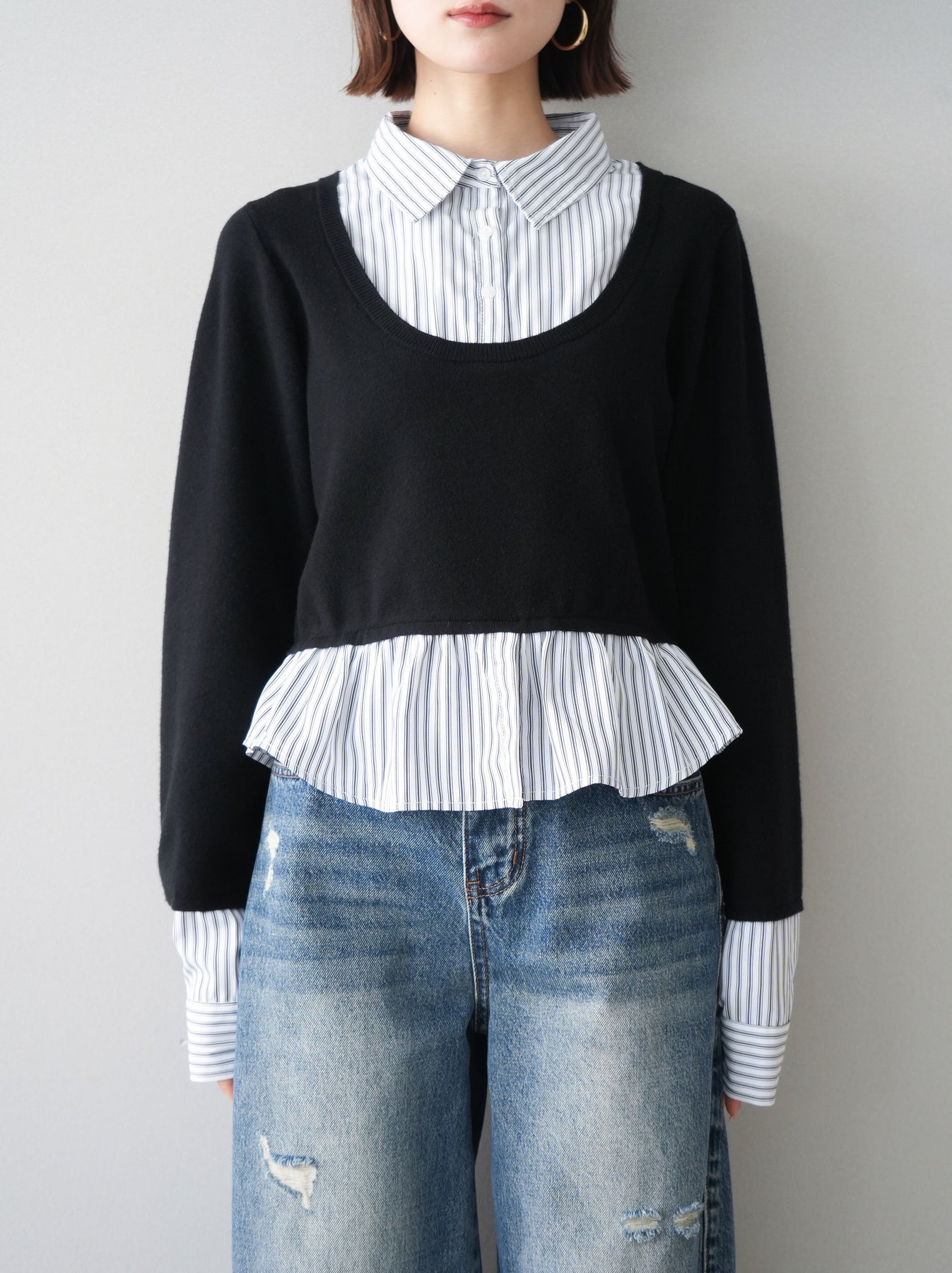 [予約]ストライプシャツUネックドッキングニットプルオーバー/blackoffstripe