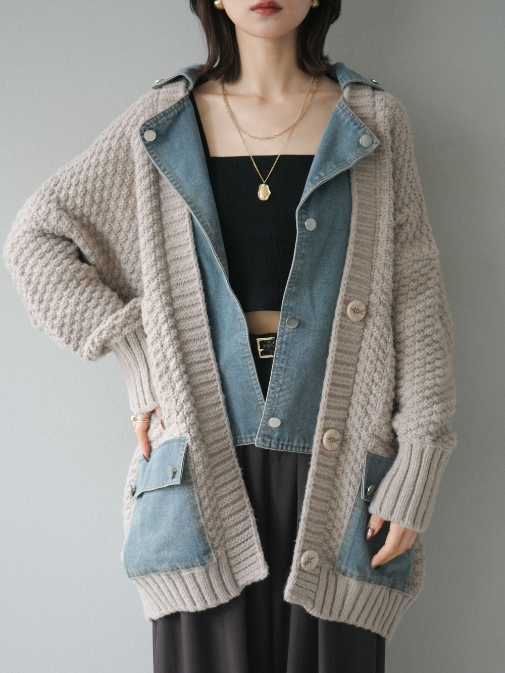 [予約]デニム襟レイヤードニットジャケット/gray
