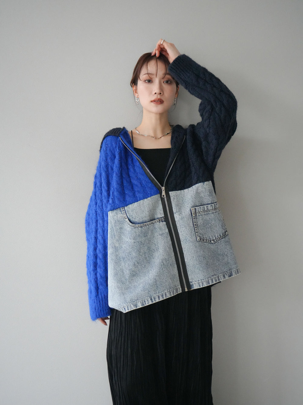 [予約]デニム×バイカラーニットZIPフーディ/blue