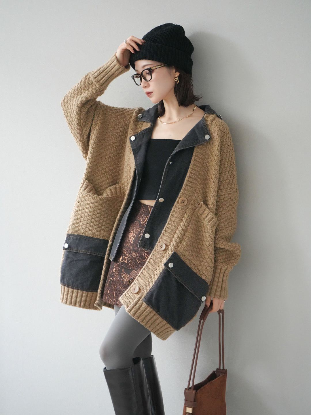 [予約]デニム×バイカラーニットZIPフーディ/brown