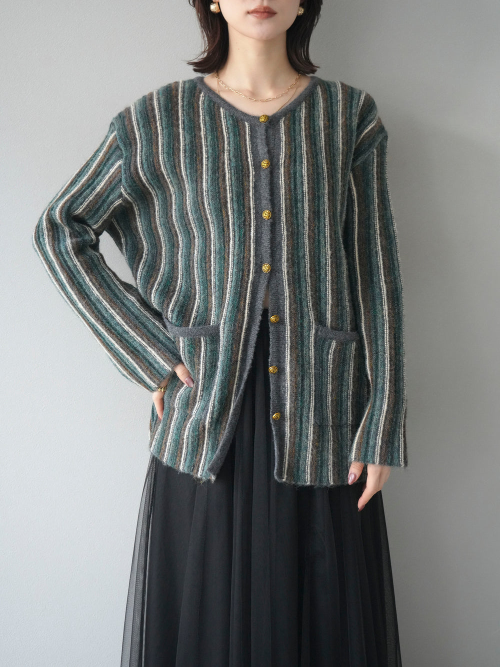 [予約]アンティークボタンストライプニットカーディガン/charcoal