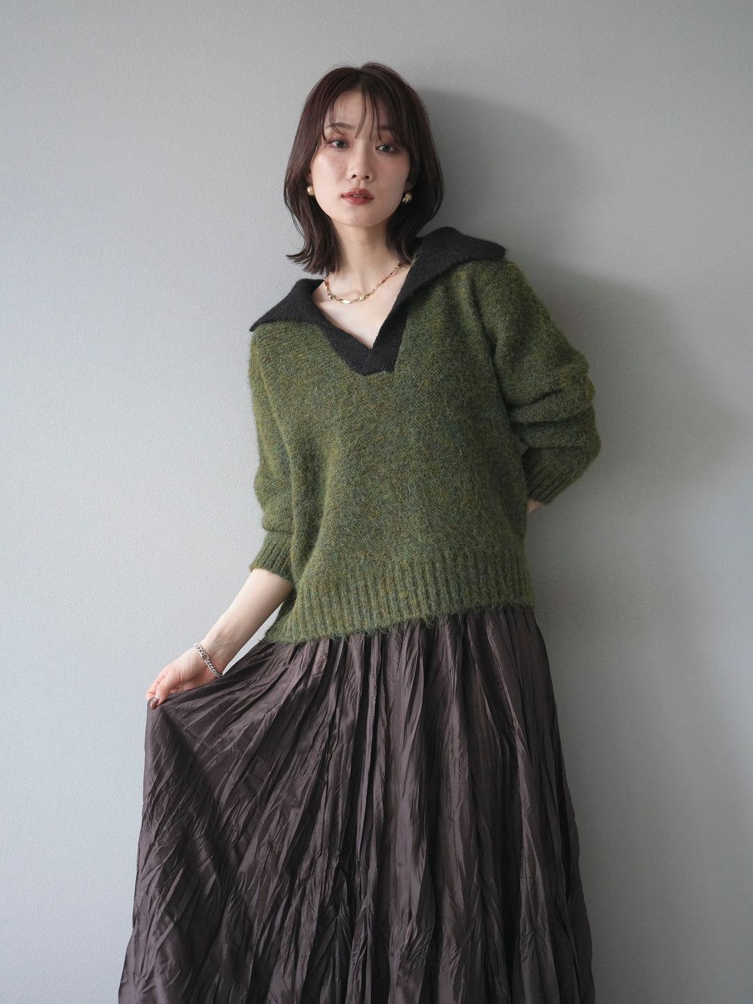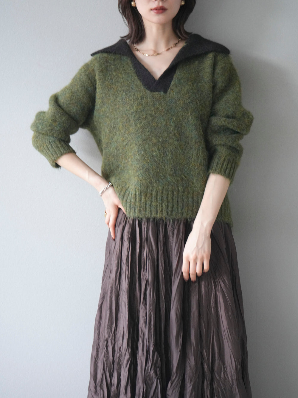 [予約]バイカラー襟付きニットプルオーバー/green