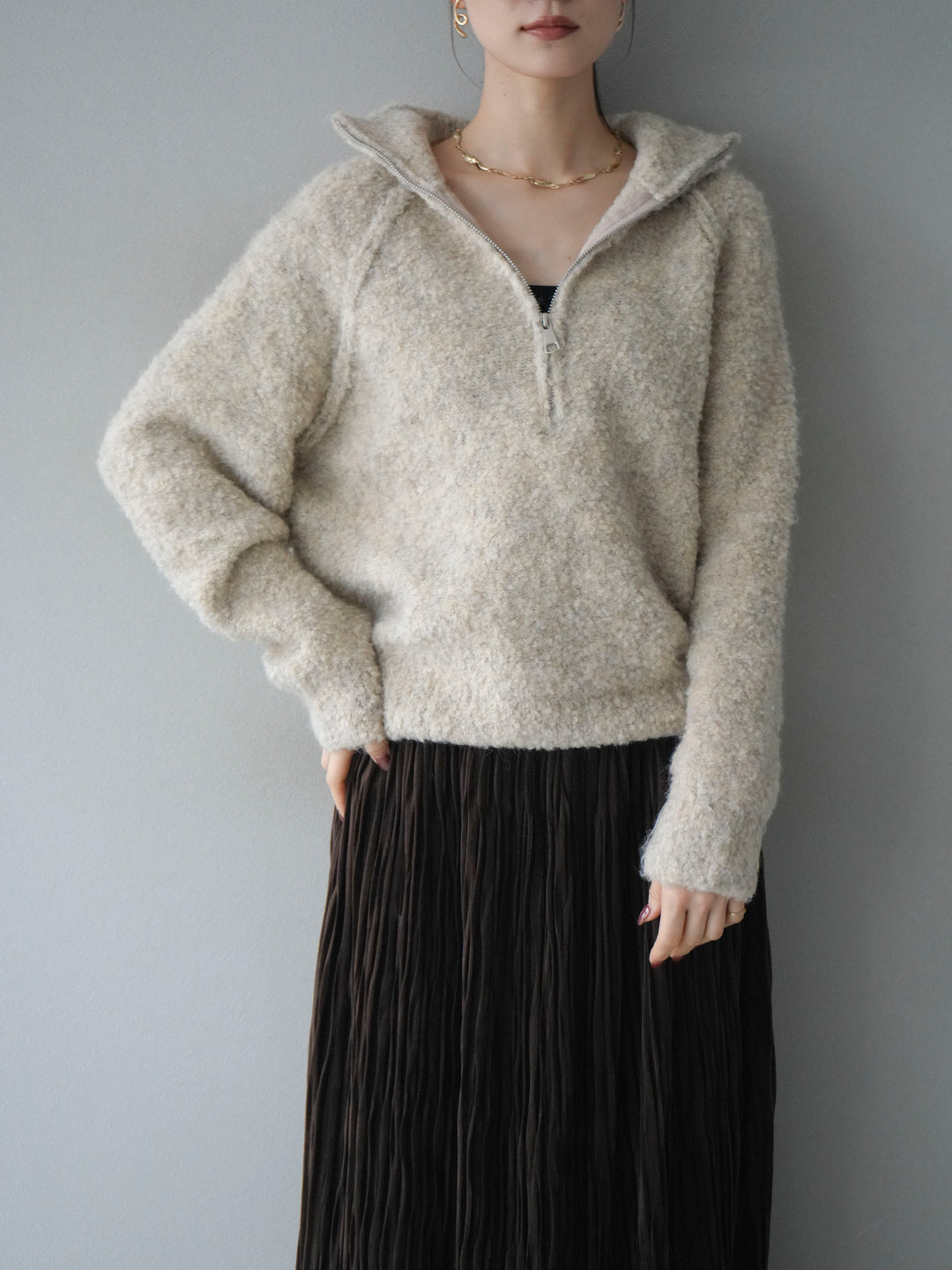 [予約]スタンドジップMIXブークレニットプルオーバー/beige