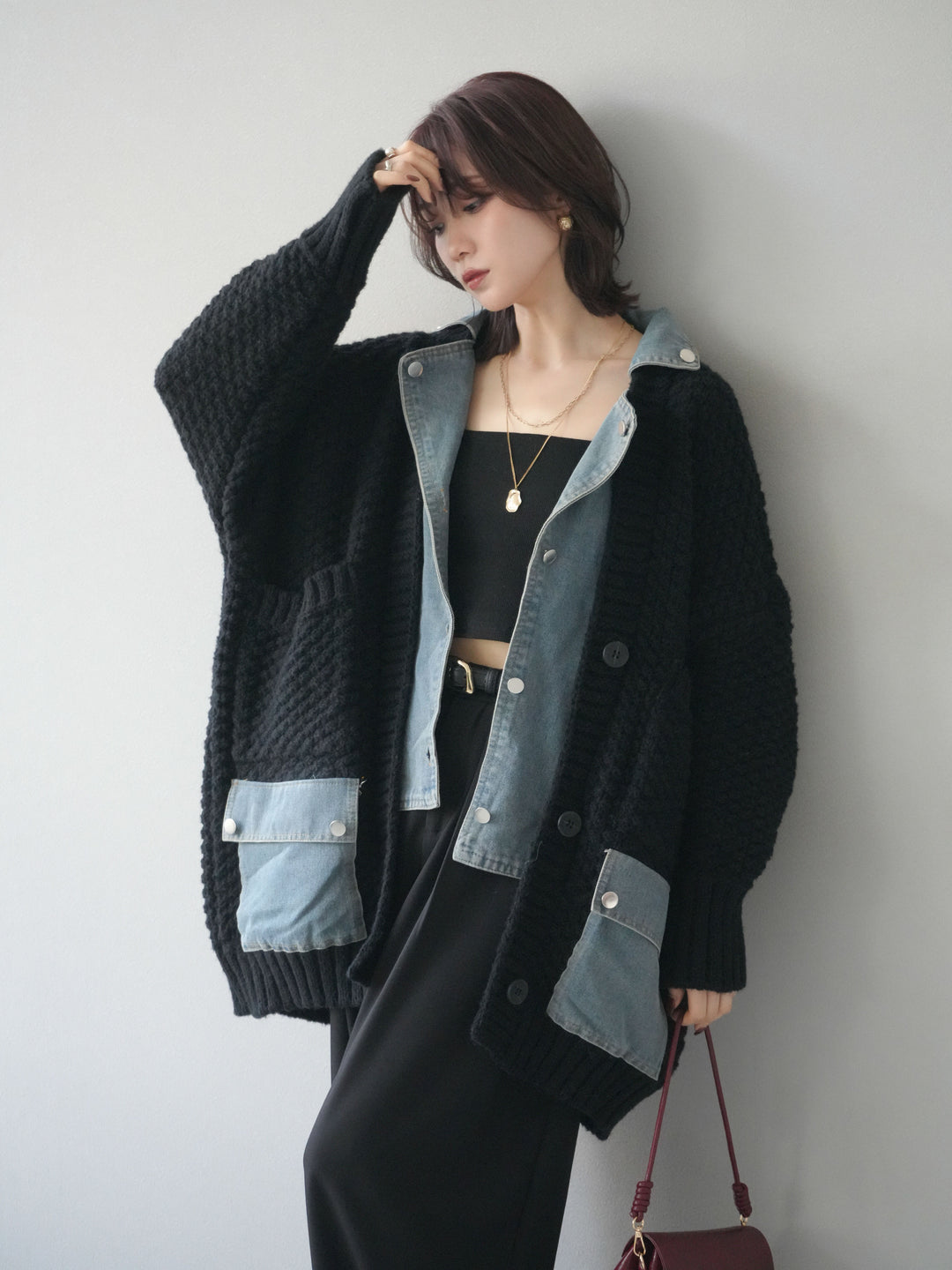 [予約]デニム襟レイヤードニットジャケット/black