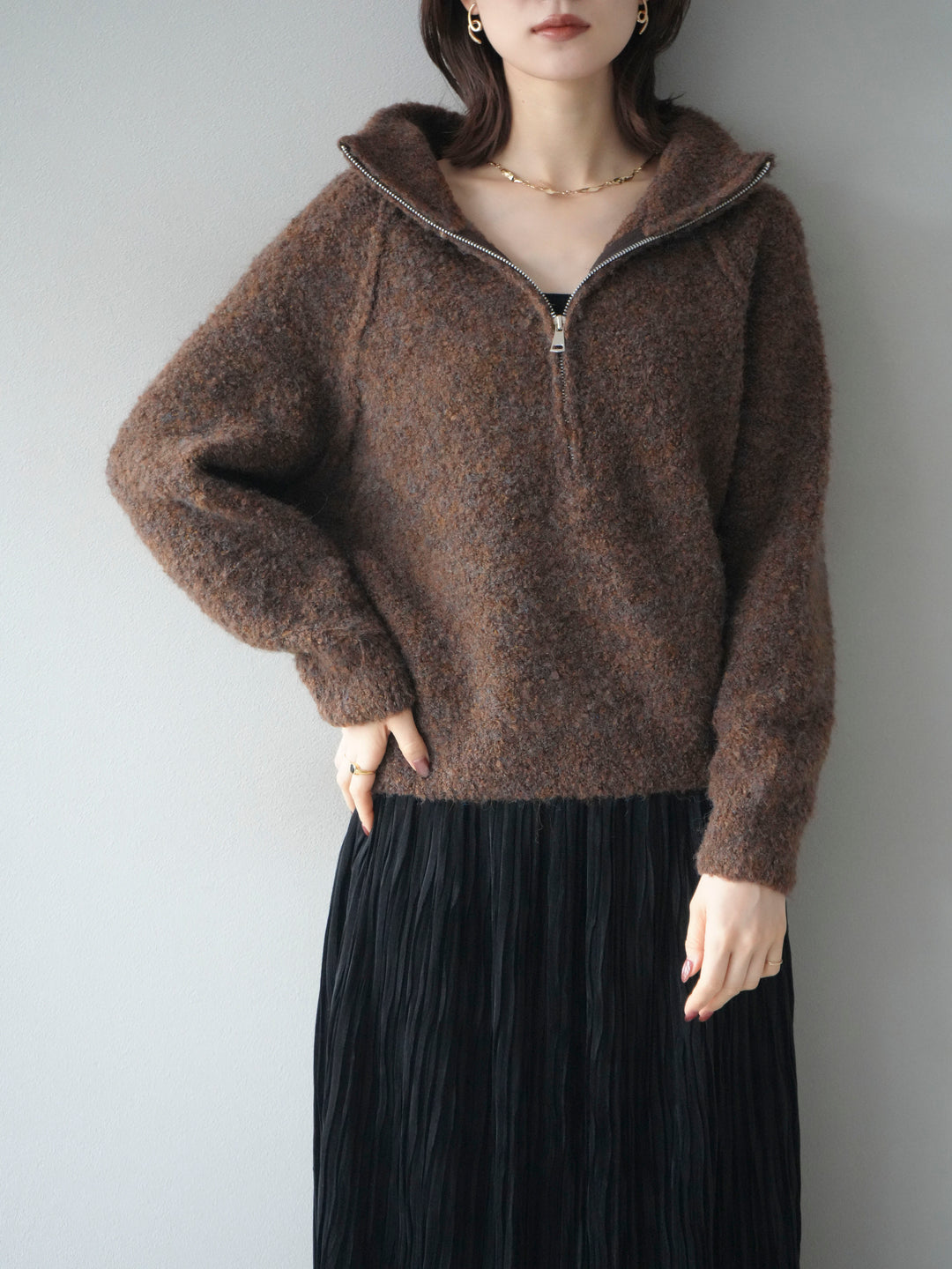 [予約]スタンドジップMIXブークレニットプルオーバー/brown