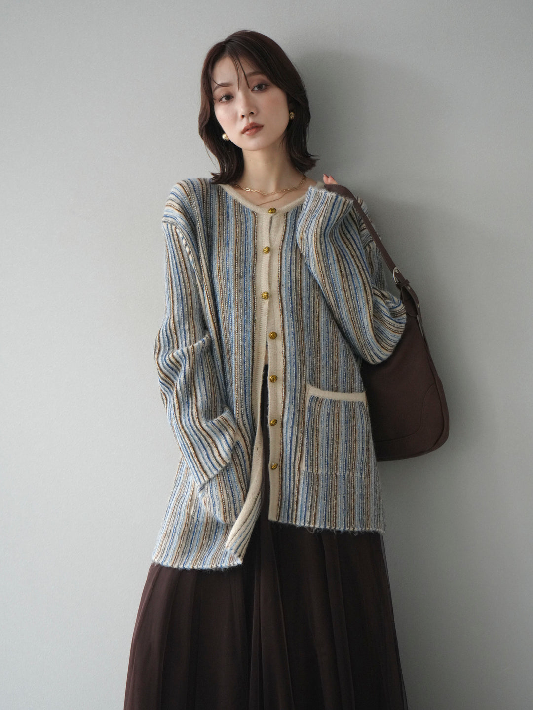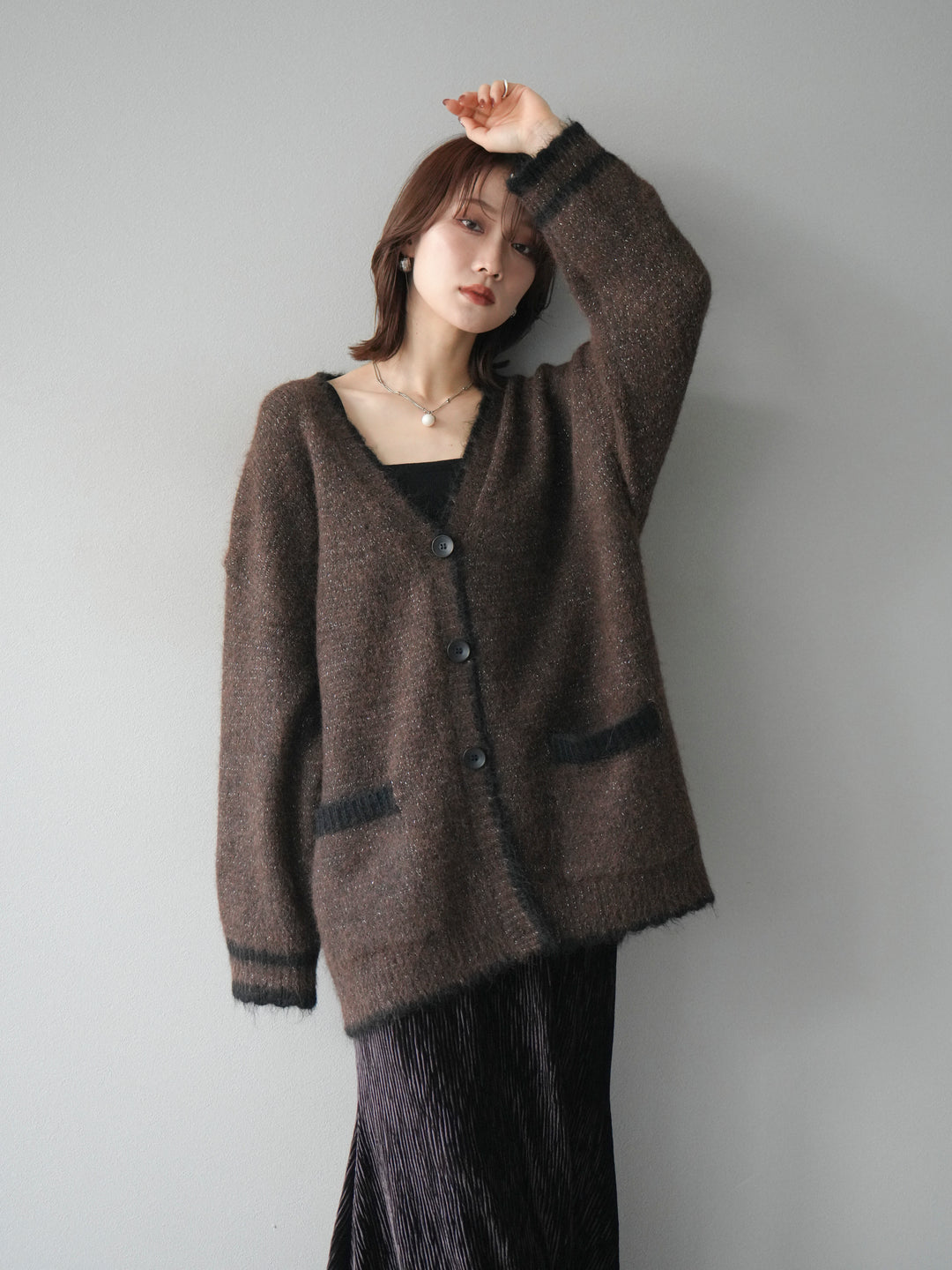 [予約]バイカラーラメニットカーディガン/brown