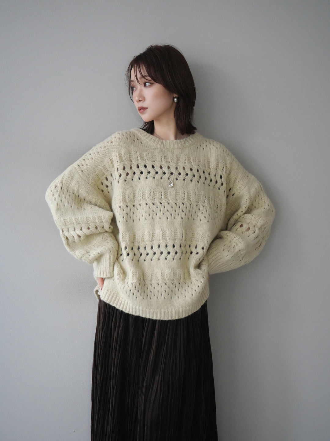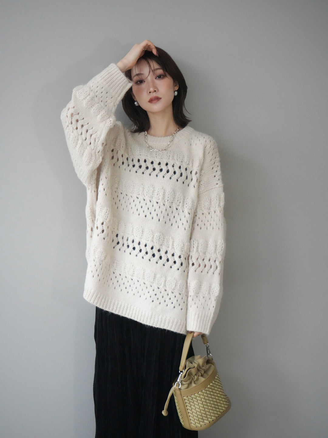 [予約]透かし編みクルーネックニットプルオーバー/ivory