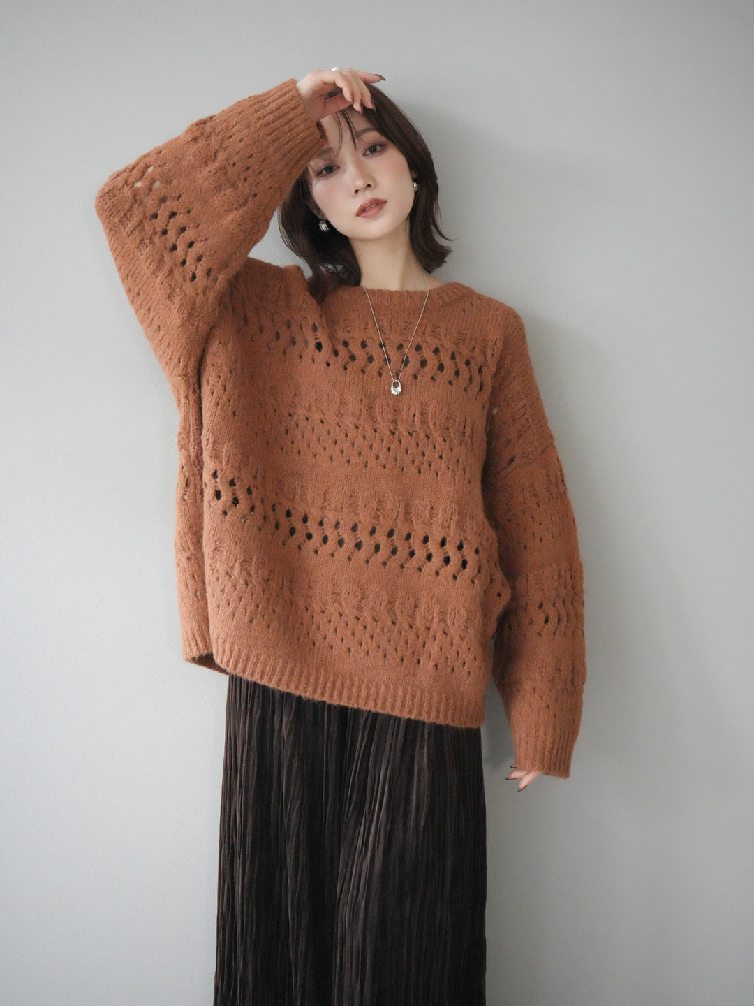 [予約]透かし編みクルーネックニットプルオーバー/brown