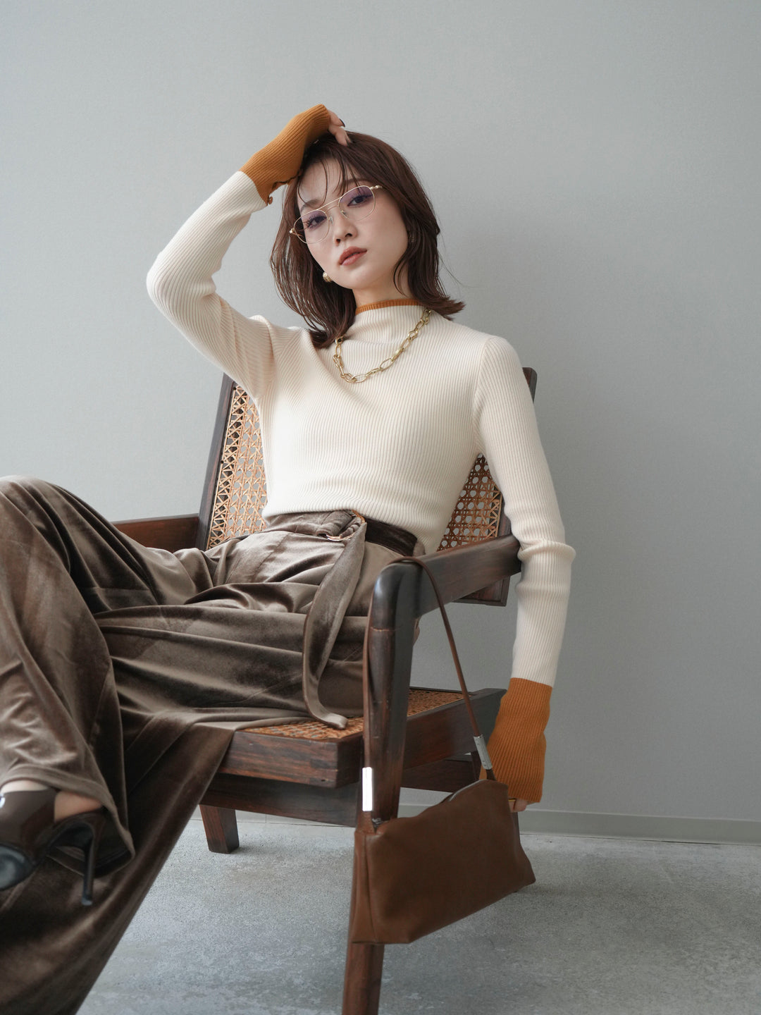 [予約]袖ボタンハイネック配色リブニットトップス/ivory