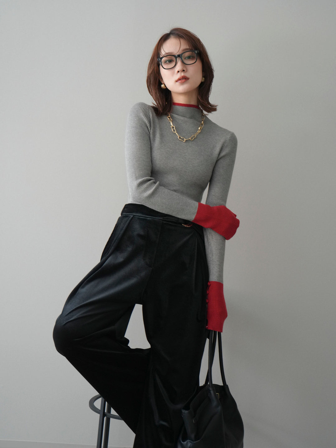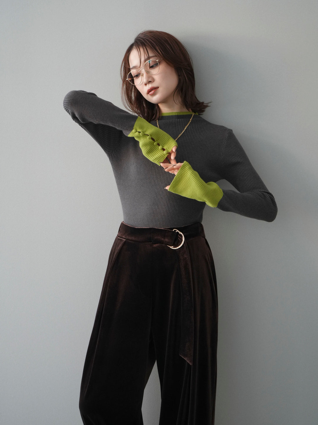 [予約]袖ボタンハイネック配色リブニットトップス/charcoal