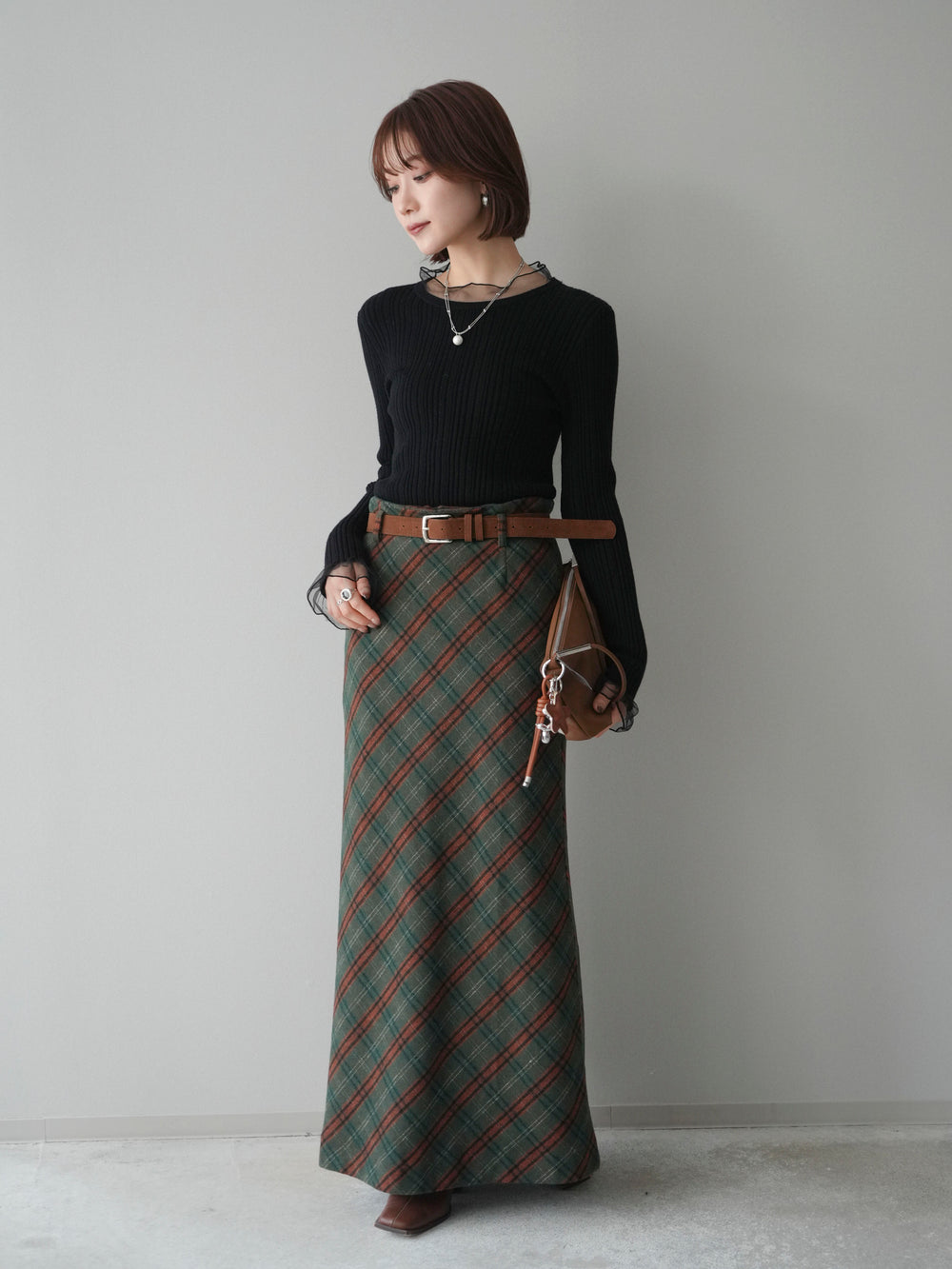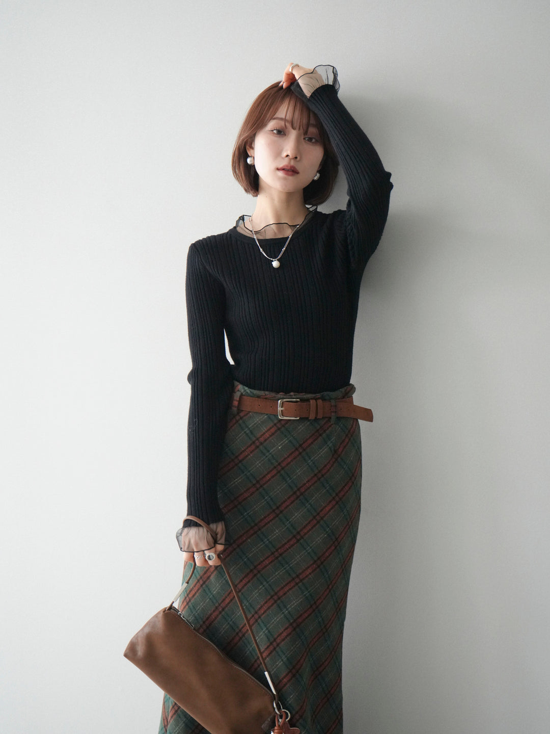 [SET]チュールドッキングリブニットトップス+ベルト付チェック柄ナロースカート(2set)