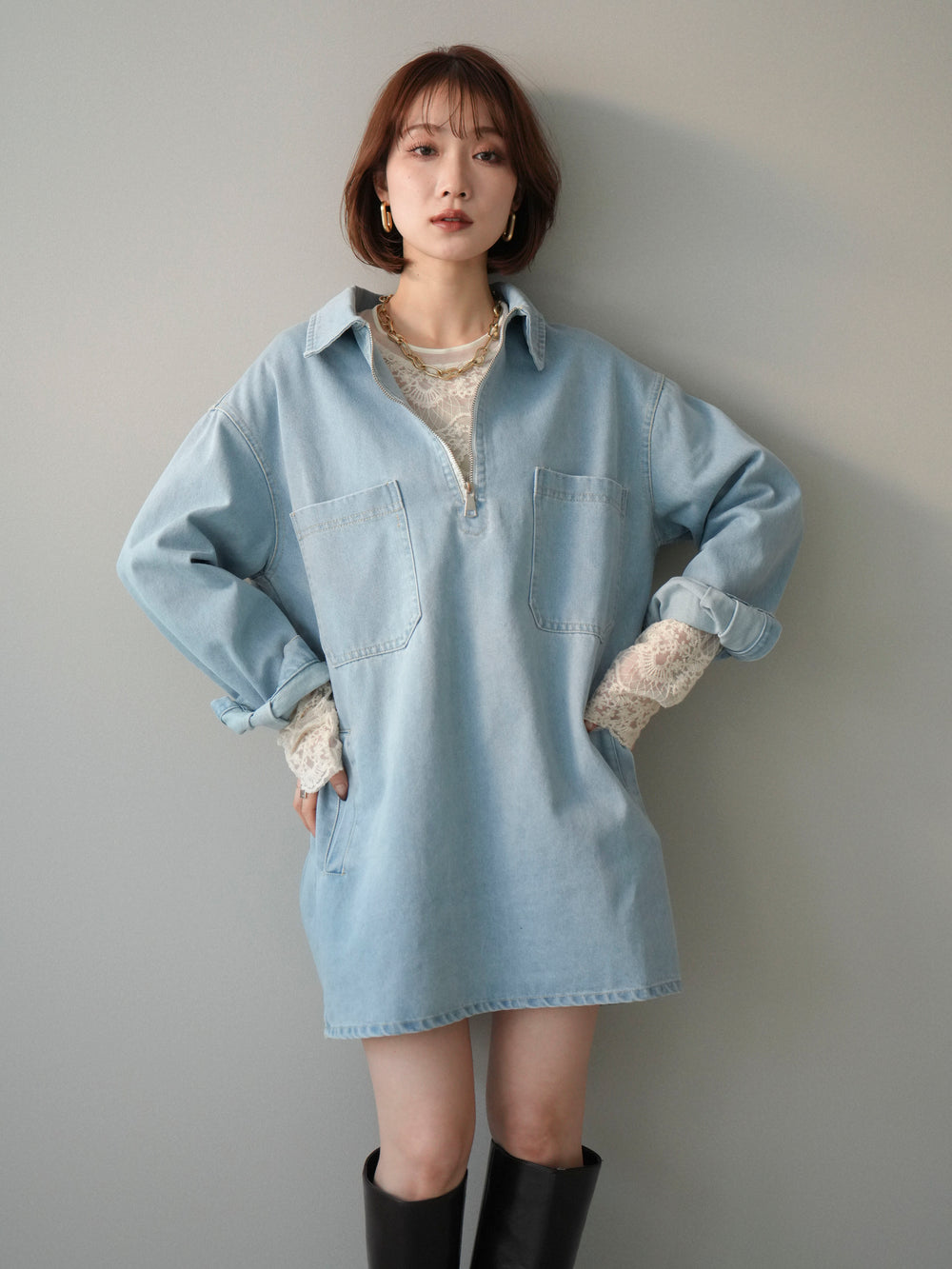 [SET]ハーフジップデニムミニワンピース+チュールレーストップス(2set)