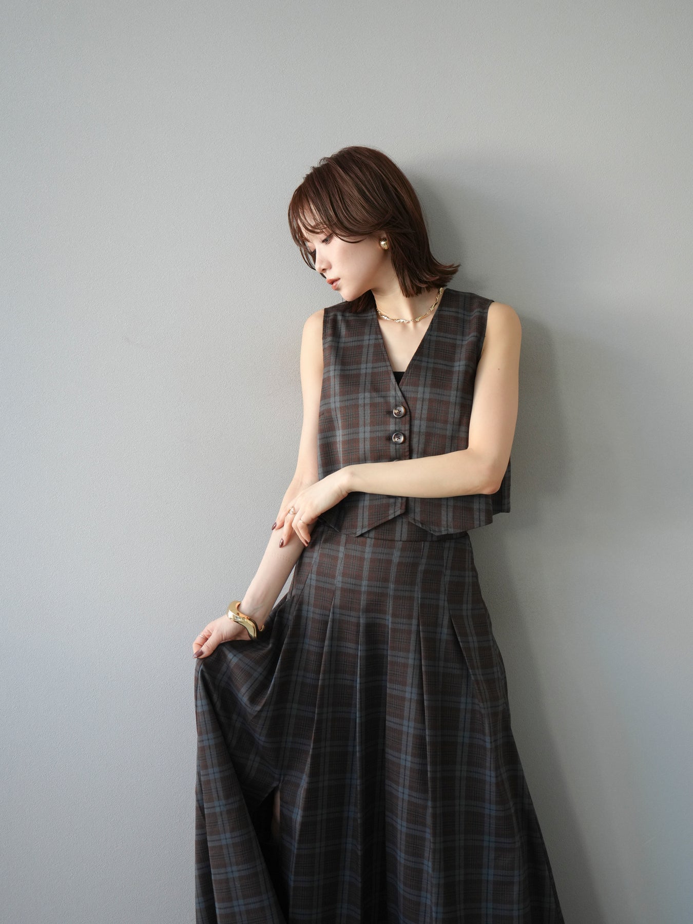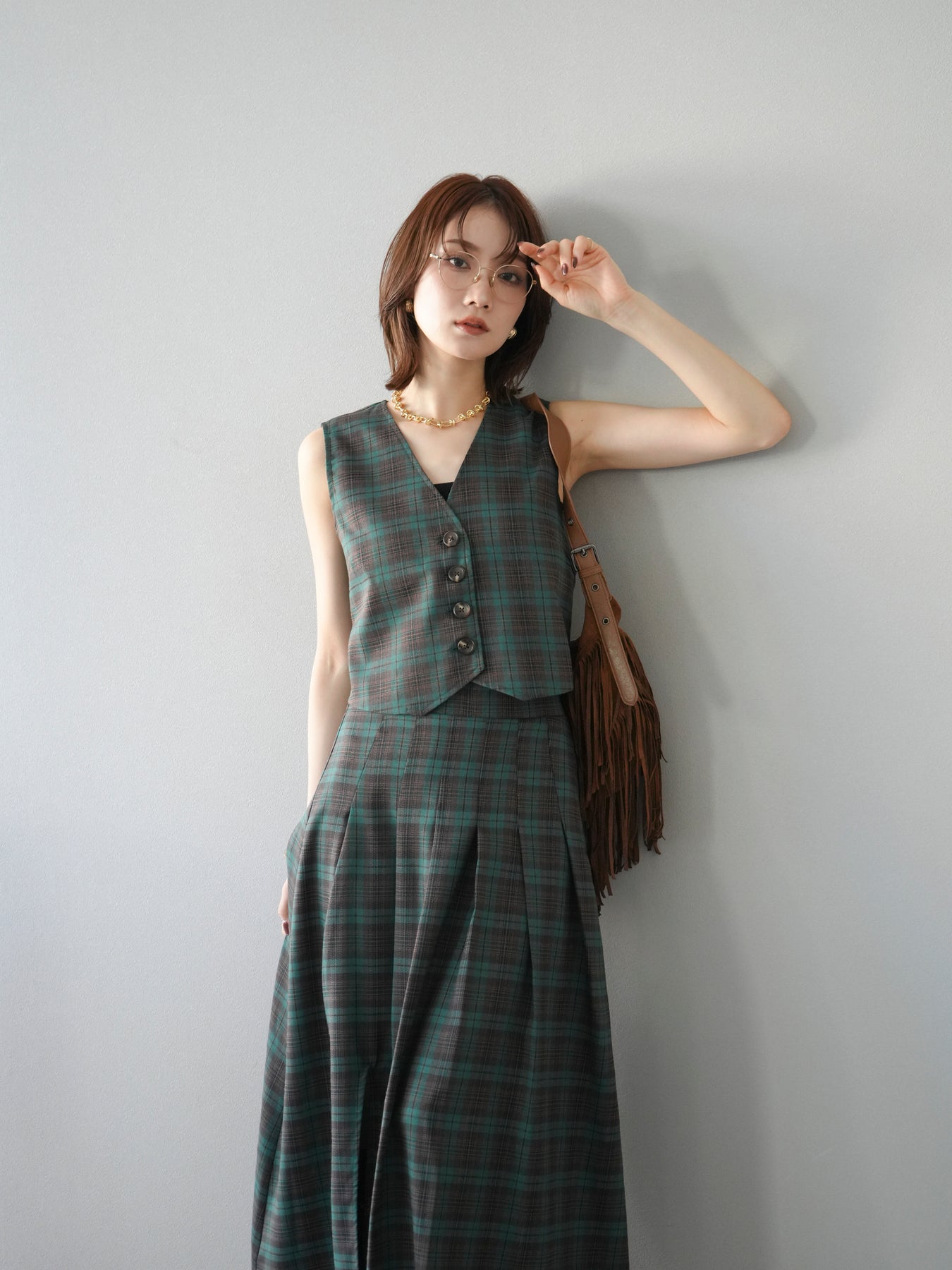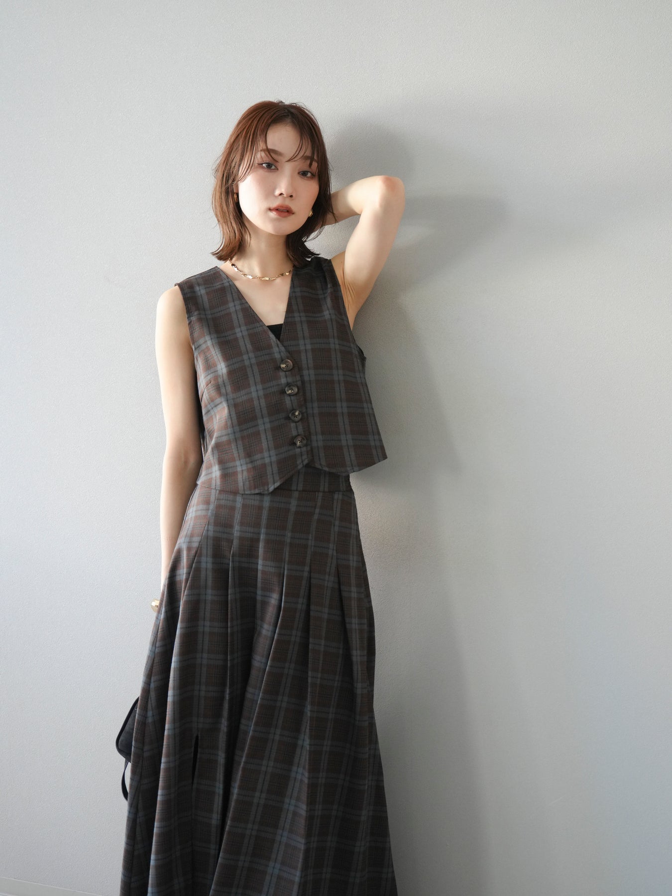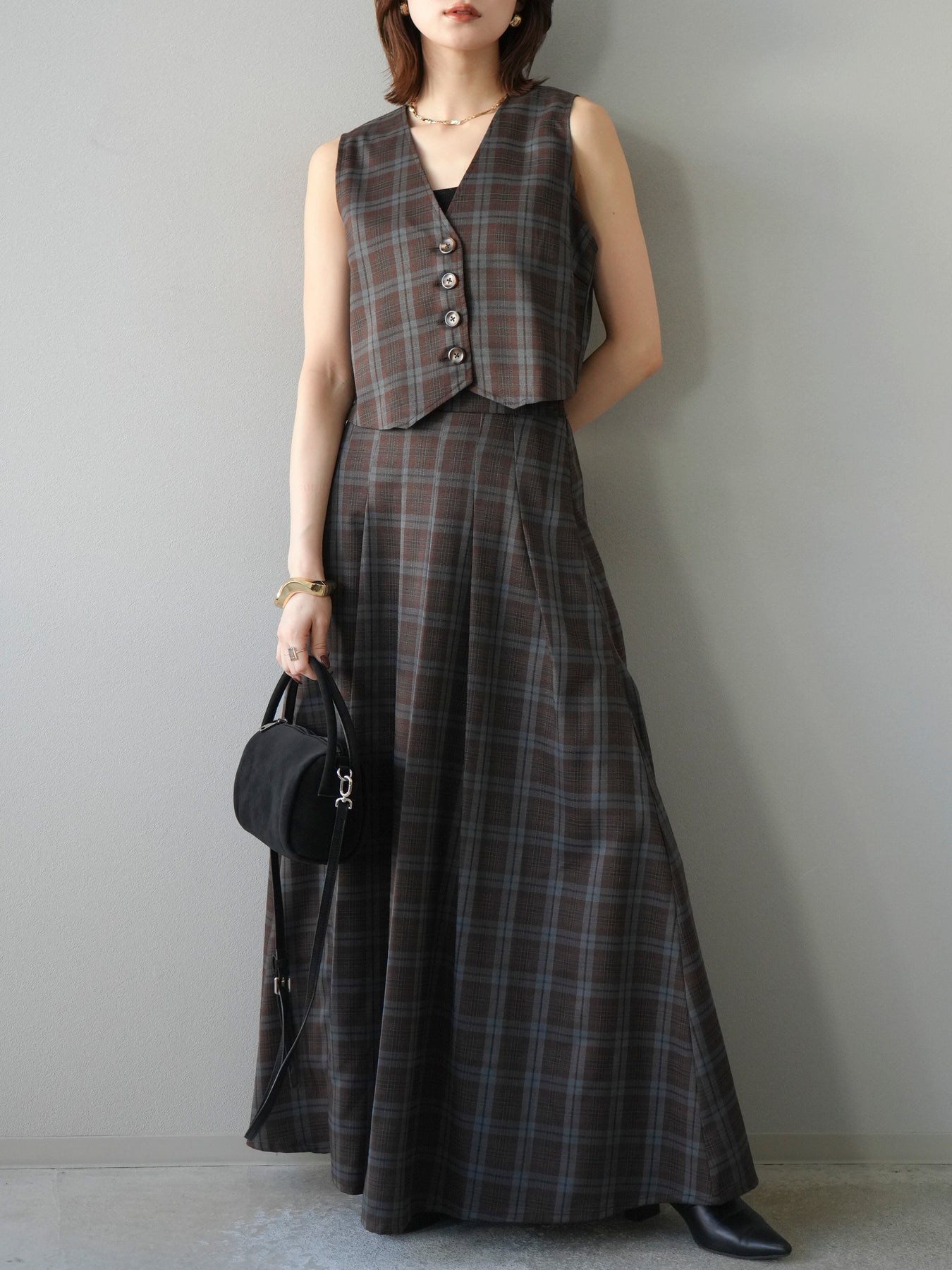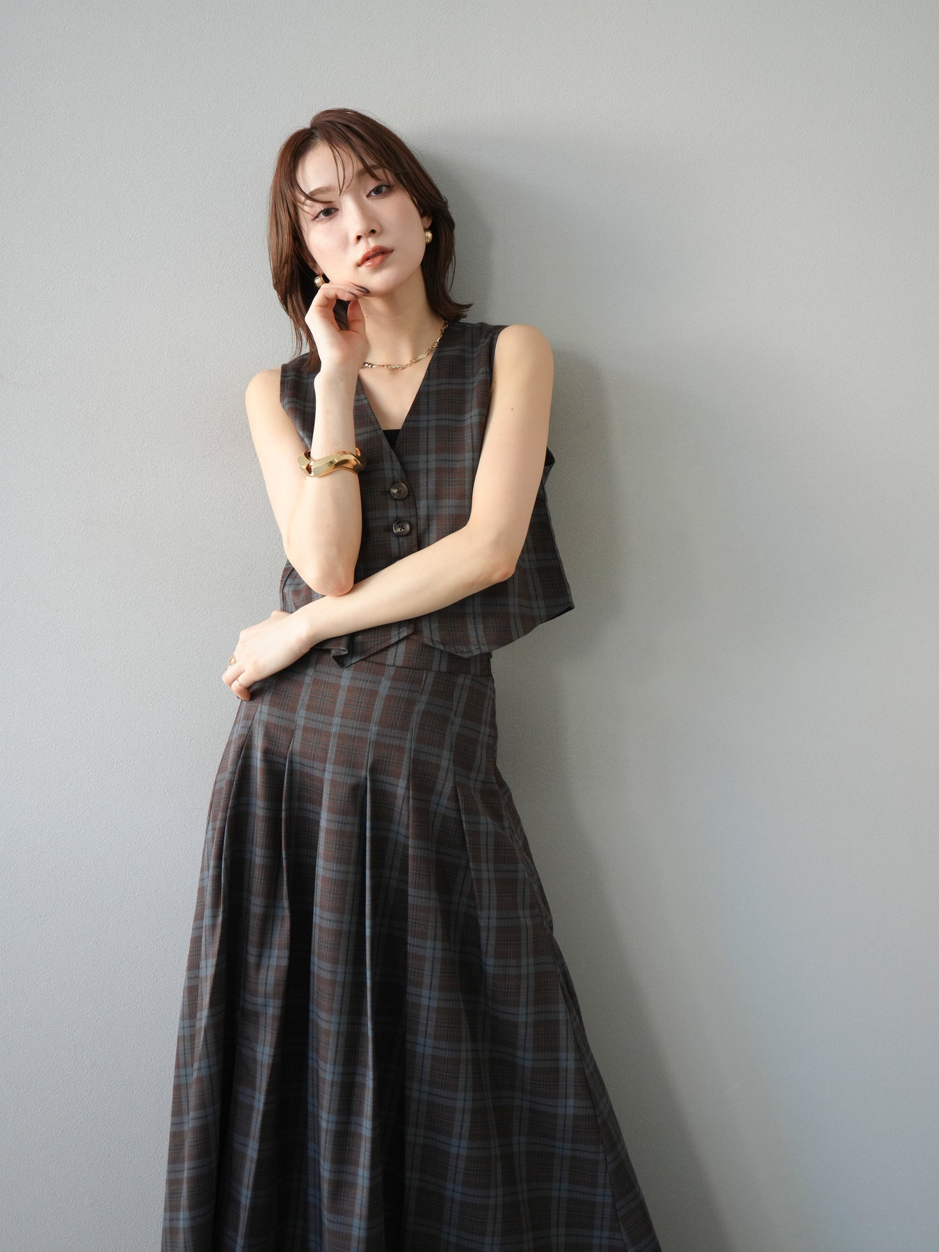 [SET] 格紋背心+格紋褶皺喇叭裙(2套)