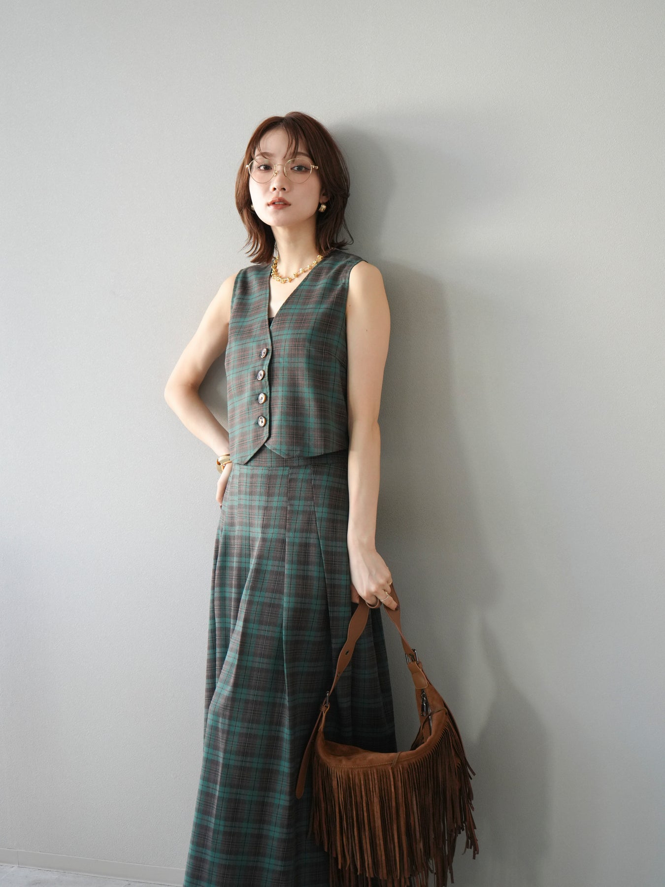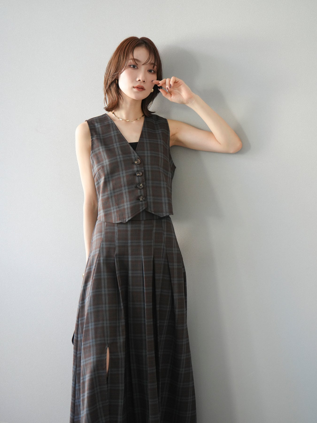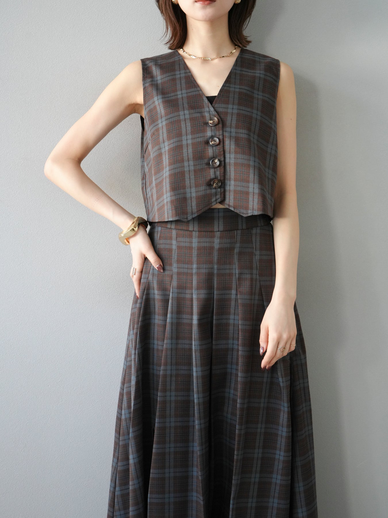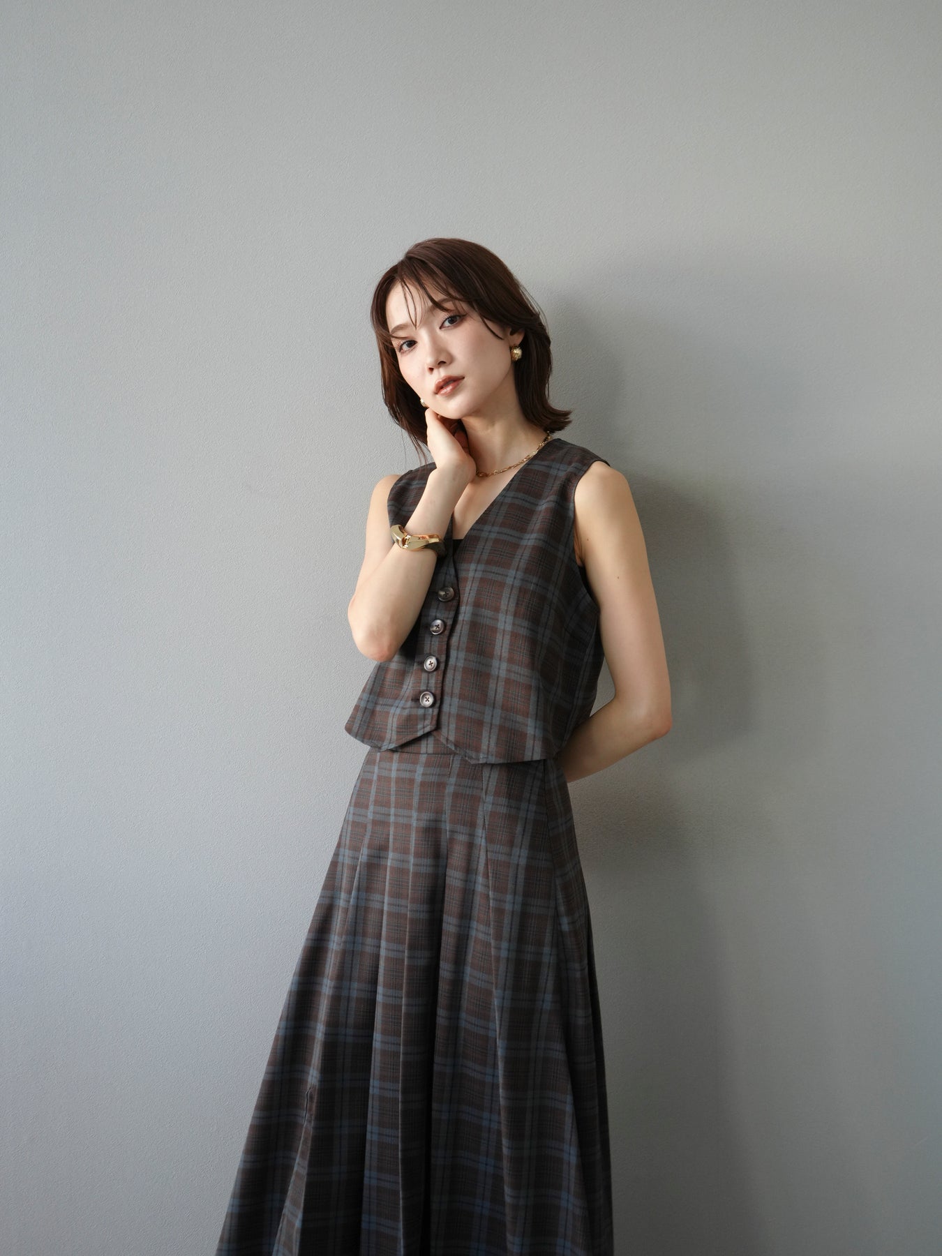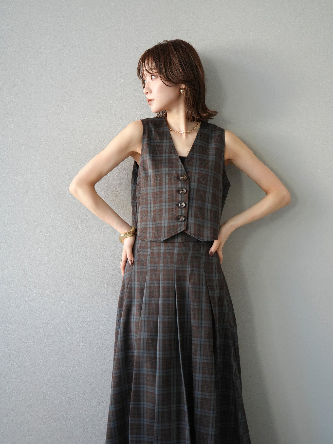 [SET] 格紋背心+格紋褶皺喇叭裙(2套)
