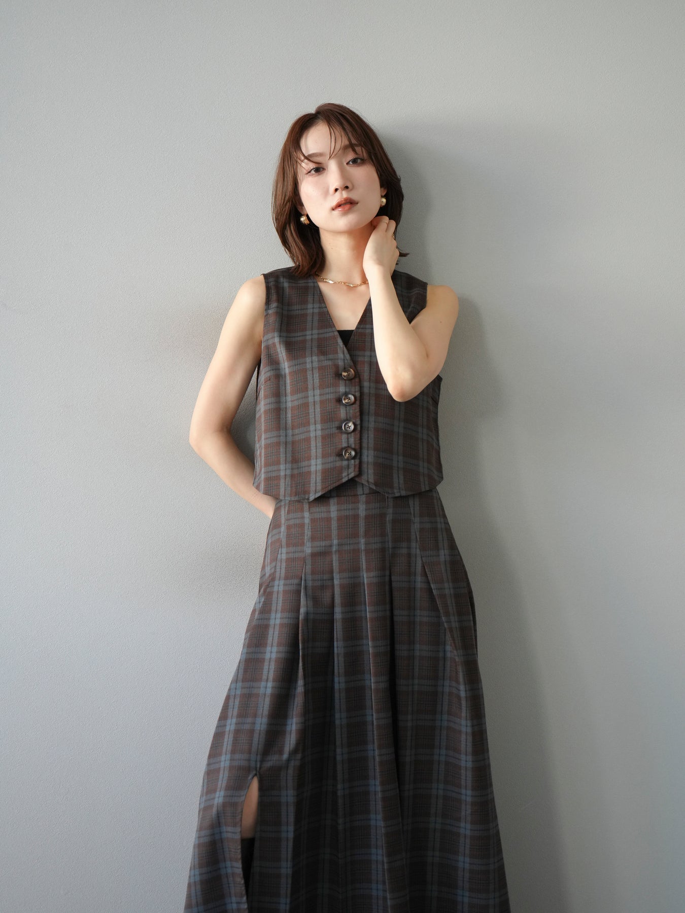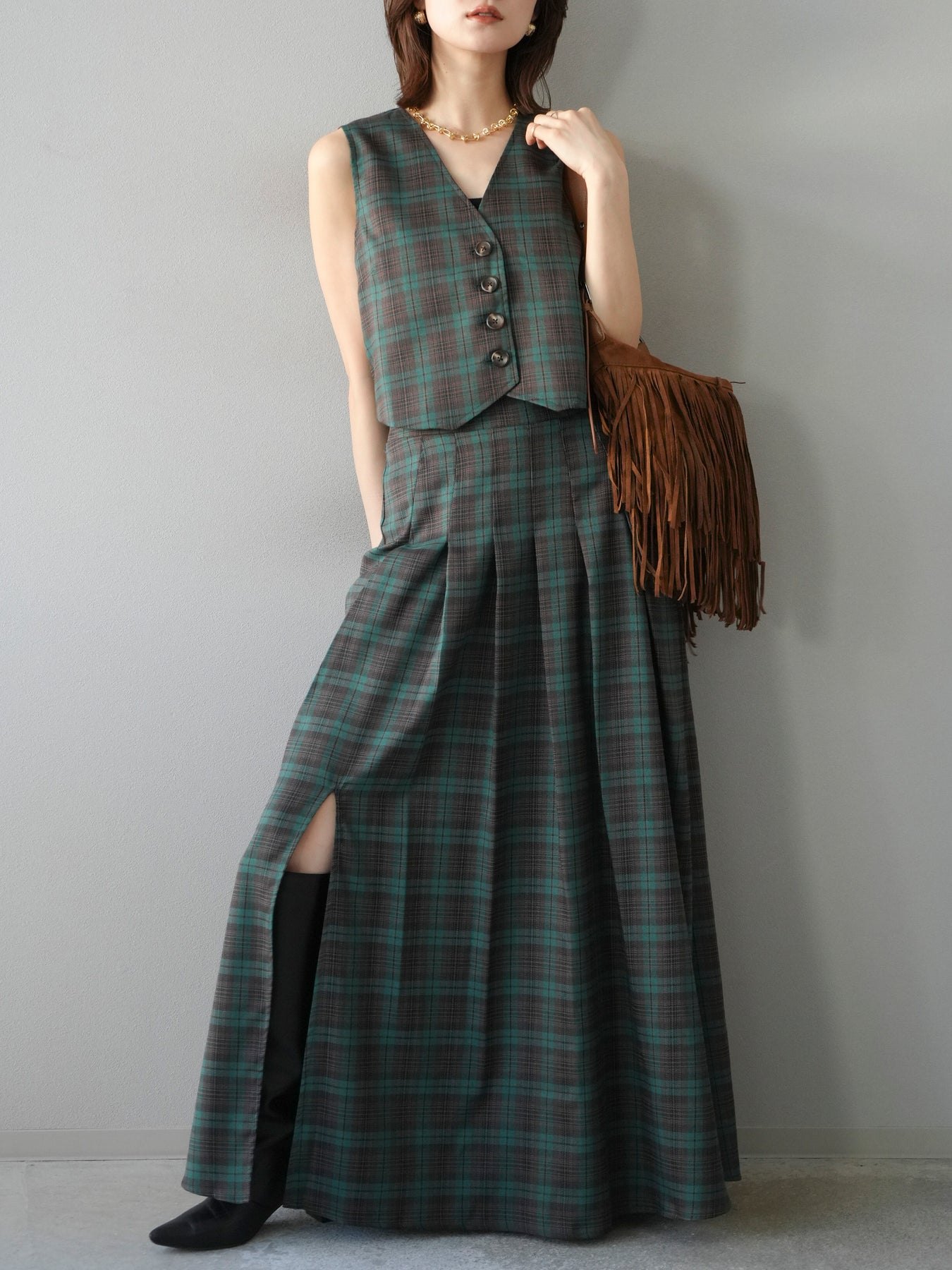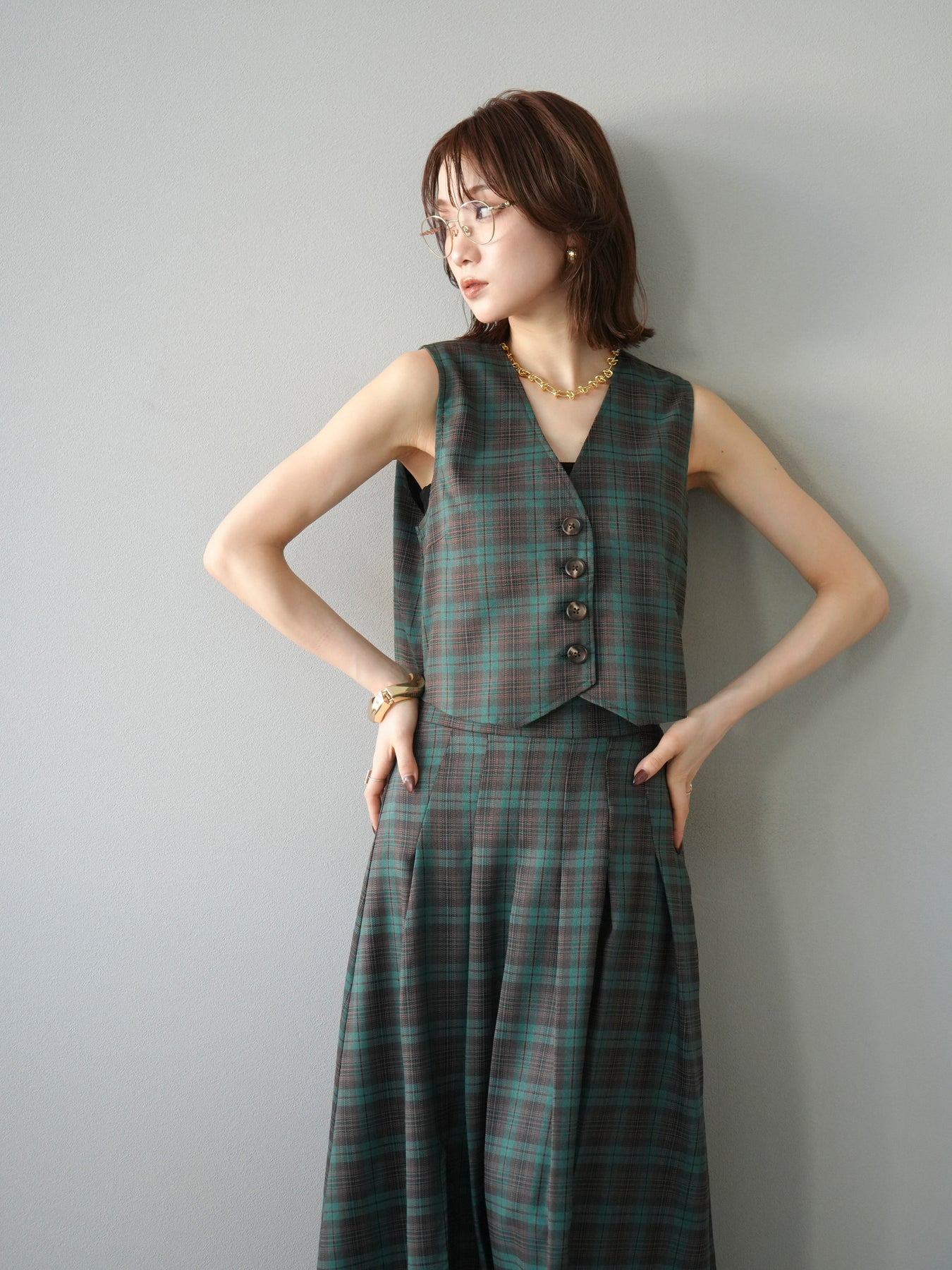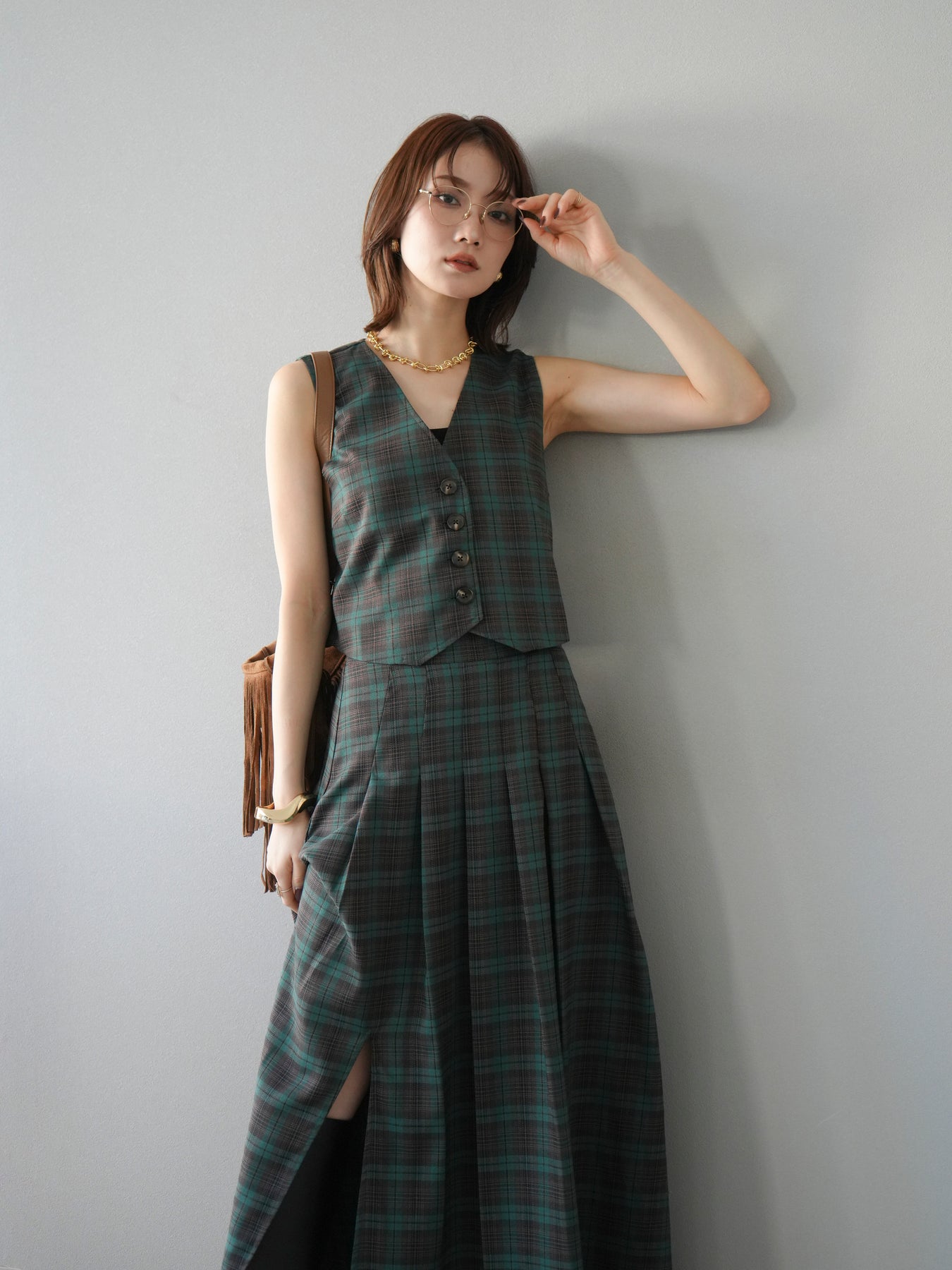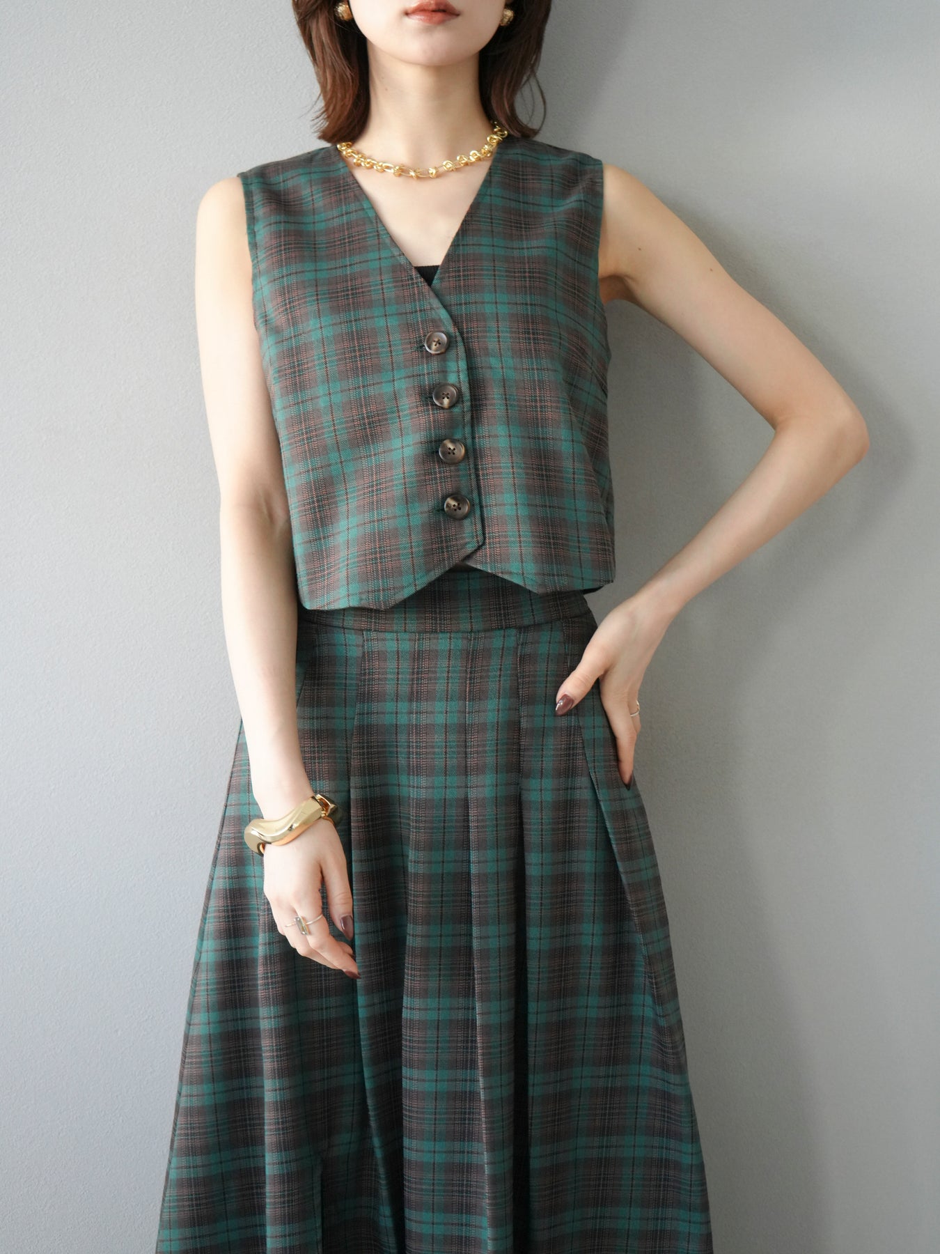 [SET] 格紋背心+格紋褶皺喇叭裙(2套)