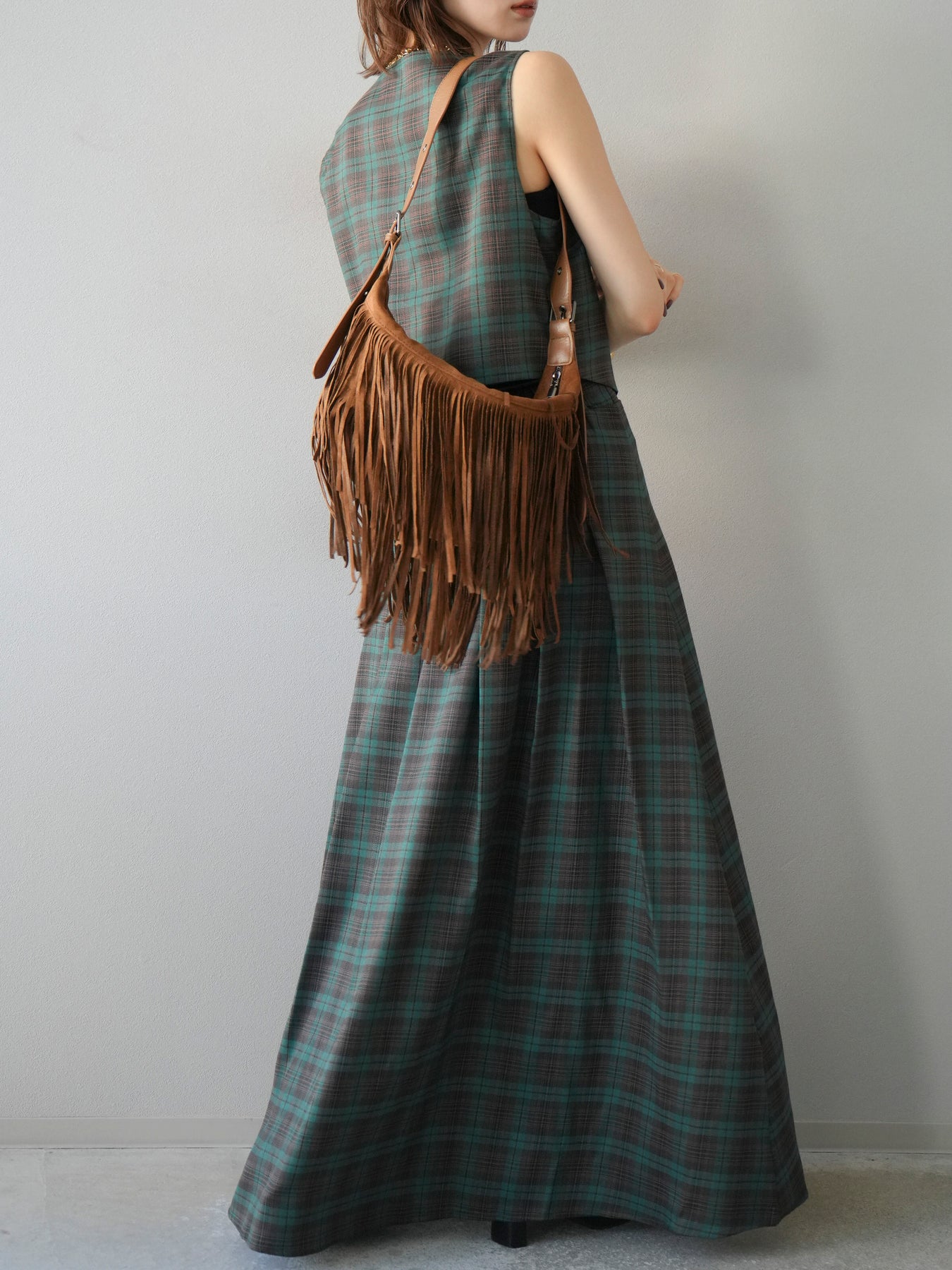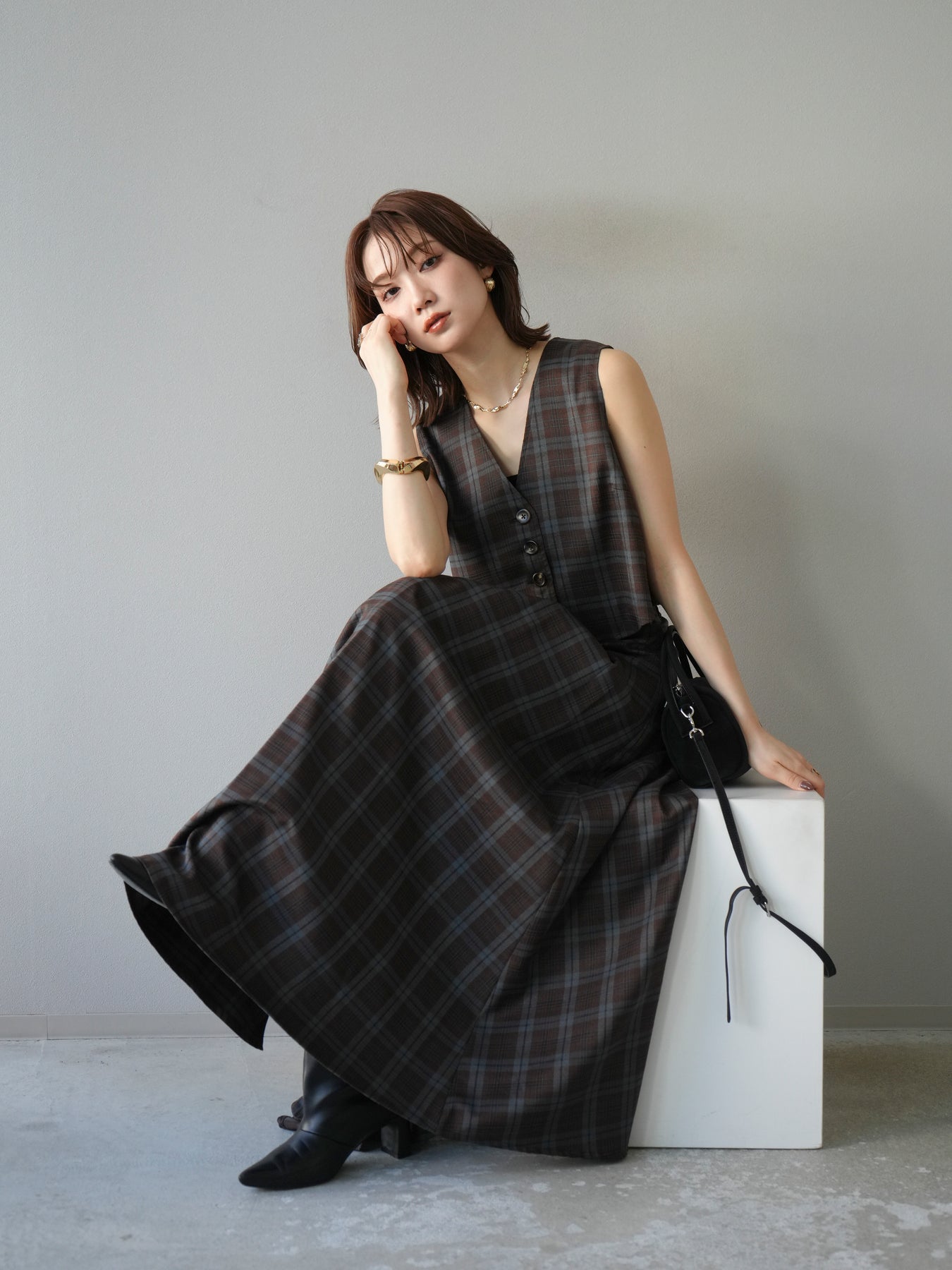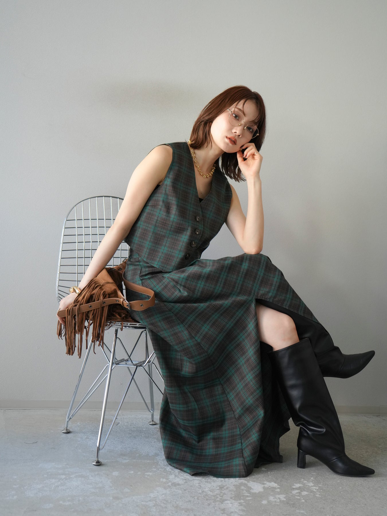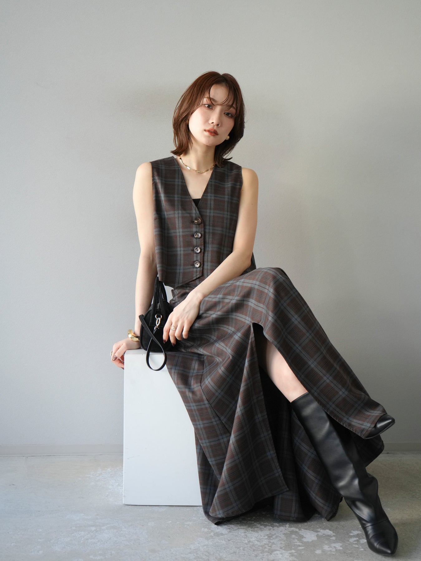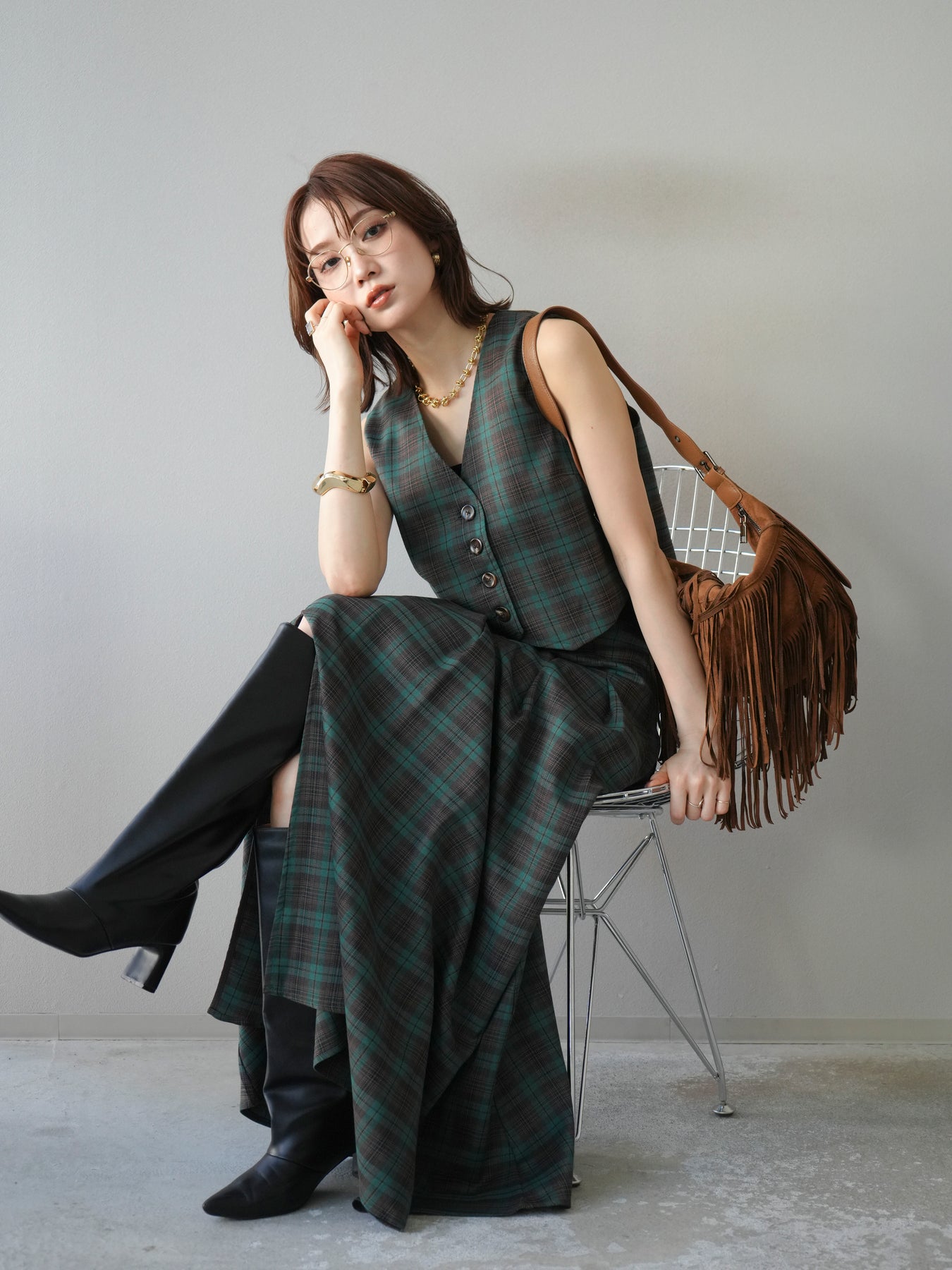 [SET] 格紋背心+格紋褶皺喇叭裙(2套)