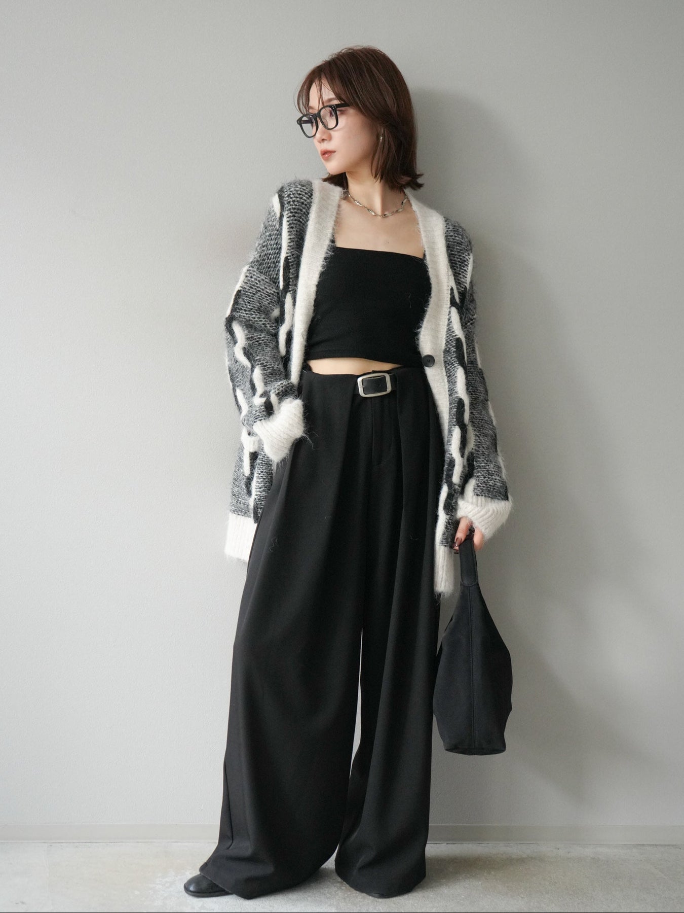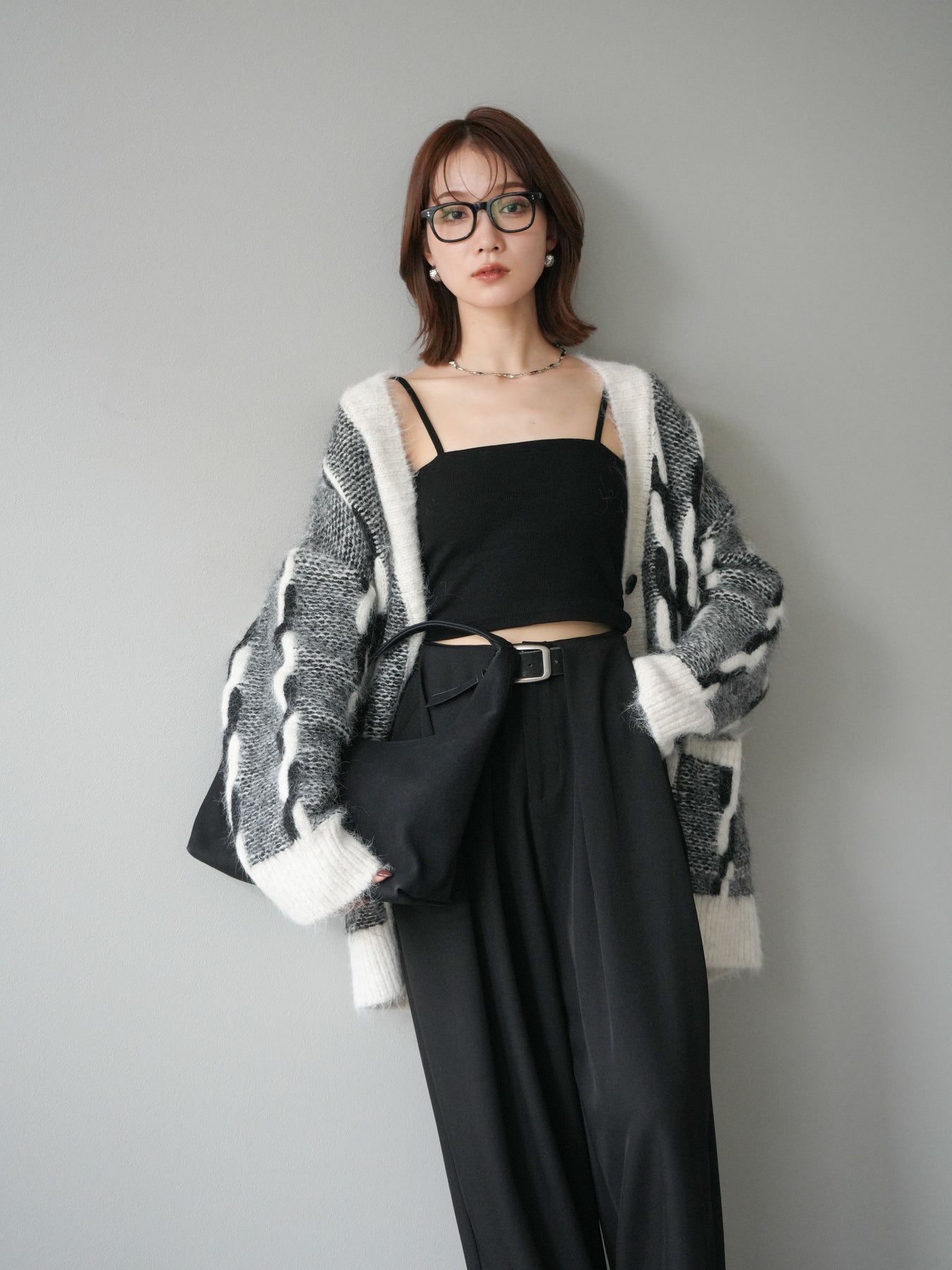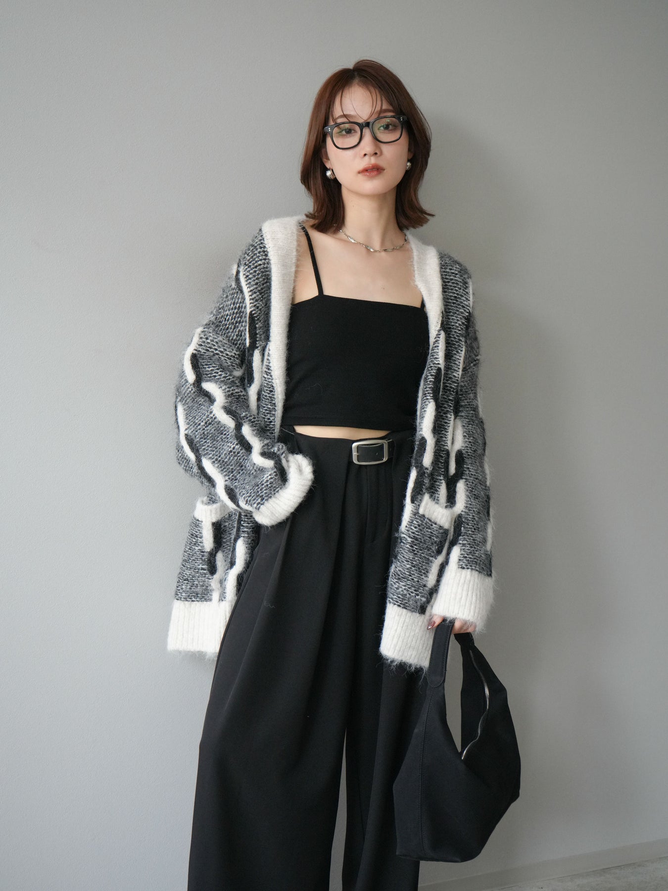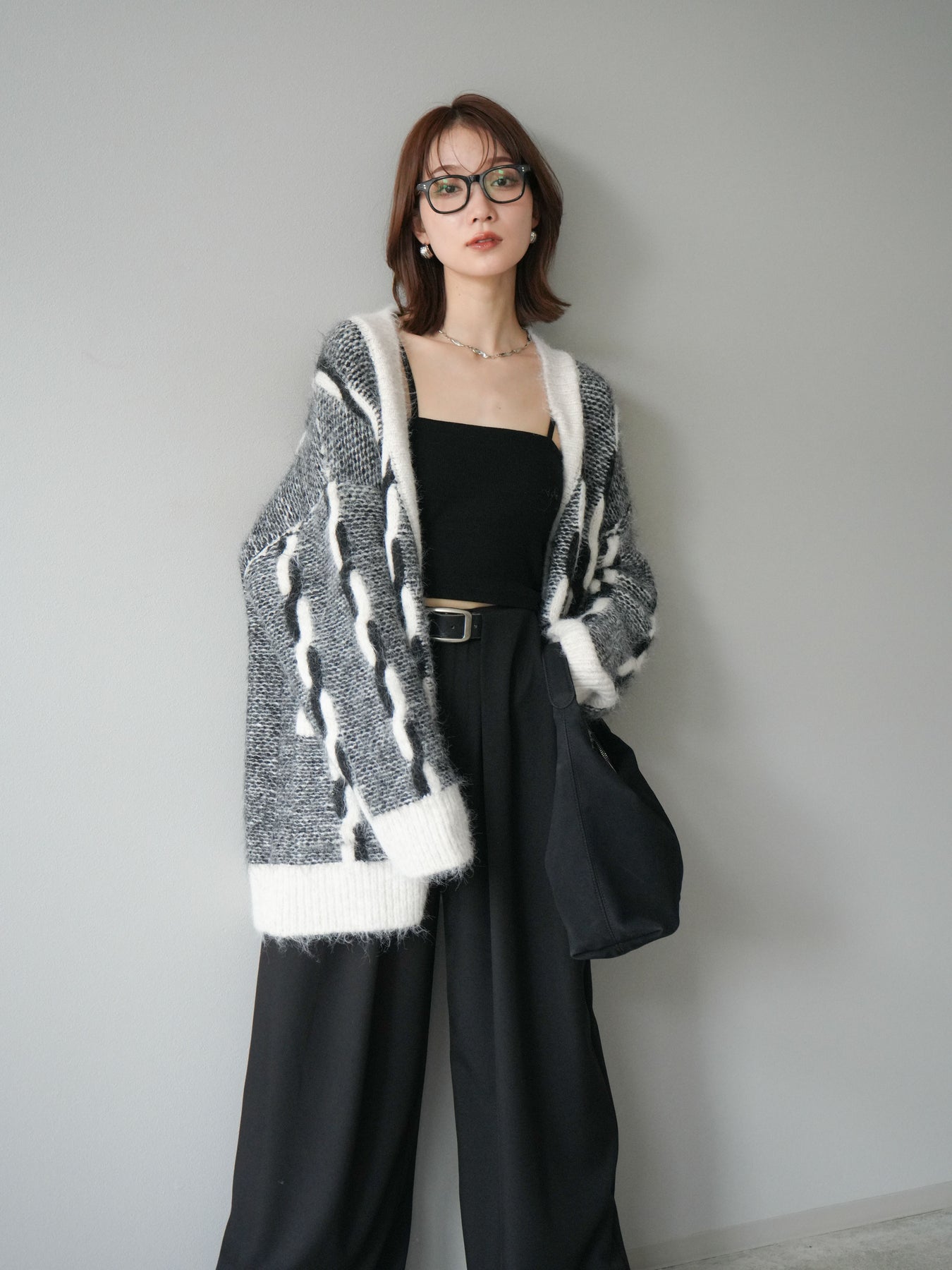 存在感のあるバイカラーデザインが目を惹くニットカーディガン。立体感のある編み込み模様が華やかさを演出し、羽織るだけでスタイリングを引き締めてくれます。ふんわりとした糸を使用しており、柔らかく暖かな着心地。ゆとりのあるシルエットで抜け感のあるバランスに仕上げました。デニムなどのカジュアルスタイルにはもちろん、スカート合わせでフェミニンに着こなすのもおすすめです。 ※ボトムス、キャミソール(インナー)以外の商品は一律でインナーは付属していません。
