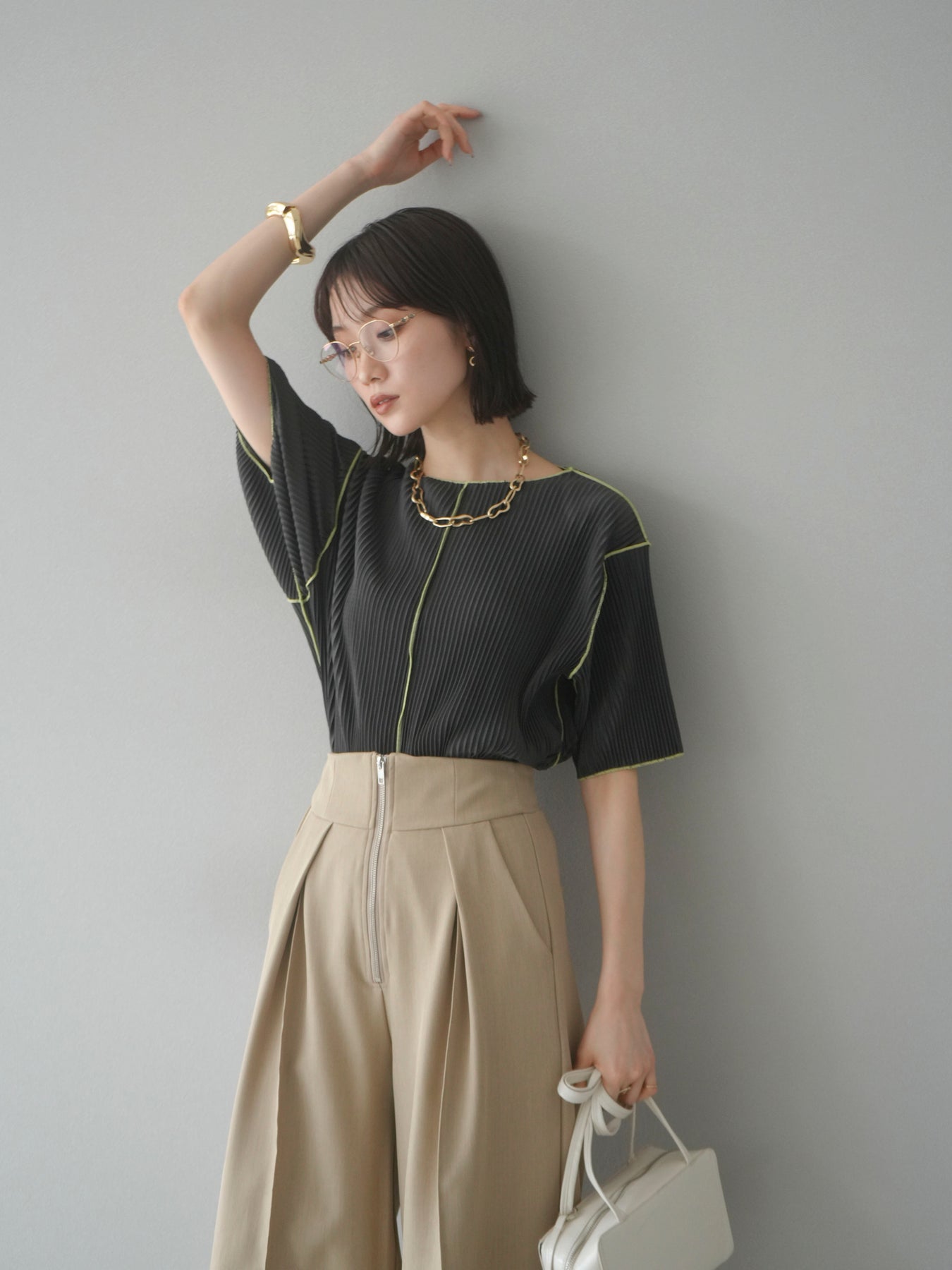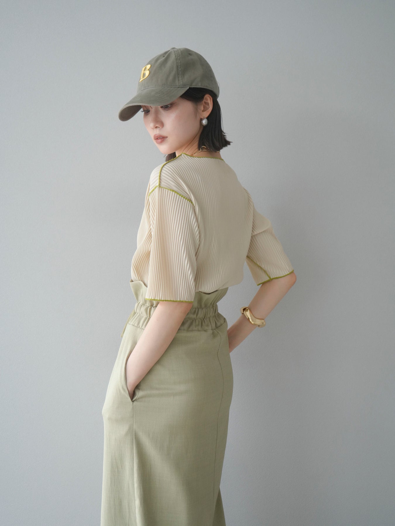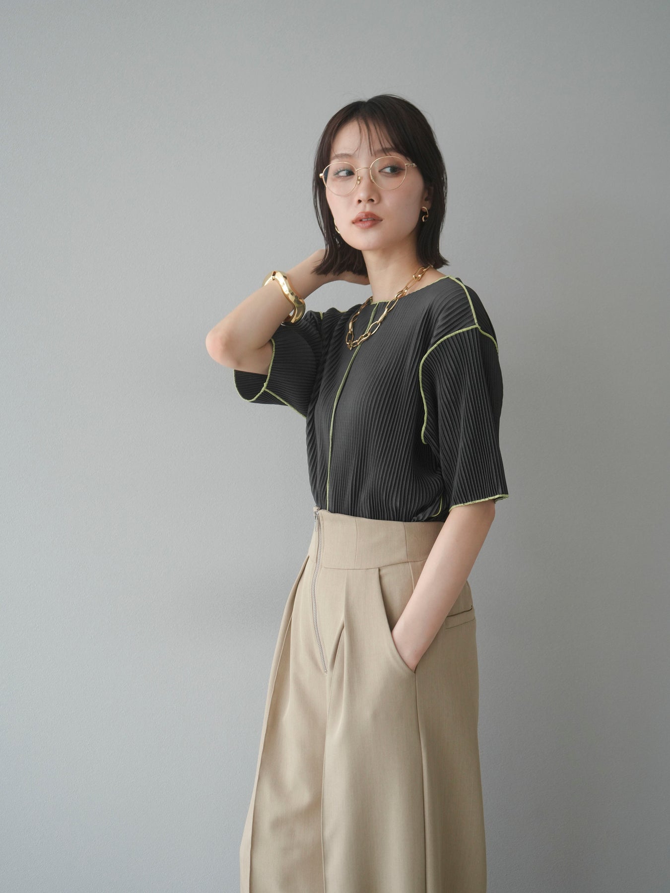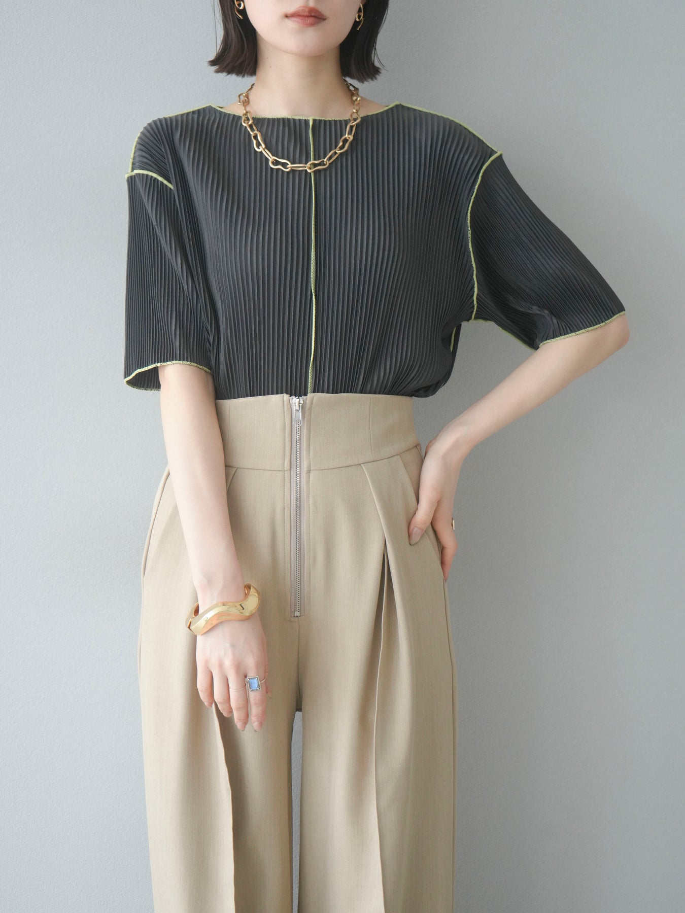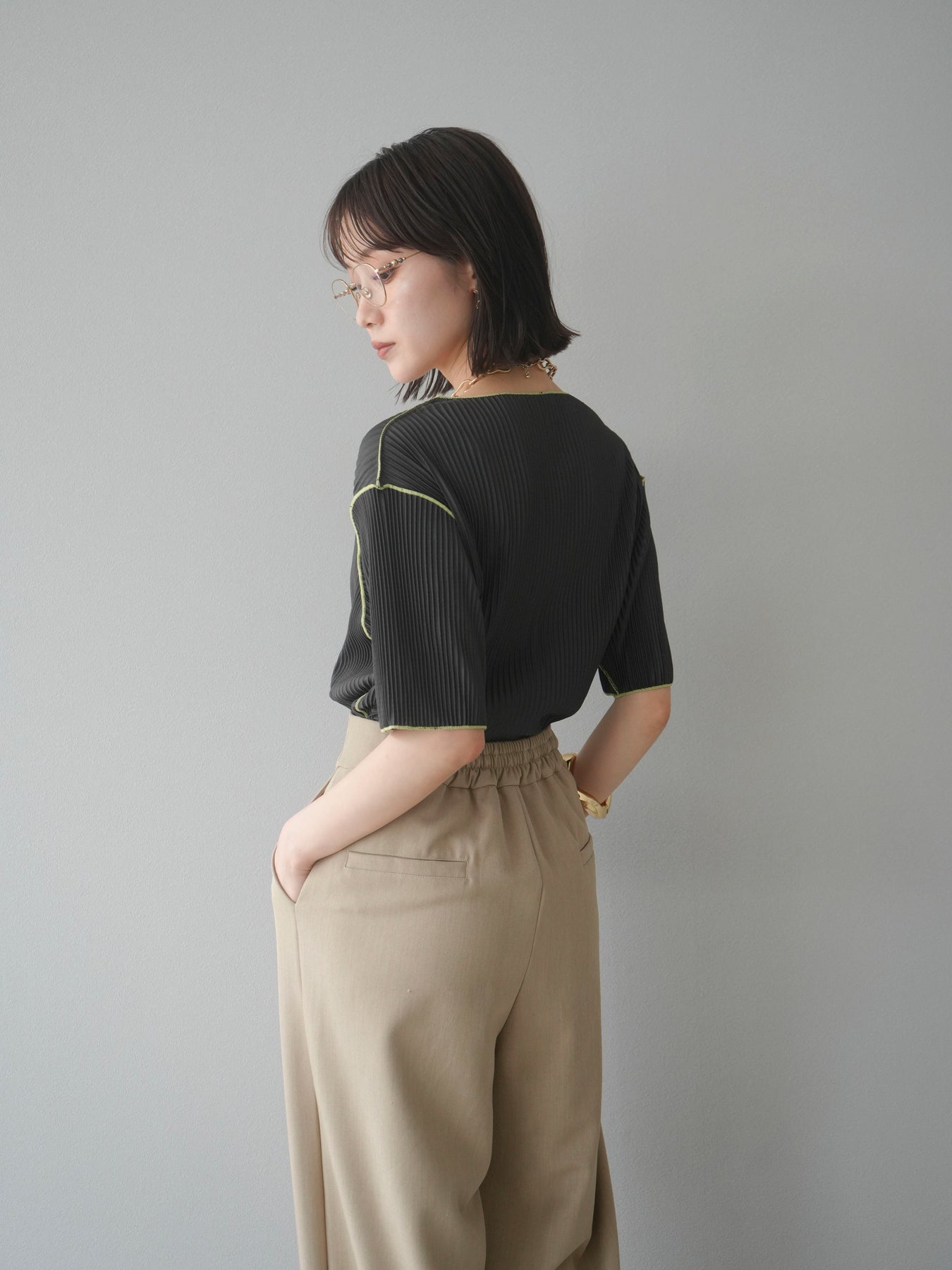 色彩協調的柔和褶皺半袖上衣,採用精緻的褶皺面料,點綴著柔和的色彩。輕盈富彈性的褶皺布料貼合身體,帶來修身效果。柔和的色彩帶來簡約而不失俏皮的氣息,非常適合單獨穿著。長度適中,輪廓寬鬆,易於搭配褲裝或裙裝,是完美的疊穿選擇。 *除下裝和吊帶背心(內衣)外,其他商品均不含內衣。