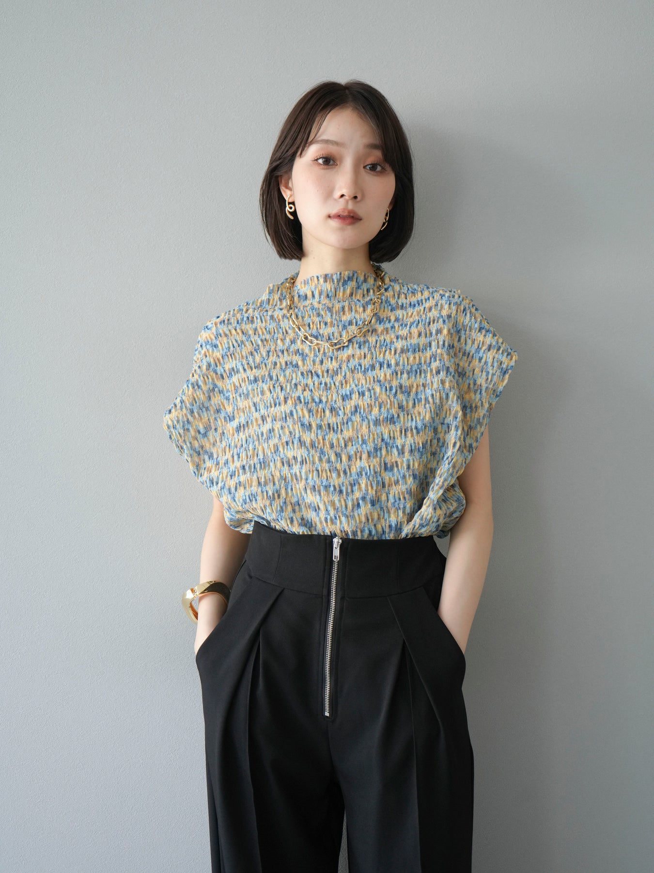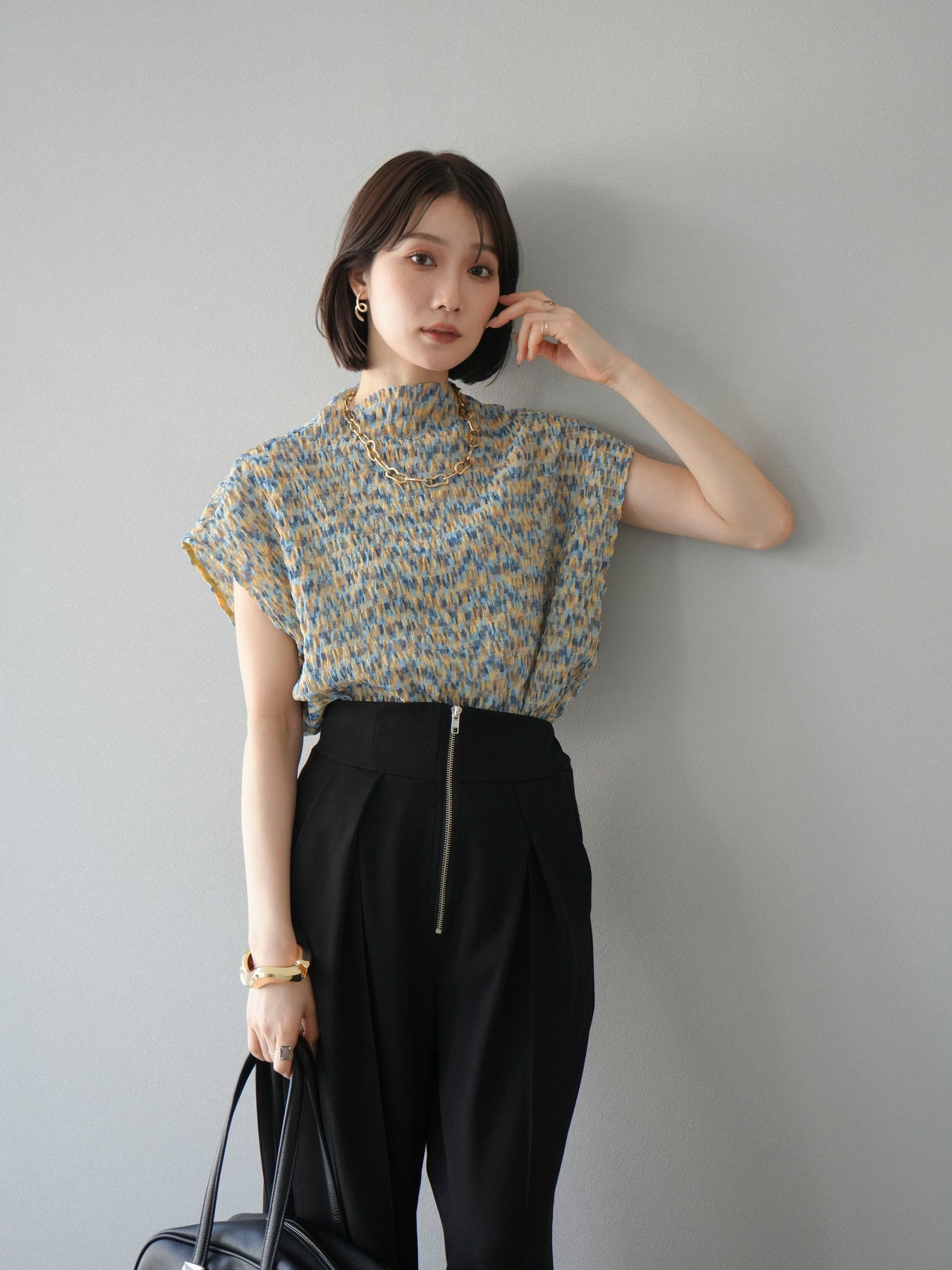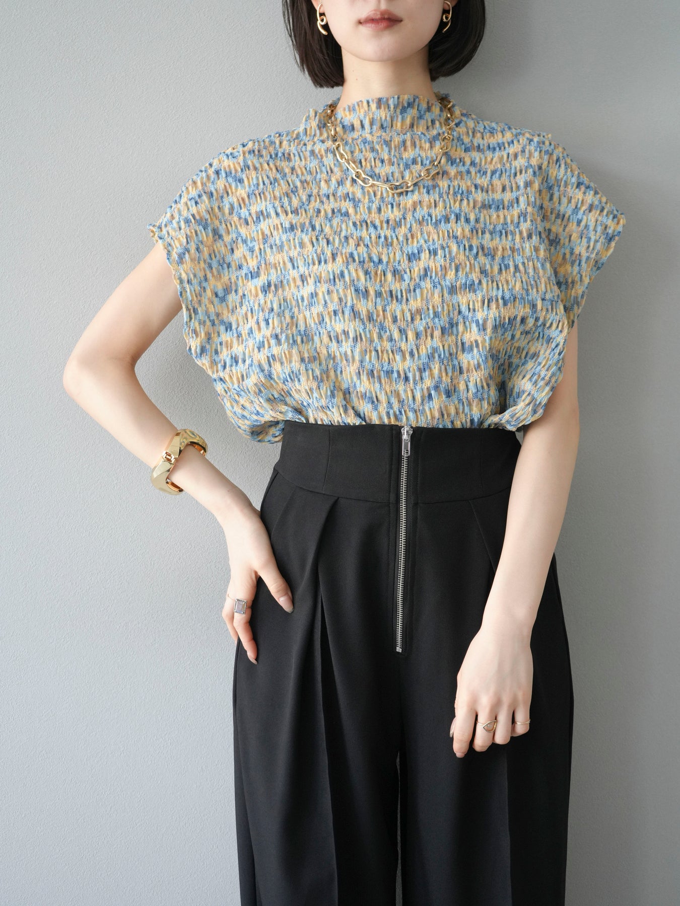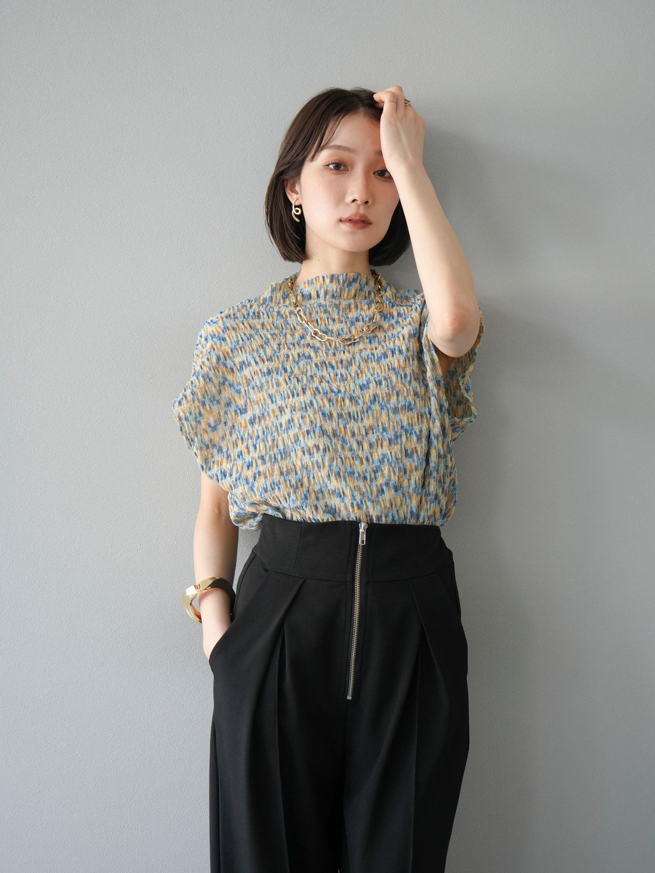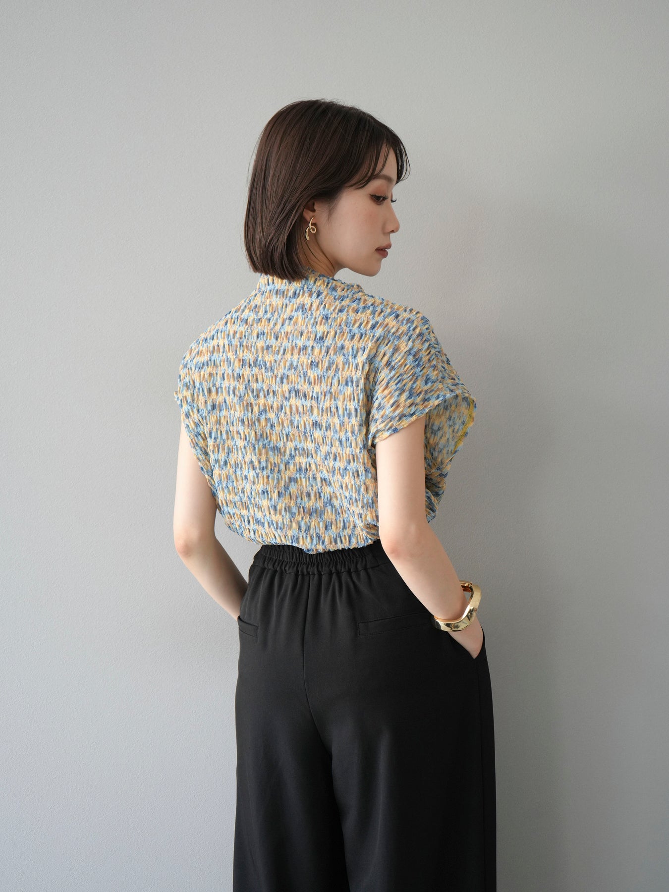 多色隨意褶法式上衣,擁有細膩的隨意褶皺和華麗的多色圖案。富有表現力的凹凸感和輕盈的質感,是單穿也十分好看的簡約單品。法式袖設計略帶休閒感,恰到好處地遮蓋了令人煩惱的手臂區域。彈性布料穿著舒適,可搭配牛仔褲、裙子等各種下裝。這件單品能為您的夏季造型增添亮點。 *除下裝及吊帶背心(內搭)外,其他商品皆不包含內搭。