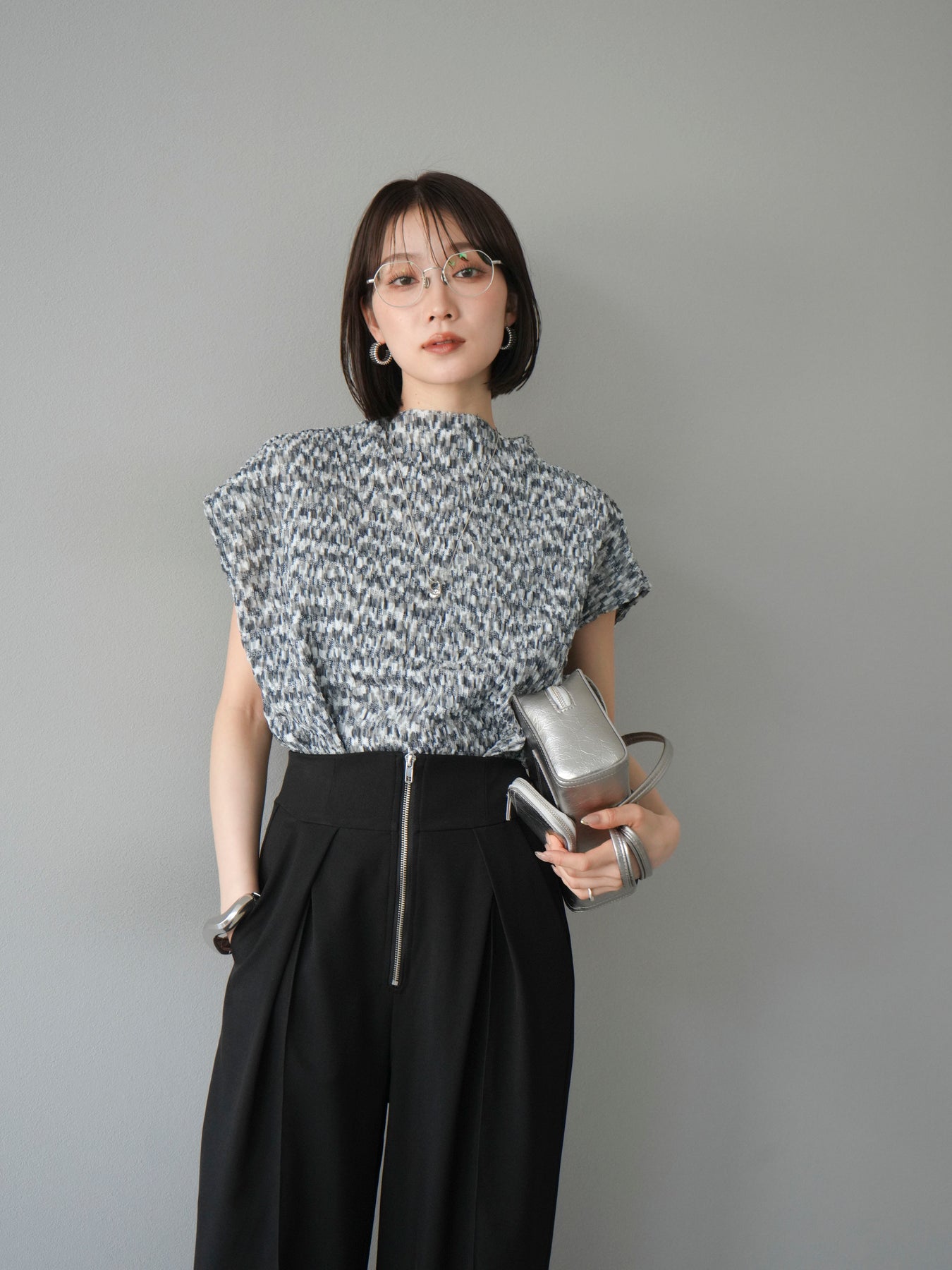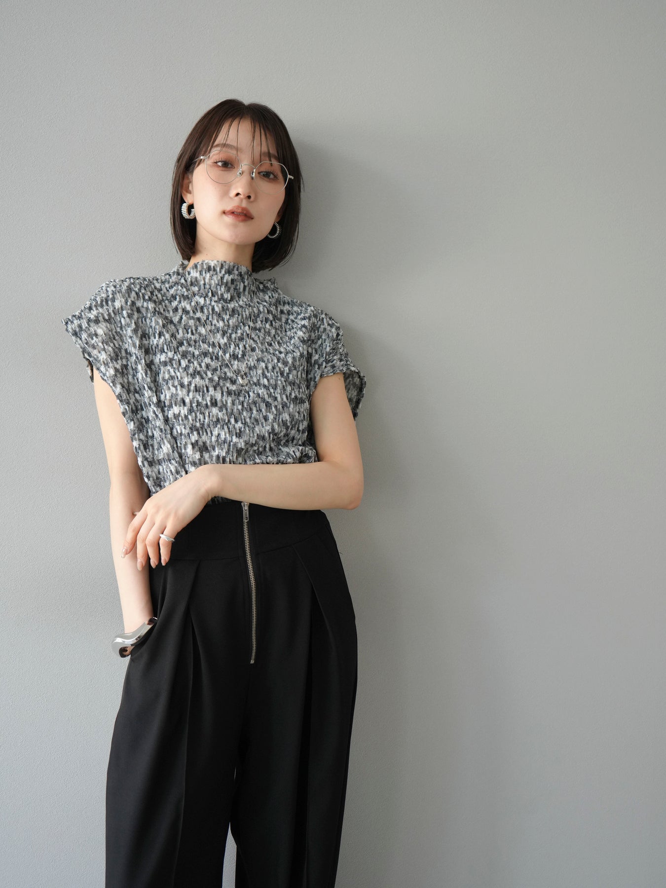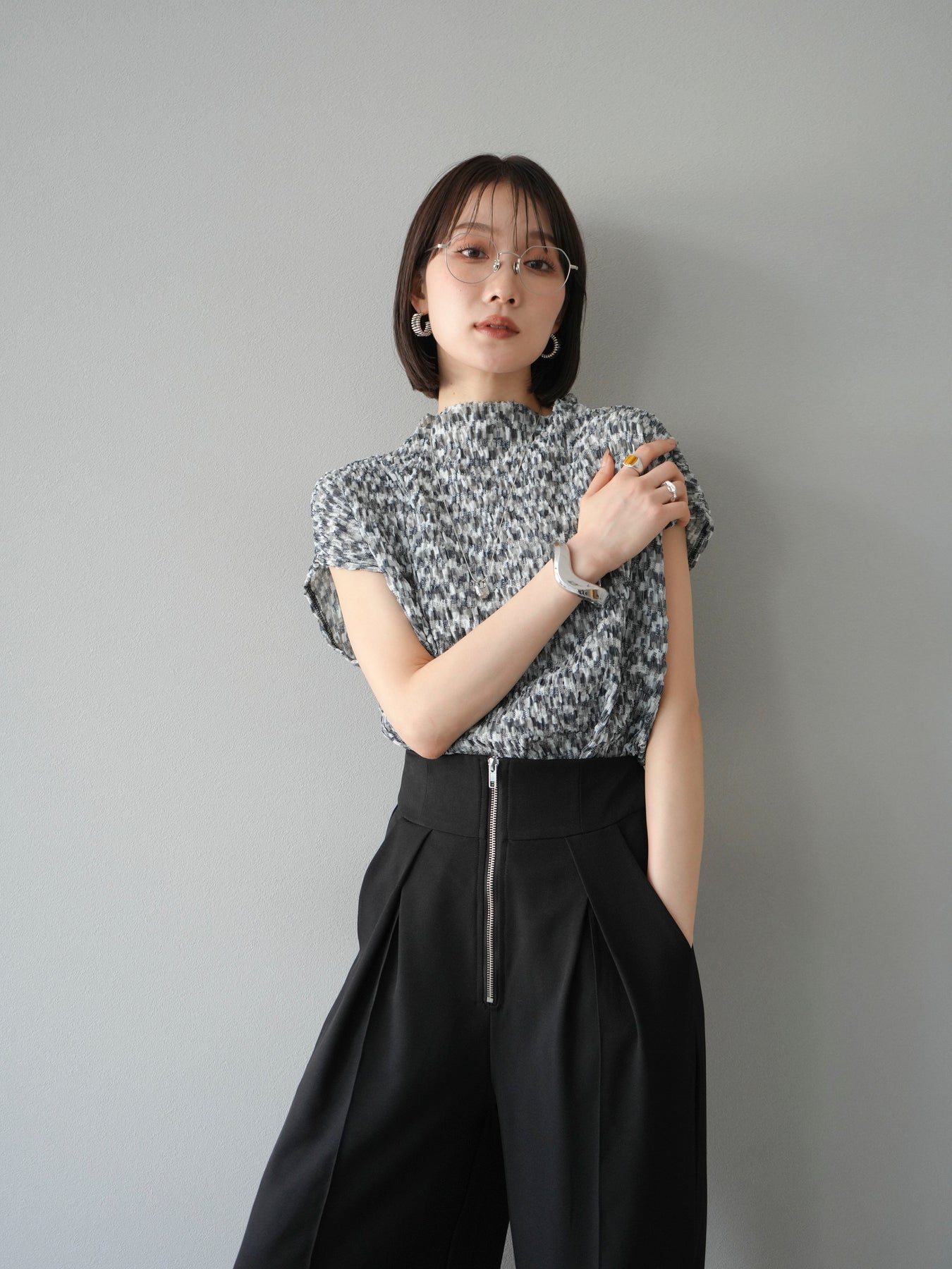 這款時尚寬褲搭配搶眼的前拉鍊設計。高腰設計與立體收腰輪廓帶來極佳的顯瘦效果。設計充滿現代感,但垂墜感的布料更顯女性柔美。即使搭配簡單的上衣,也能打造出精緻的造型。 *除下裝及吊帶背心(內衣)外,所有商品均為固定價格,不含內衣。