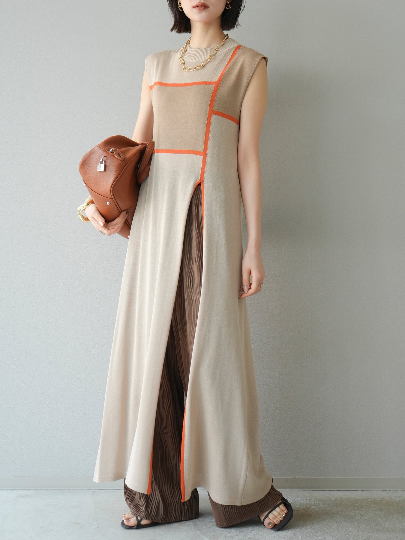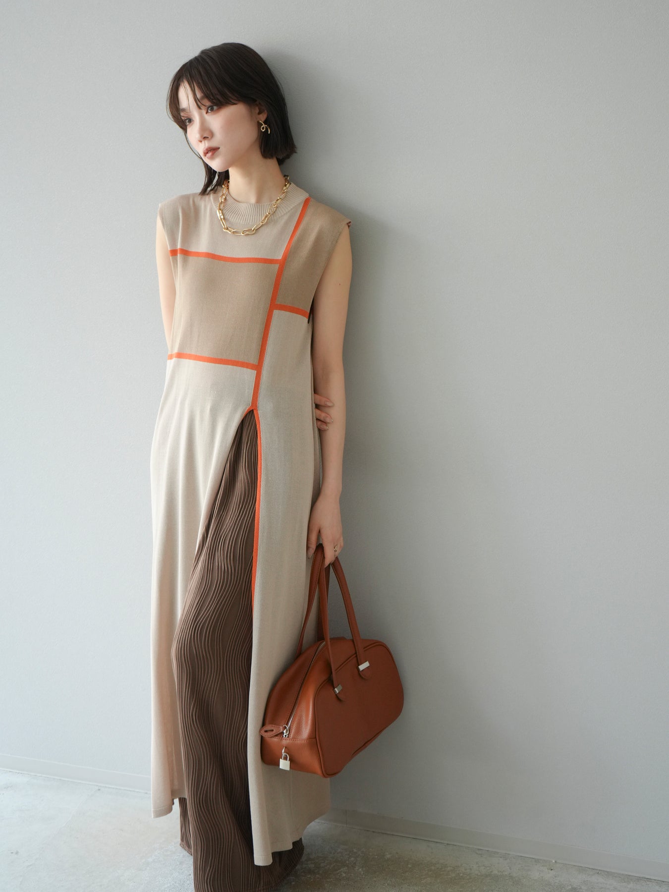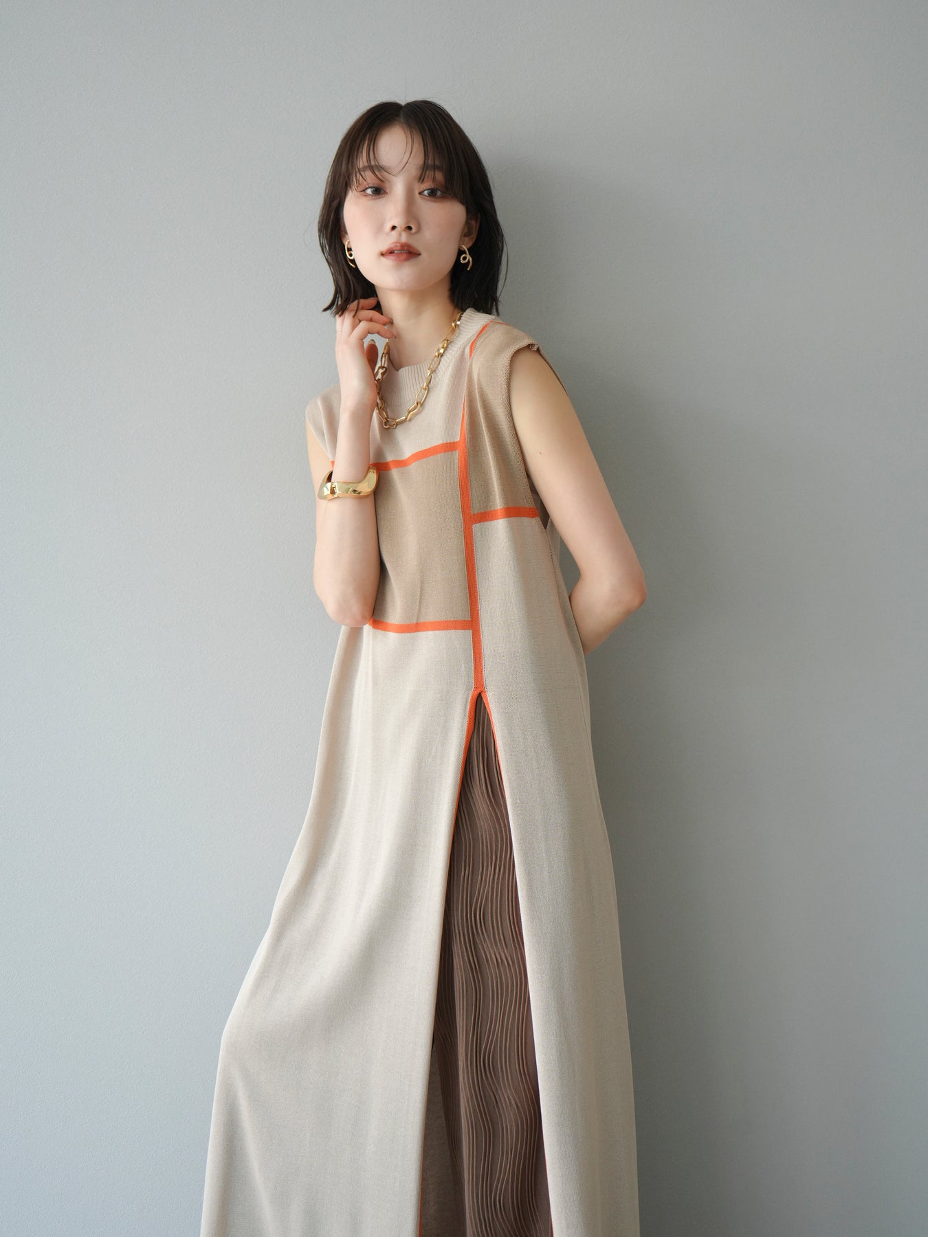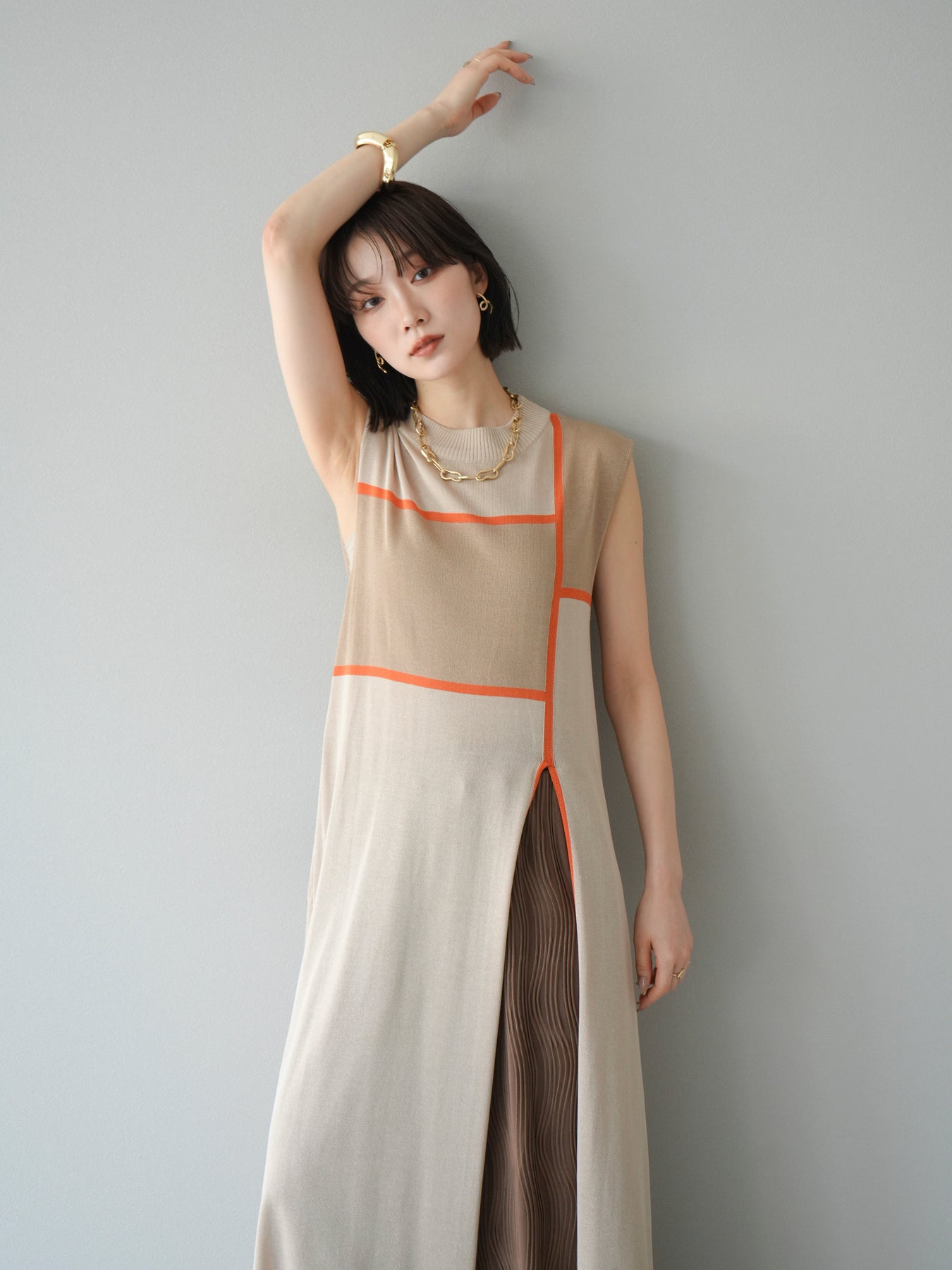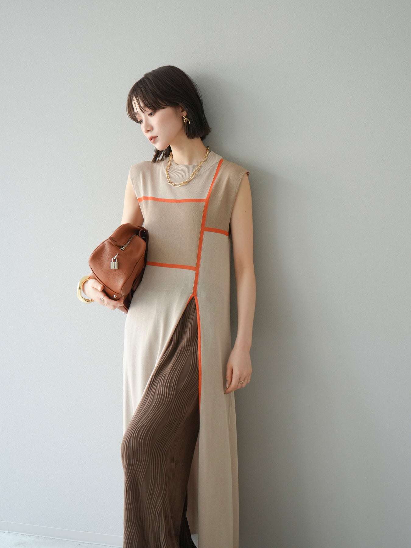 大膽搶眼的撞色針織洋裝。採用輕盈的透明針織布料,適度的透明度營造出春夏的氛圍。藝術感十足的配色方案引人注目,本身就極具視覺衝擊力。兩側的深開衩設計,方便活動,並帶來層疊穿搭的樂趣。時尚與休閒兼具,非常適合搭配褲子或吊帶裙。 *除下裝和吊帶裙(內衣)外,其他商品均不含內衣。