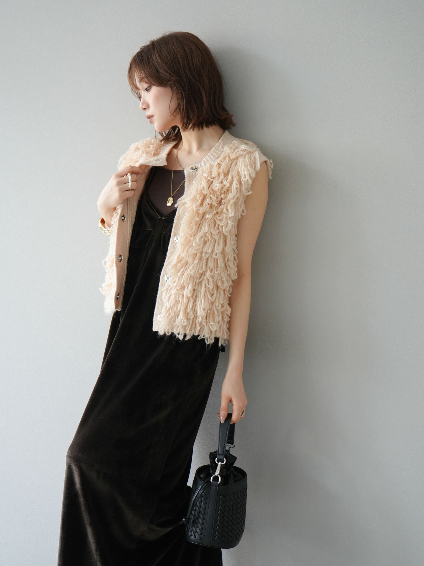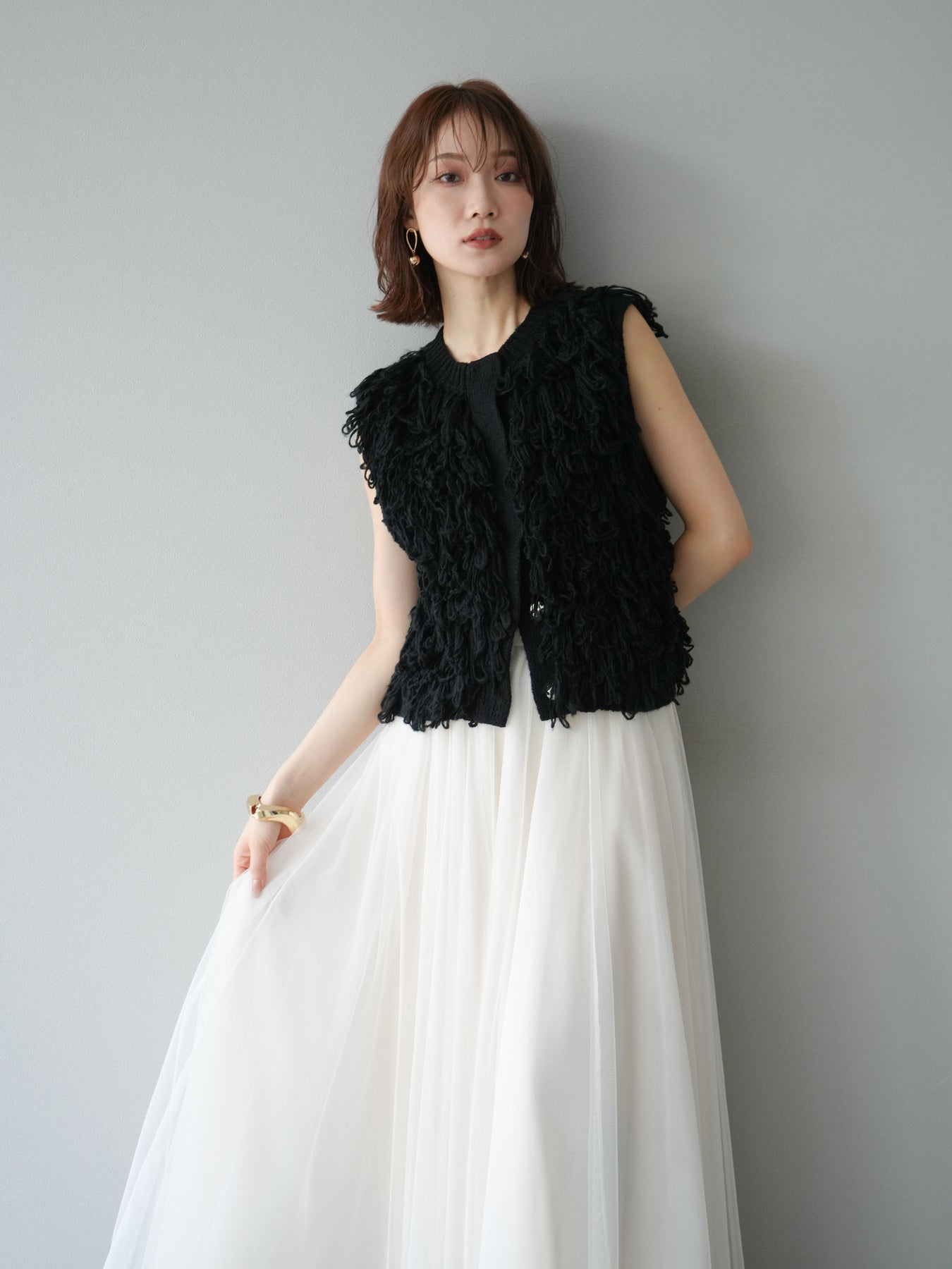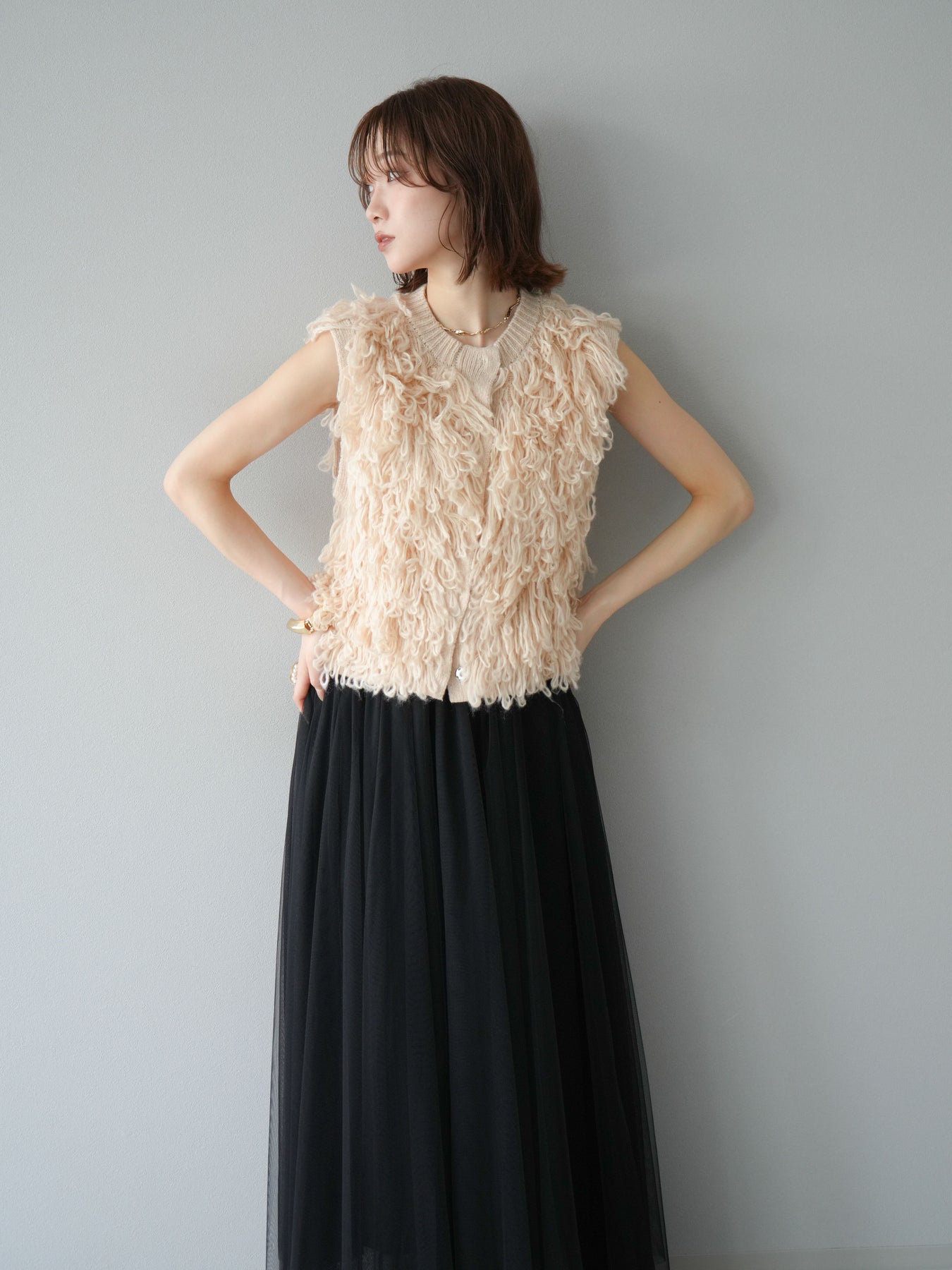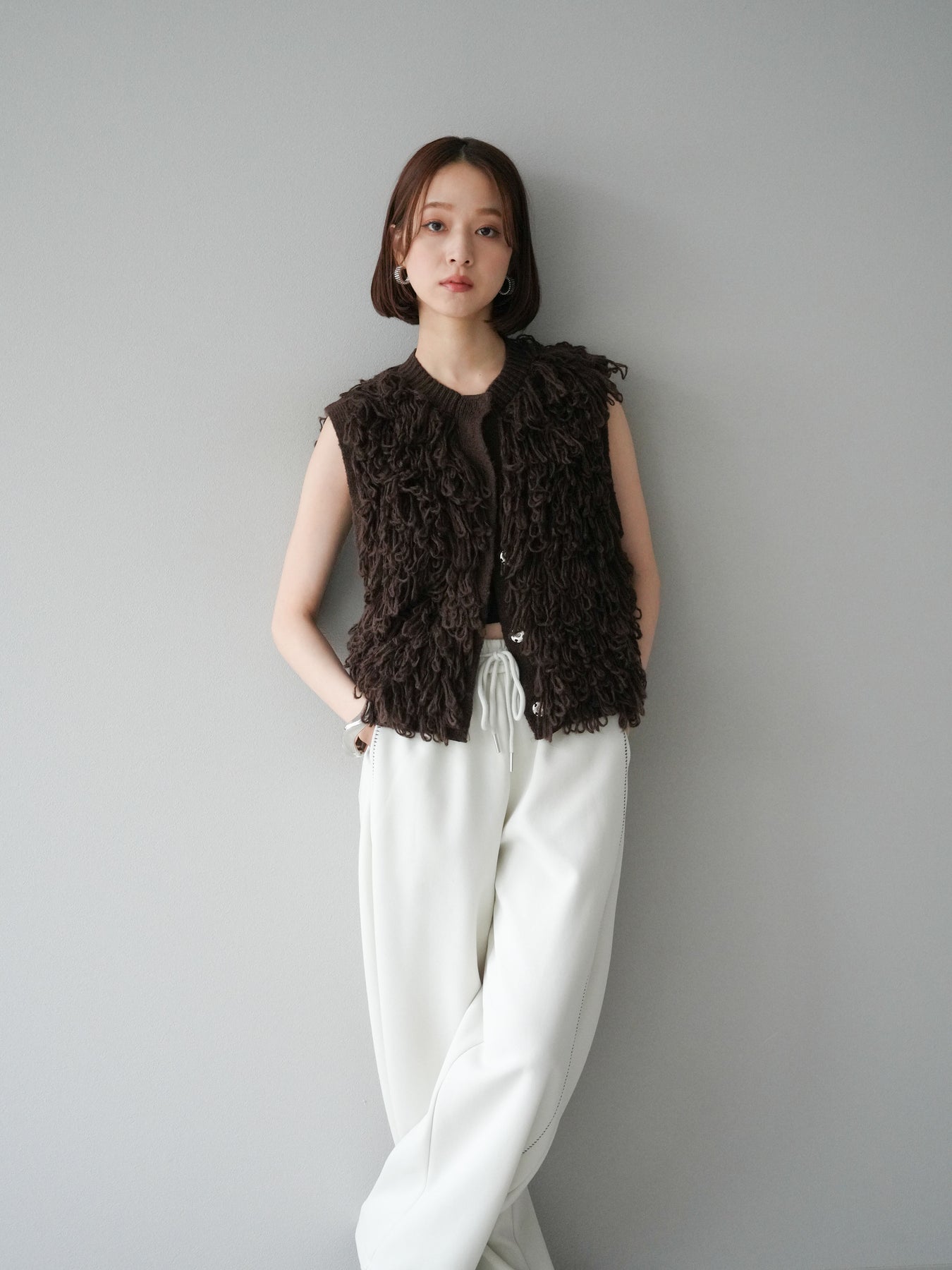 這款背心正面採用立體環狀針織。寬鬆的針織設計格外醒目,內搭簡潔的內搭也能為整體造型增添一抹優雅。正面配有連結,方便穿脫;敞開穿著時可展現休閒感,閉合穿著時則可展現俐落幹練的氣質。長度適中,可輕鬆搭配從褲裝到裙裝的各種下裝。換季時可作為輕薄的外搭,秋冬時可作為層疊造型的點綴,是一款四季皆宜的百搭單品。 *除下裝及吊帶背心(內搭)外,其他商品皆不包含內搭。