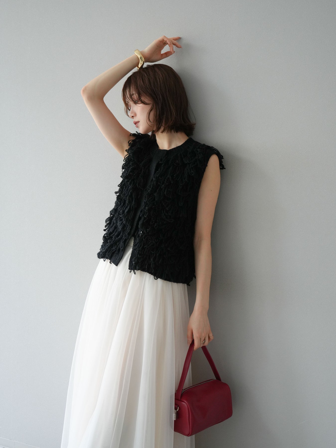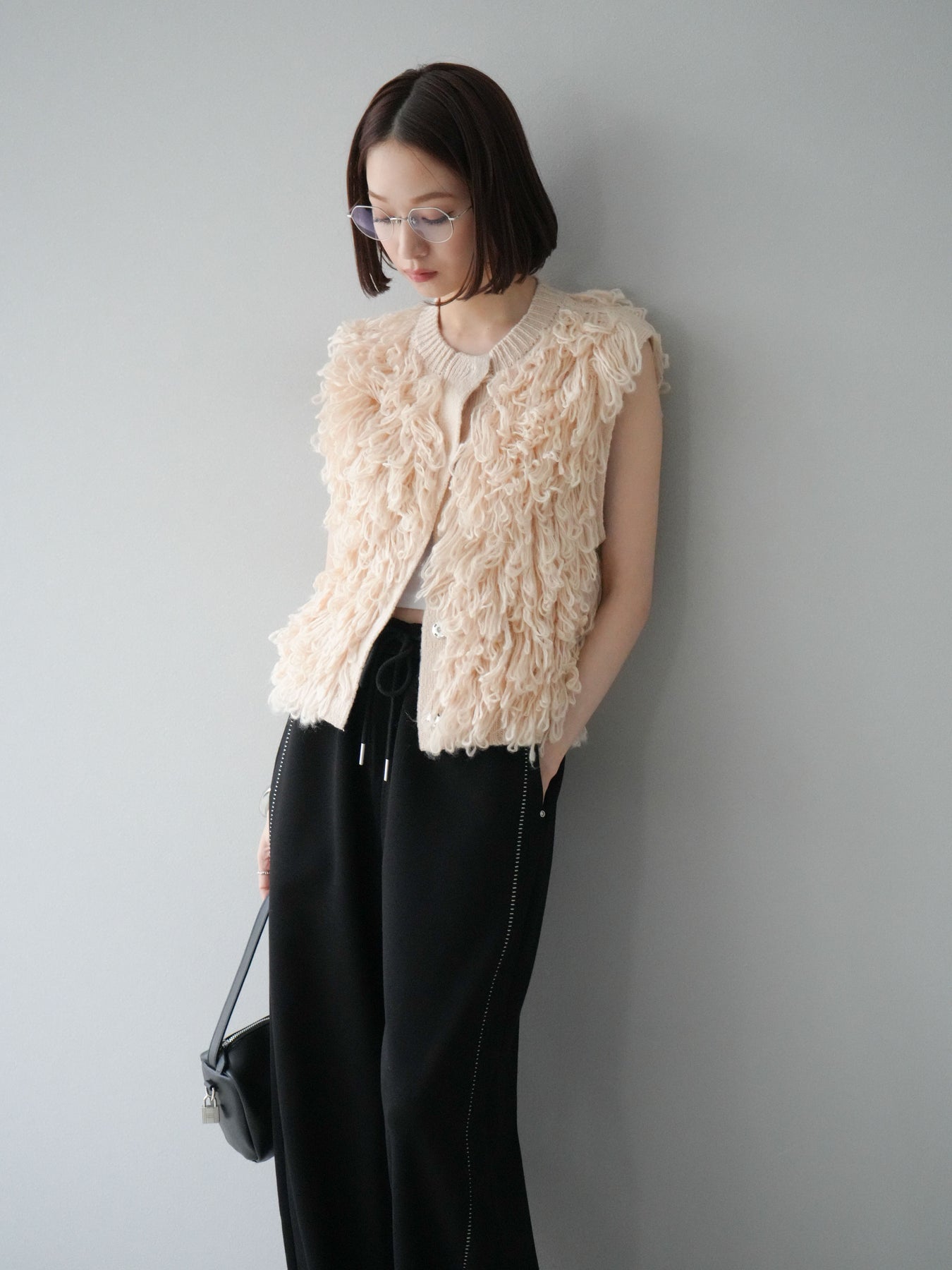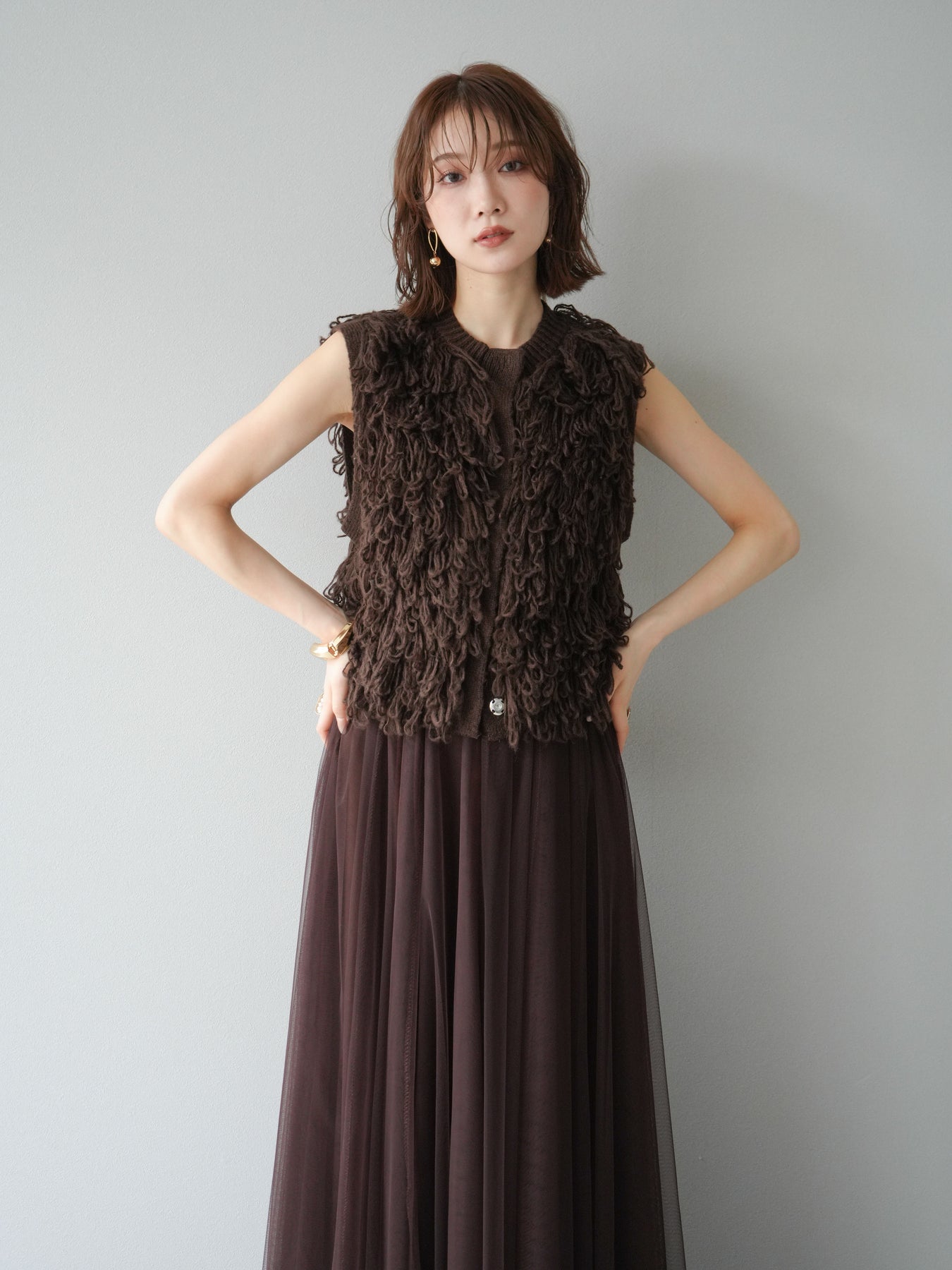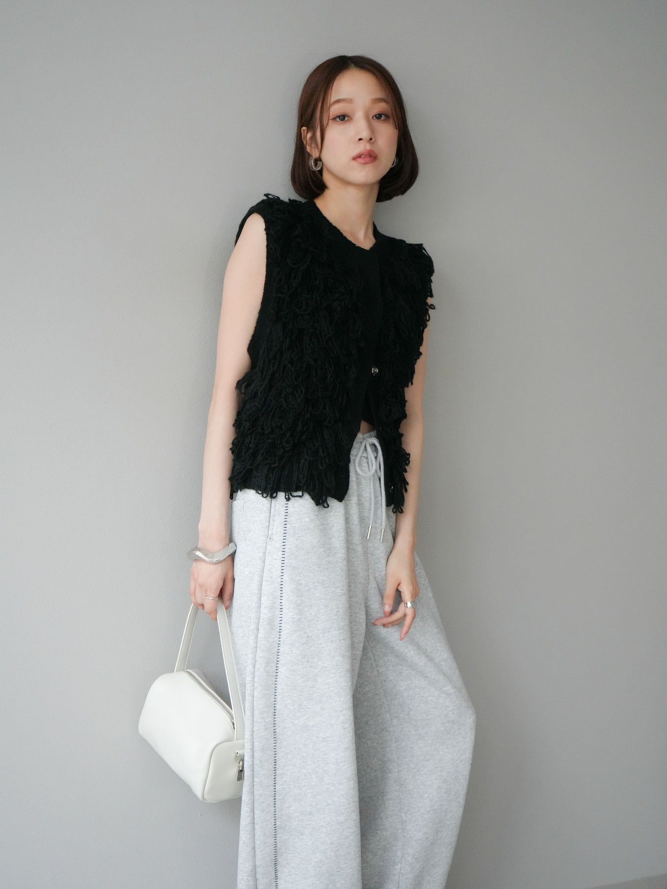 這款背心正面採用立體環狀針織。寬鬆的針織設計格外醒目,內搭簡潔的內搭也能為整體造型增添一抹優雅。正面配有連結,方便穿脫;敞開穿著時可展現休閒感,閉合穿著時則可展現俐落幹練的氣質。長度適中,可輕鬆搭配從褲裝到裙裝的各種下裝。換季時可作為輕薄的外搭,秋冬時可作為層疊造型的點綴,是一款四季皆宜的百搭單品。 *除下裝及吊帶背心(內搭)外,其他商品皆不包含內搭。