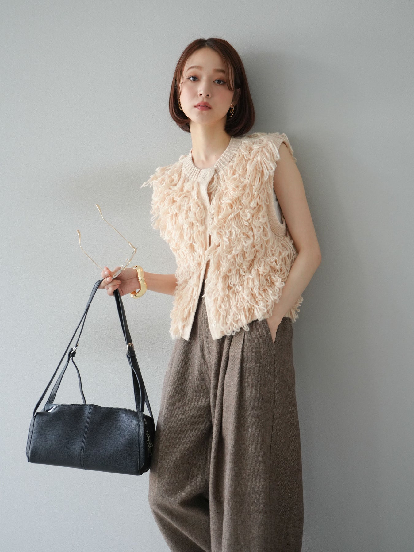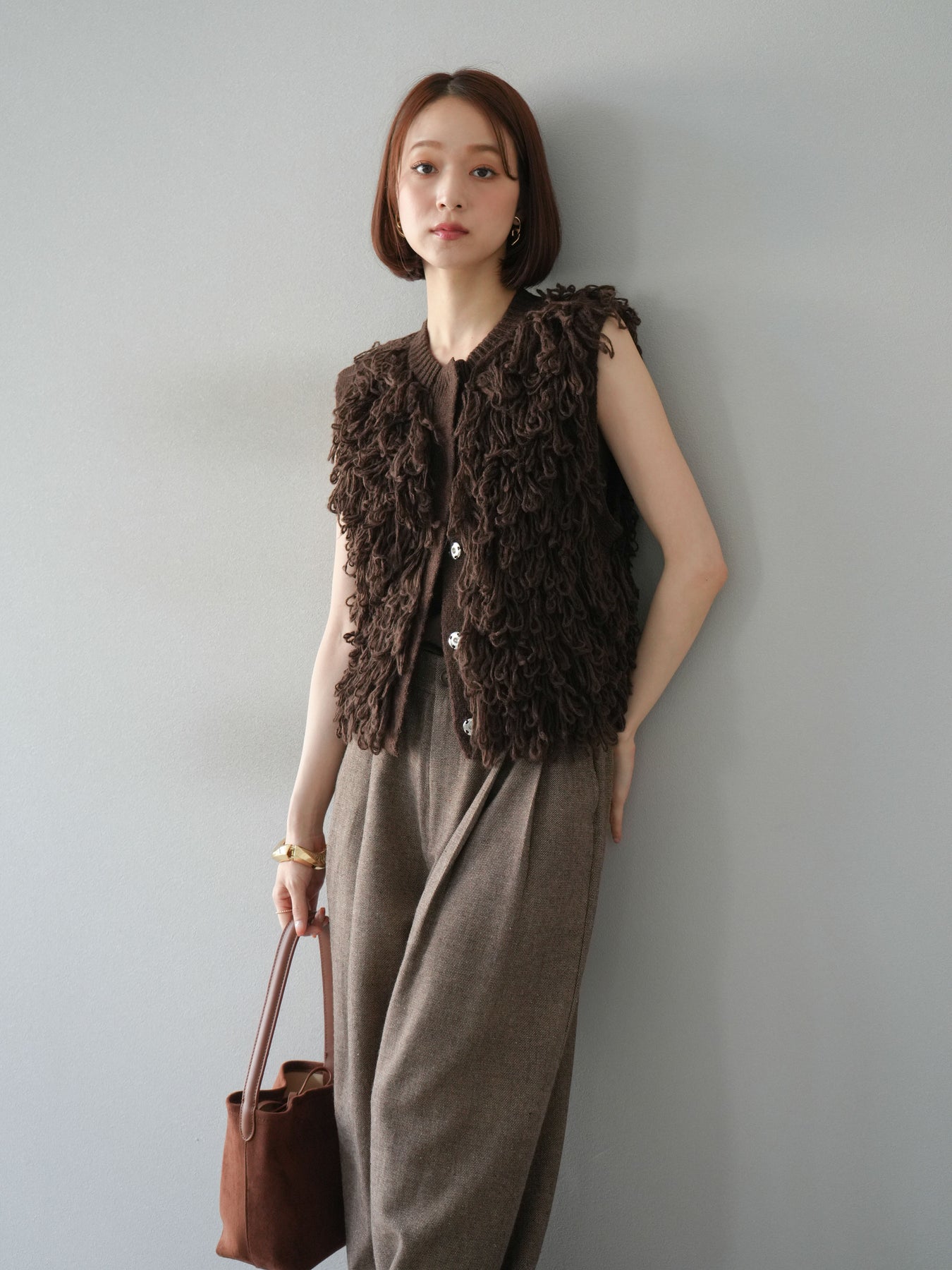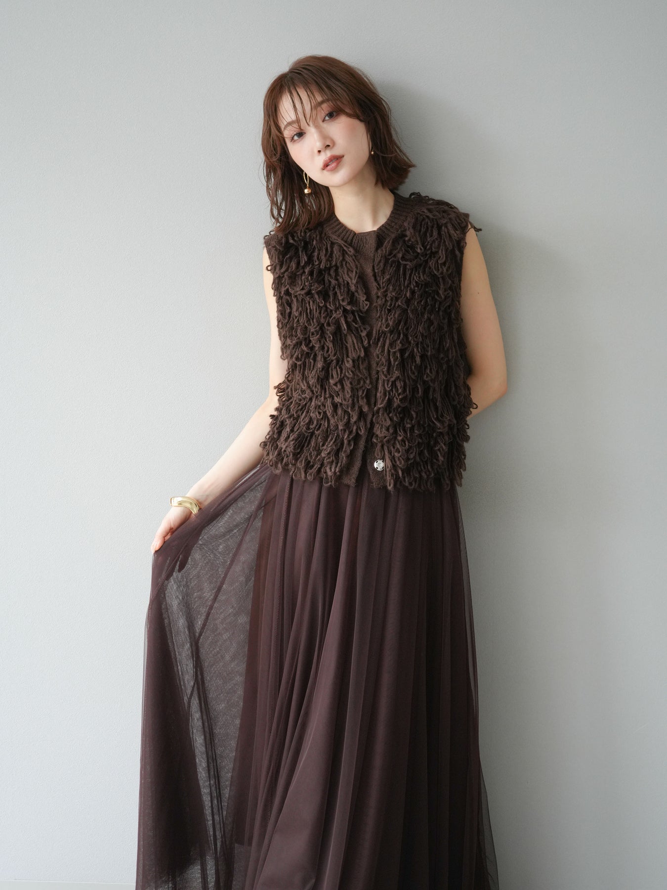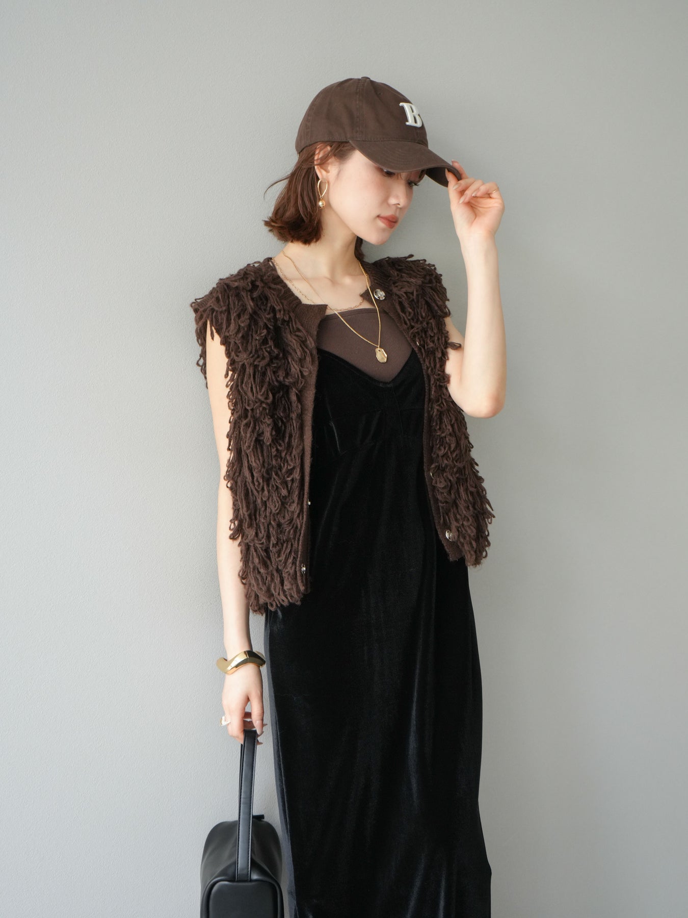 這款背心正面採用立體環狀針織。寬鬆的針織設計格外醒目,內搭簡潔的內搭也能為整體造型增添一抹優雅。正面配有連結,方便穿脫;敞開穿著時可展現休閒感,閉合穿著時則可展現俐落幹練的氣質。長度適中,可輕鬆搭配從褲裝到裙裝的各種下裝。換季時可作為輕薄的外搭,秋冬時可作為層疊造型的點綴,是一款四季皆宜的百搭單品。 *除下裝及吊帶背心(內搭)外,其他商品皆不包含內搭。
