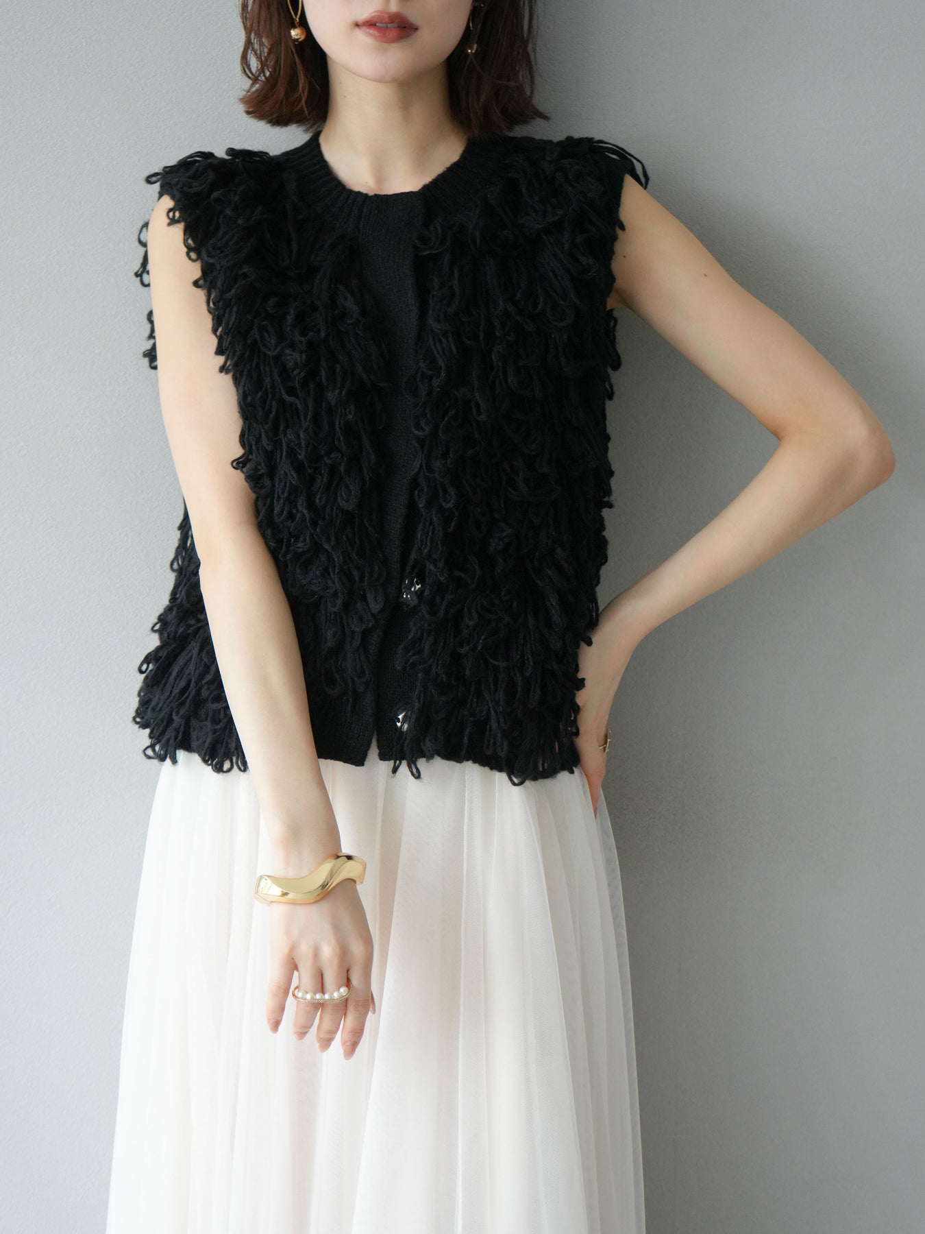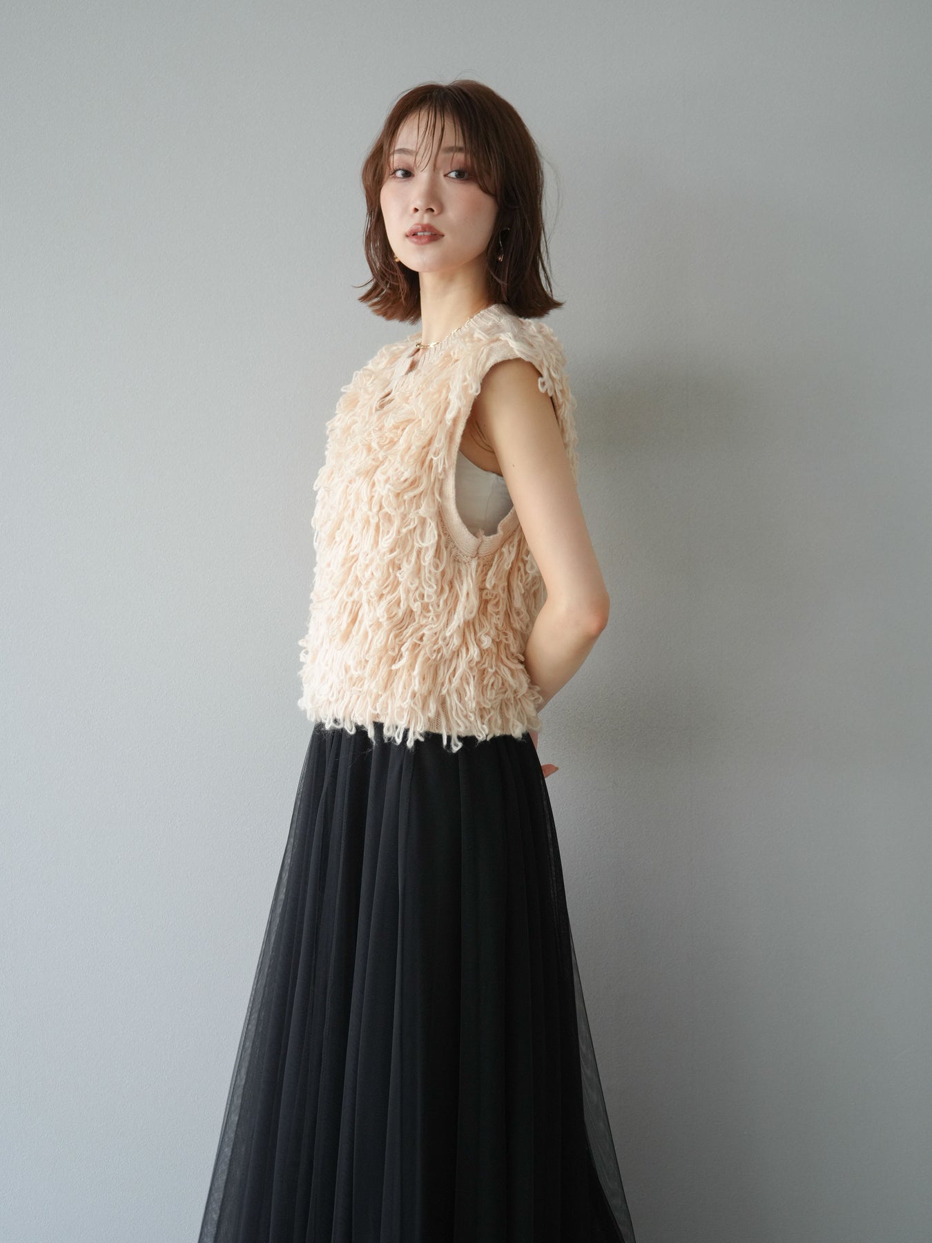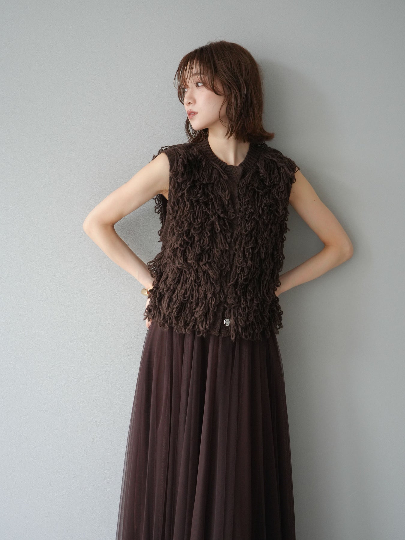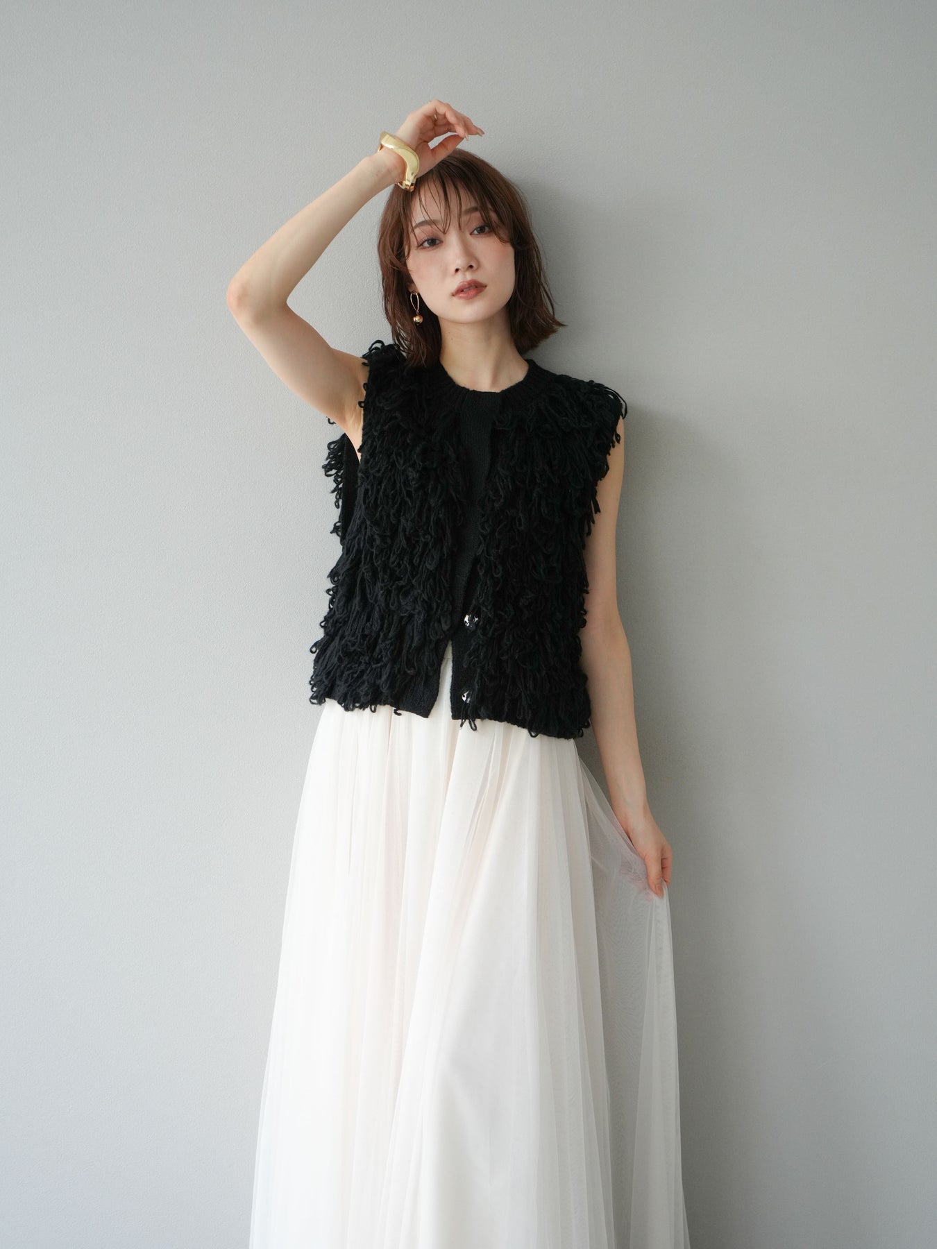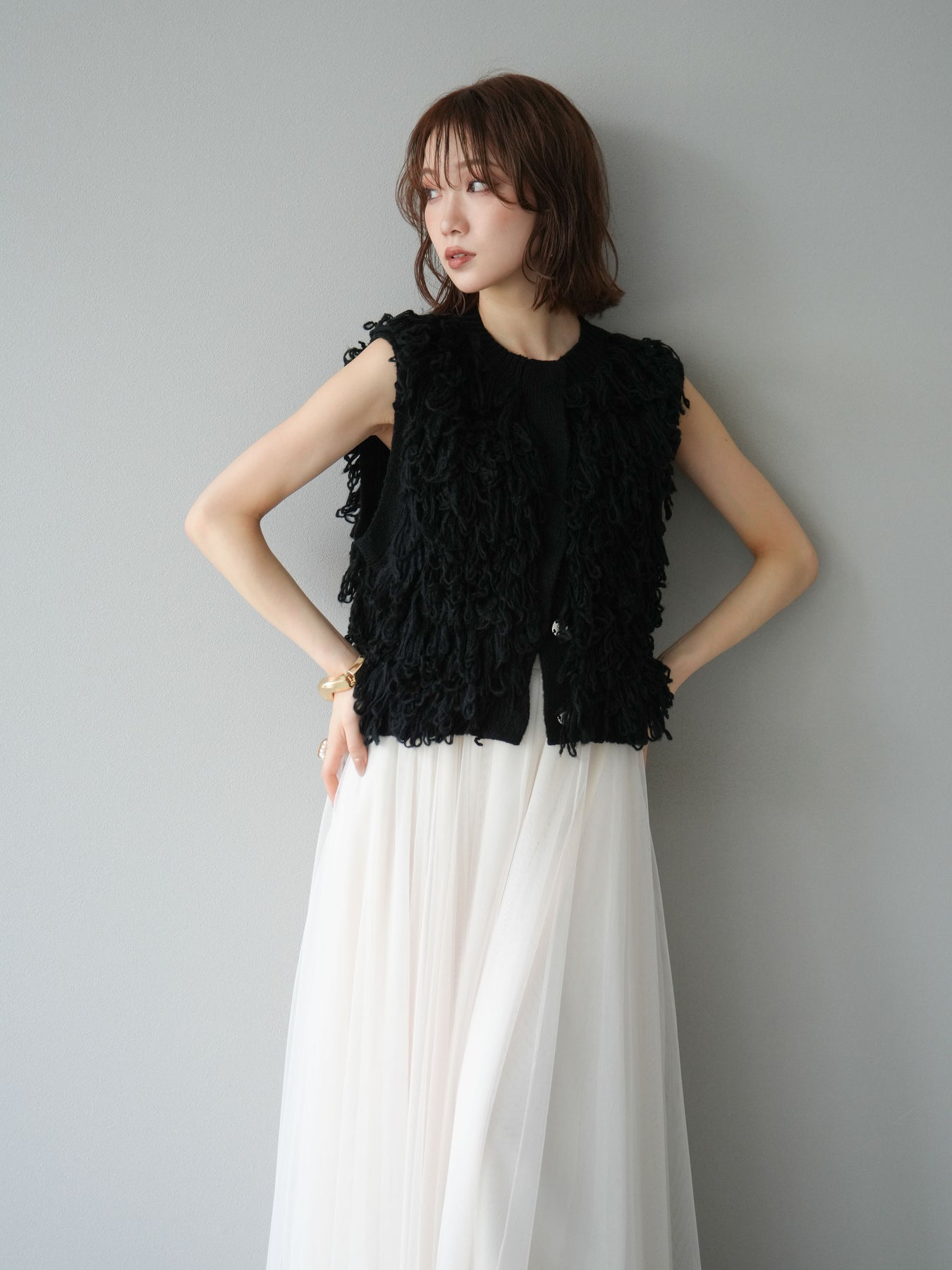 這款背心正面採用立體環狀針織。寬鬆的針織設計格外醒目,內搭簡潔的內搭也能為整體造型增添一抹優雅。正面配有連結,方便穿脫;敞開穿著時可展現休閒感,閉合穿著時則可展現俐落幹練的氣質。長度適中,可輕鬆搭配從褲裝到裙裝的各種下裝。換季時可作為輕薄的外搭,秋冬時可作為層疊造型的點綴,是一款四季皆宜的百搭單品。 *除下裝及吊帶背心(內搭)外,其他商品皆不包含內搭。