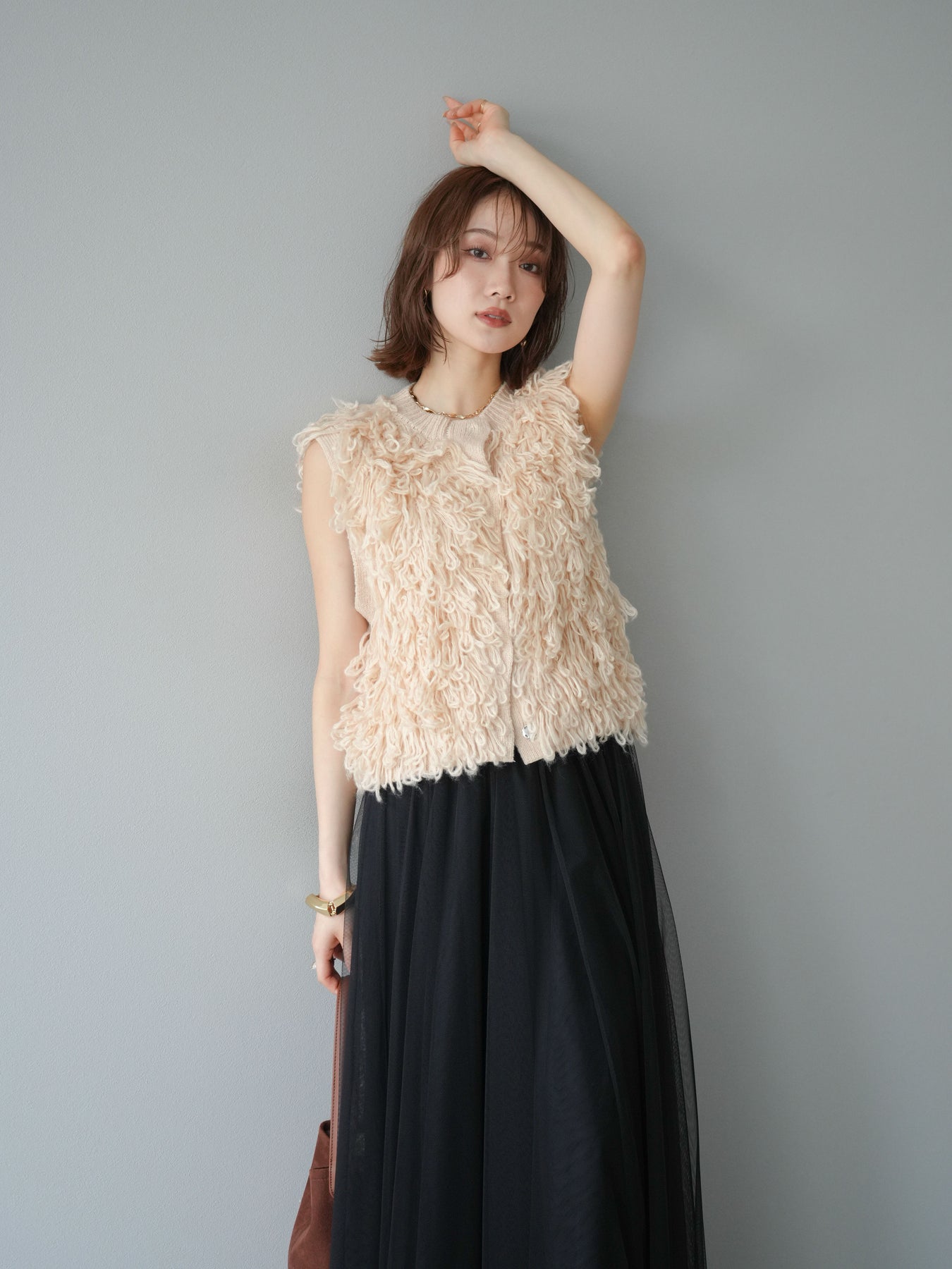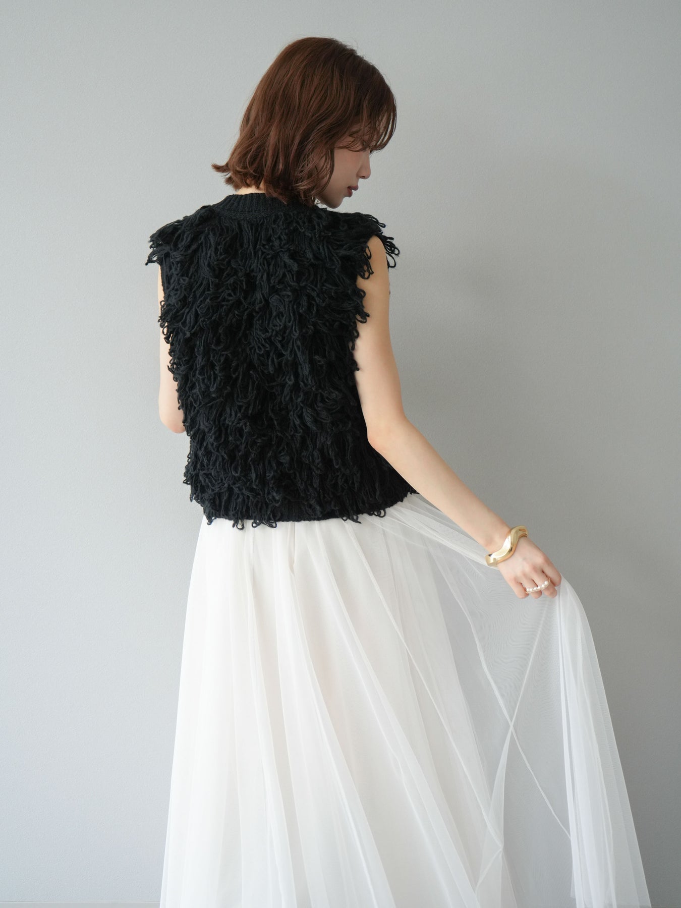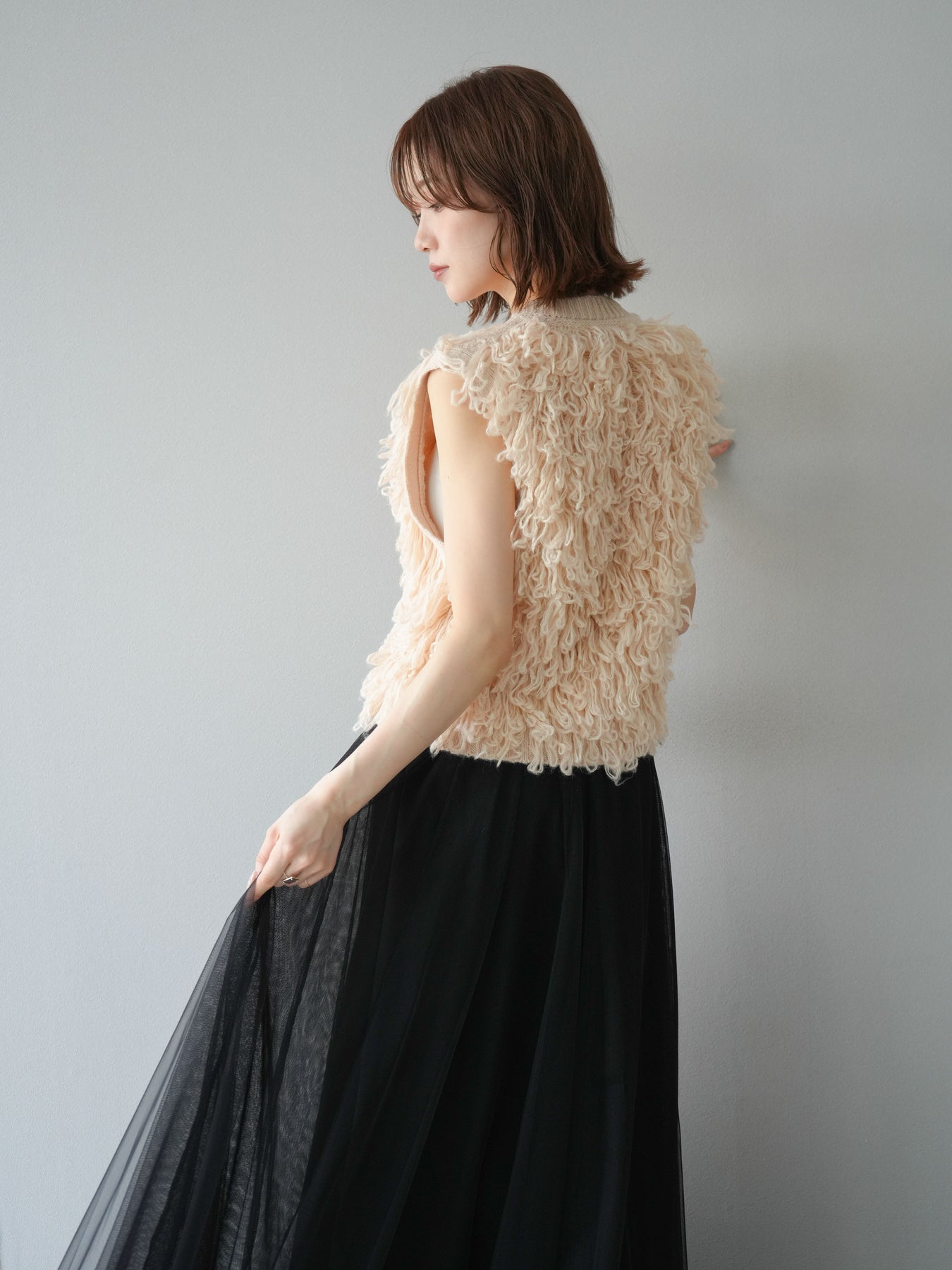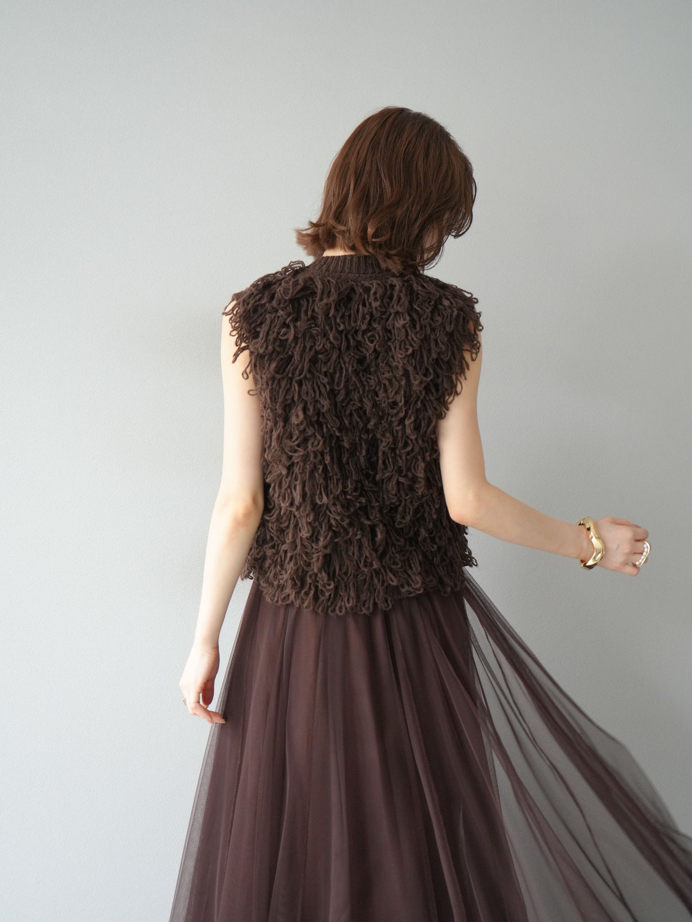 這款背心正面採用立體環狀針織。寬鬆的針織設計格外醒目,內搭簡潔的內搭也能為整體造型增添一抹優雅。正面配有連結,方便穿脫;敞開穿著時可展現休閒感,閉合穿著時則可展現俐落幹練的氣質。長度適中,可輕鬆搭配從褲裝到裙裝的各種下裝。換季時可作為輕薄的外搭,秋冬時可作為層疊造型的點綴,是一款四季皆宜的百搭單品。 *除下裝及吊帶背心(內搭)外,其他商品皆不包含內搭。