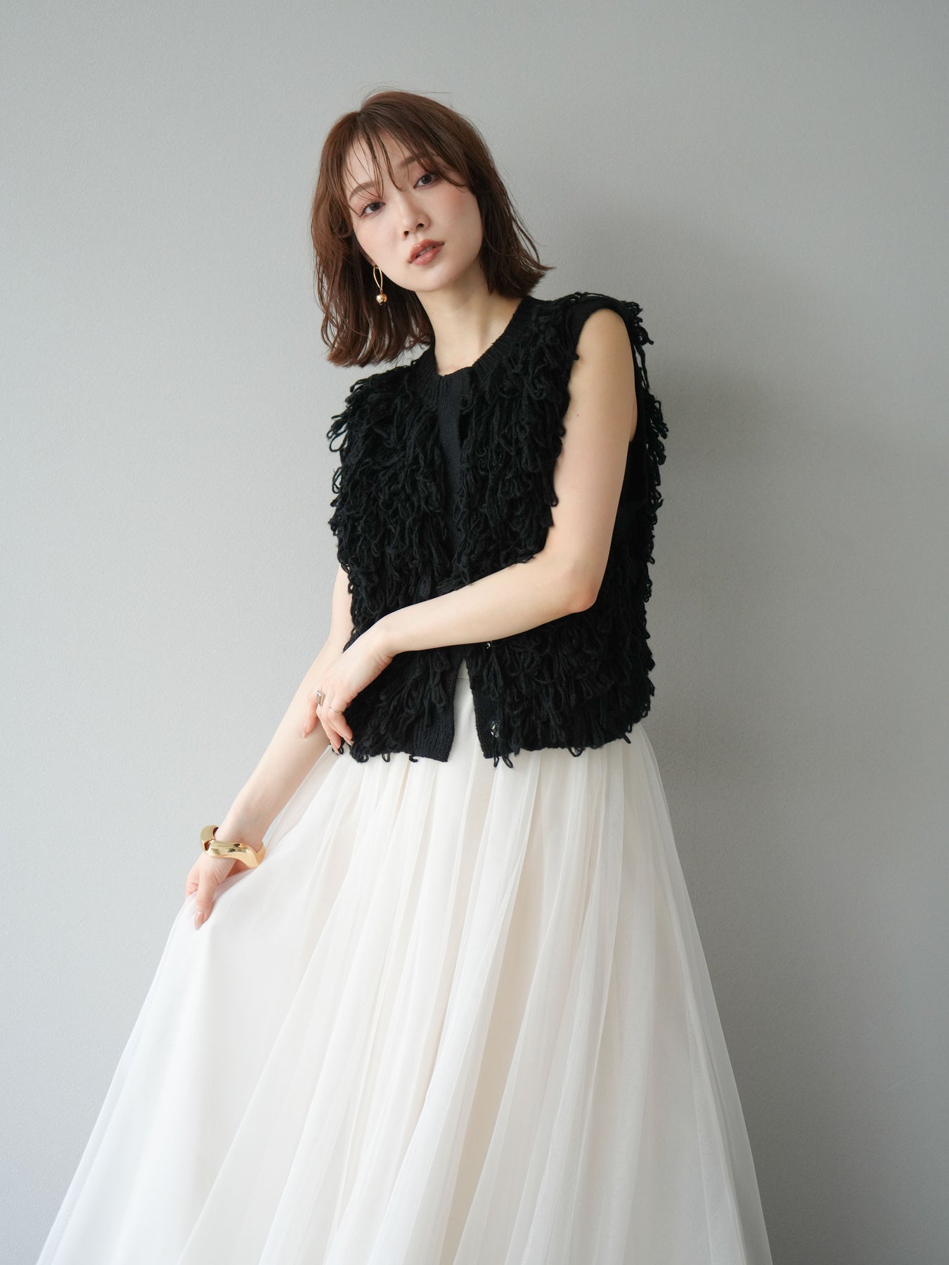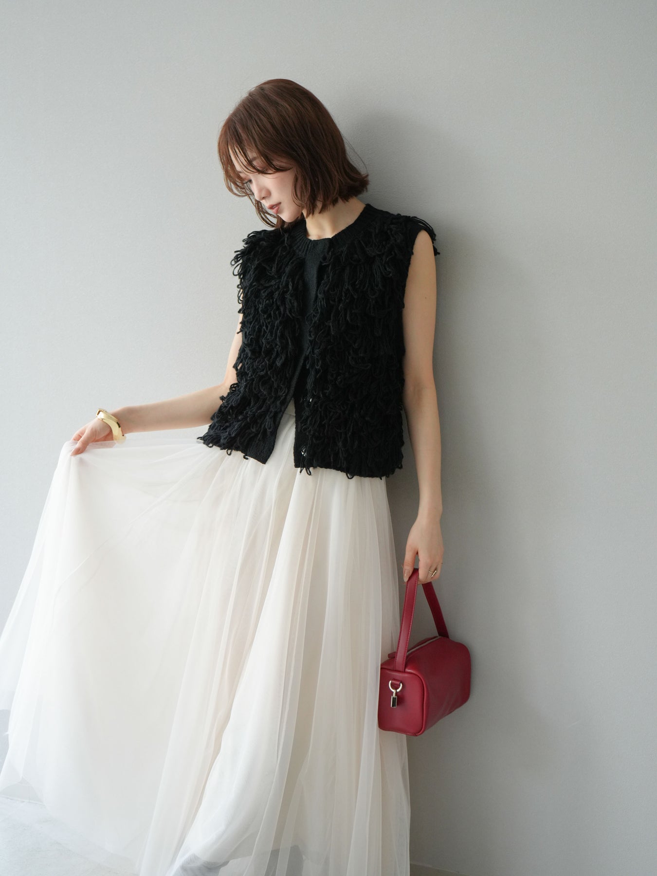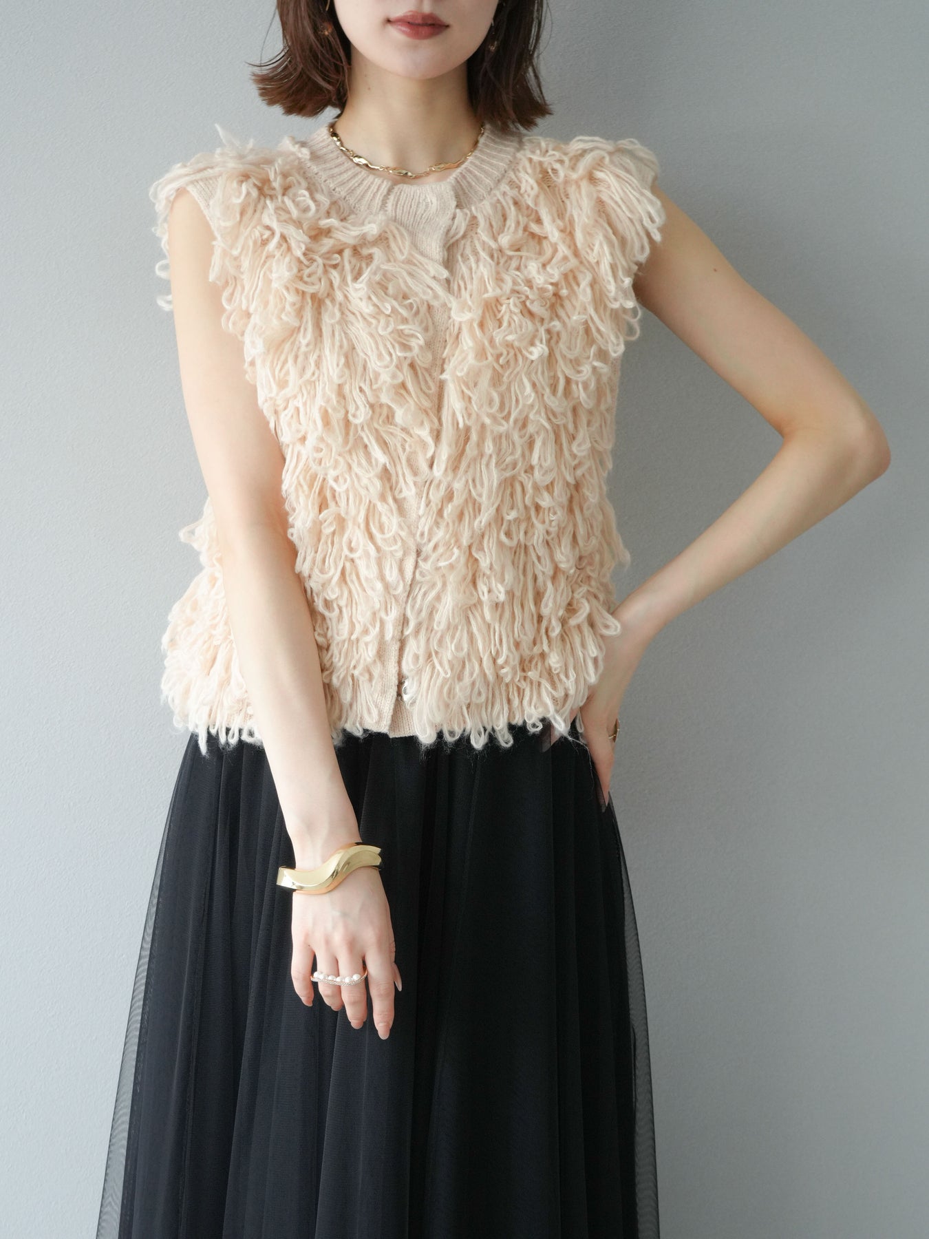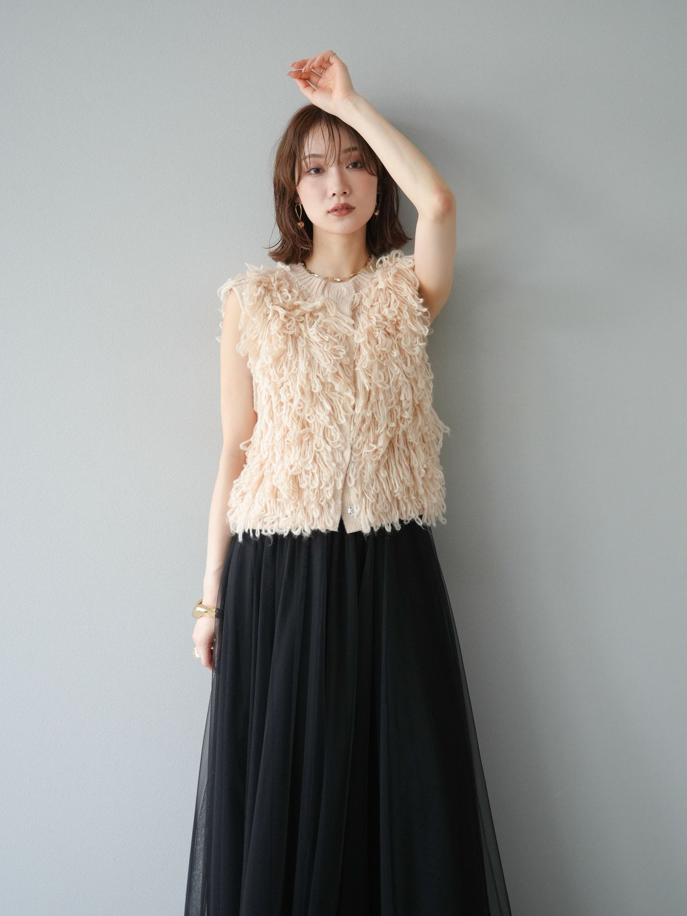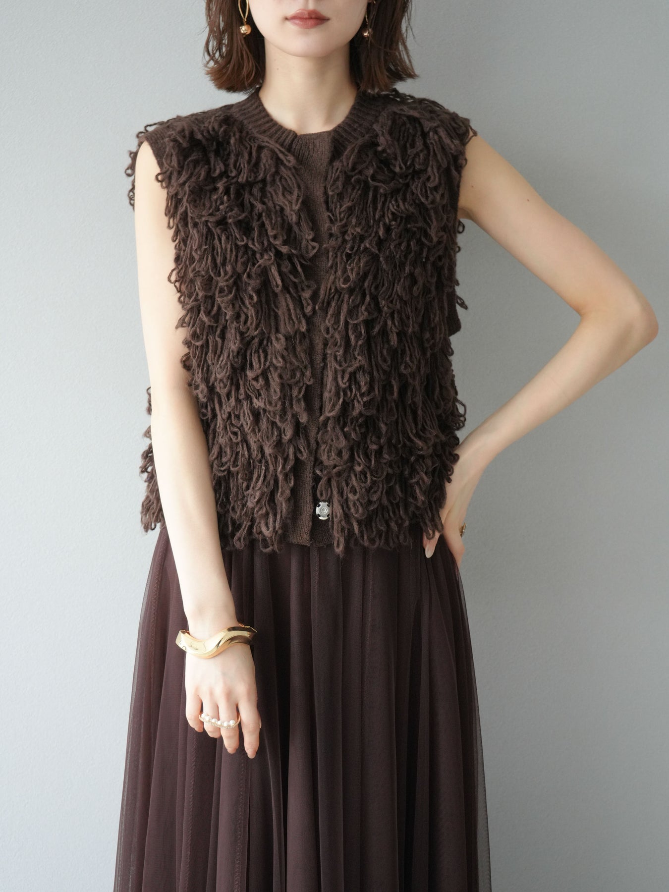 這款背心正面採用立體環狀針織。寬鬆的針織設計格外醒目,內搭簡潔的內搭也能為整體造型增添一抹優雅。正面配有連結,方便穿脫;敞開穿著時可展現休閒感,閉合穿著時則可展現俐落幹練的氣質。長度適中,可輕鬆搭配從褲裝到裙裝的各種下裝。換季時可作為輕薄的外搭,秋冬時可作為層疊造型的點綴,是一款四季皆宜的百搭單品。 *除下裝及吊帶背心(內搭)外,其他商品皆不包含內搭。