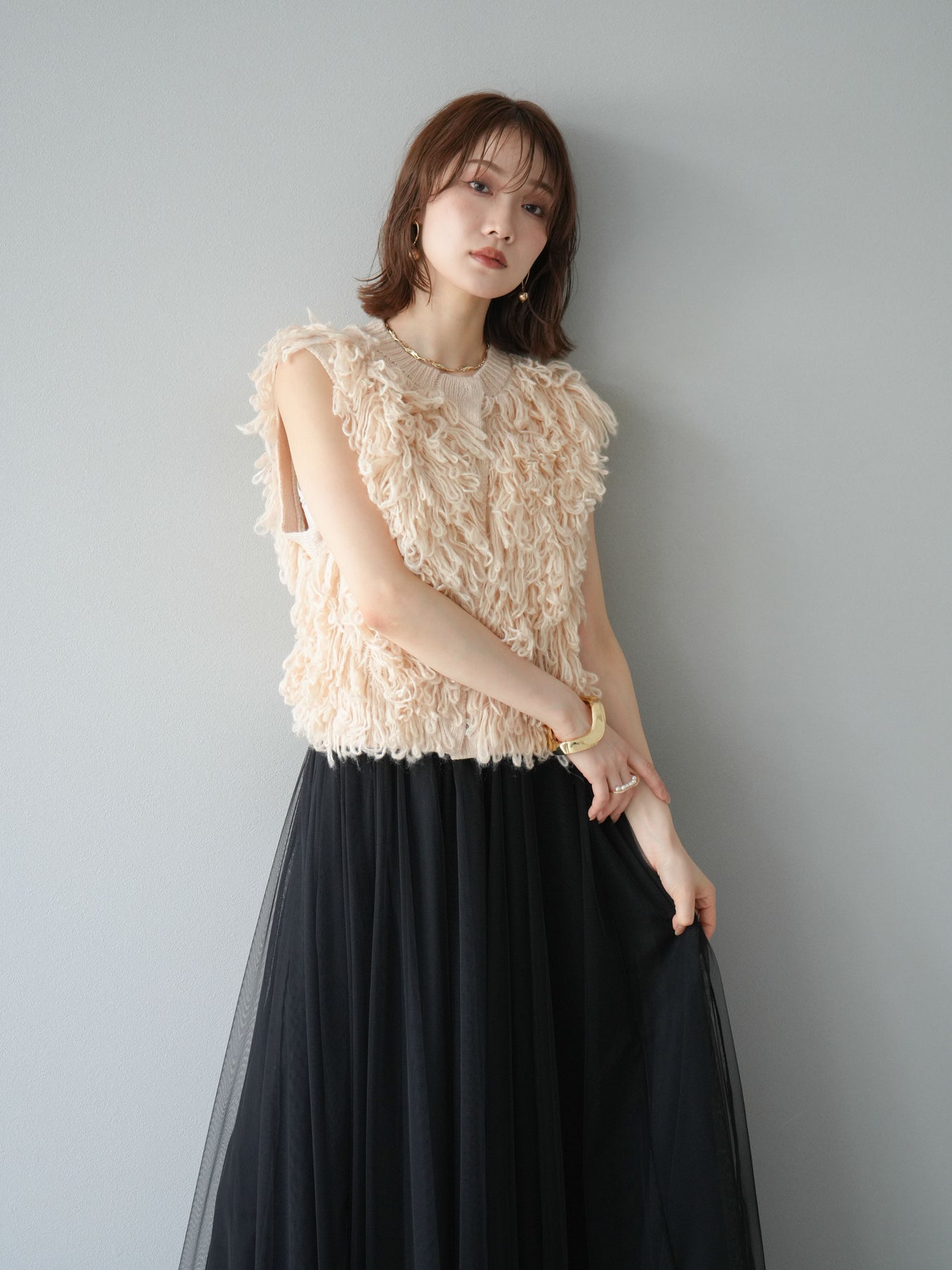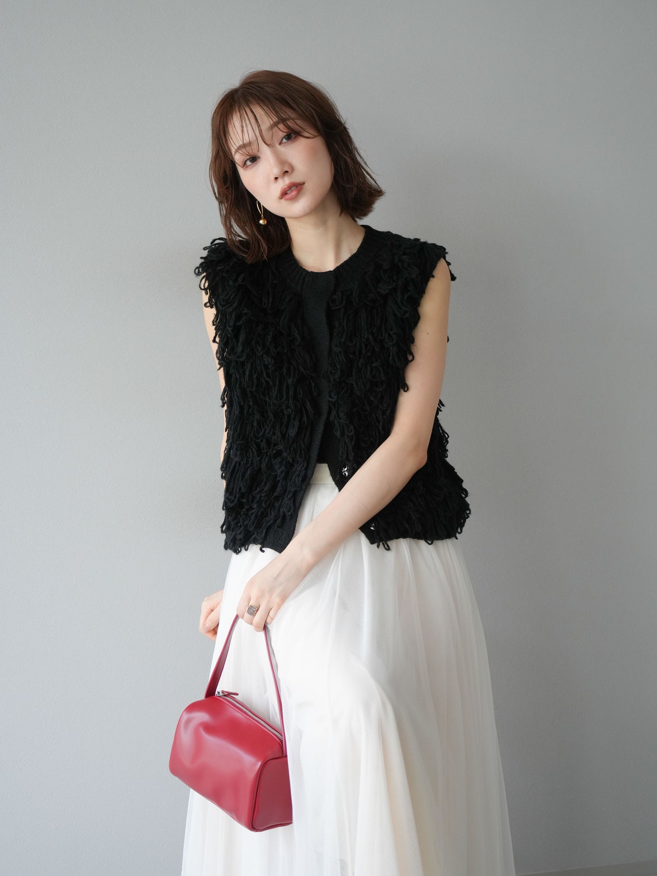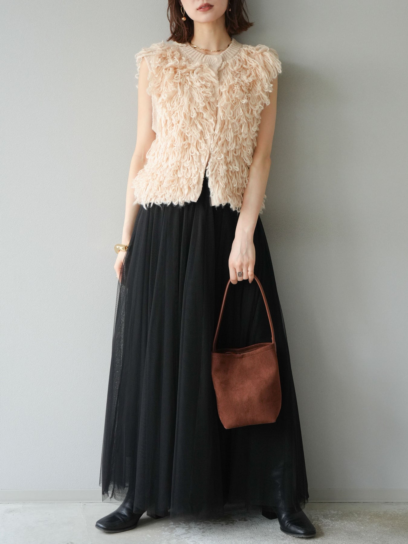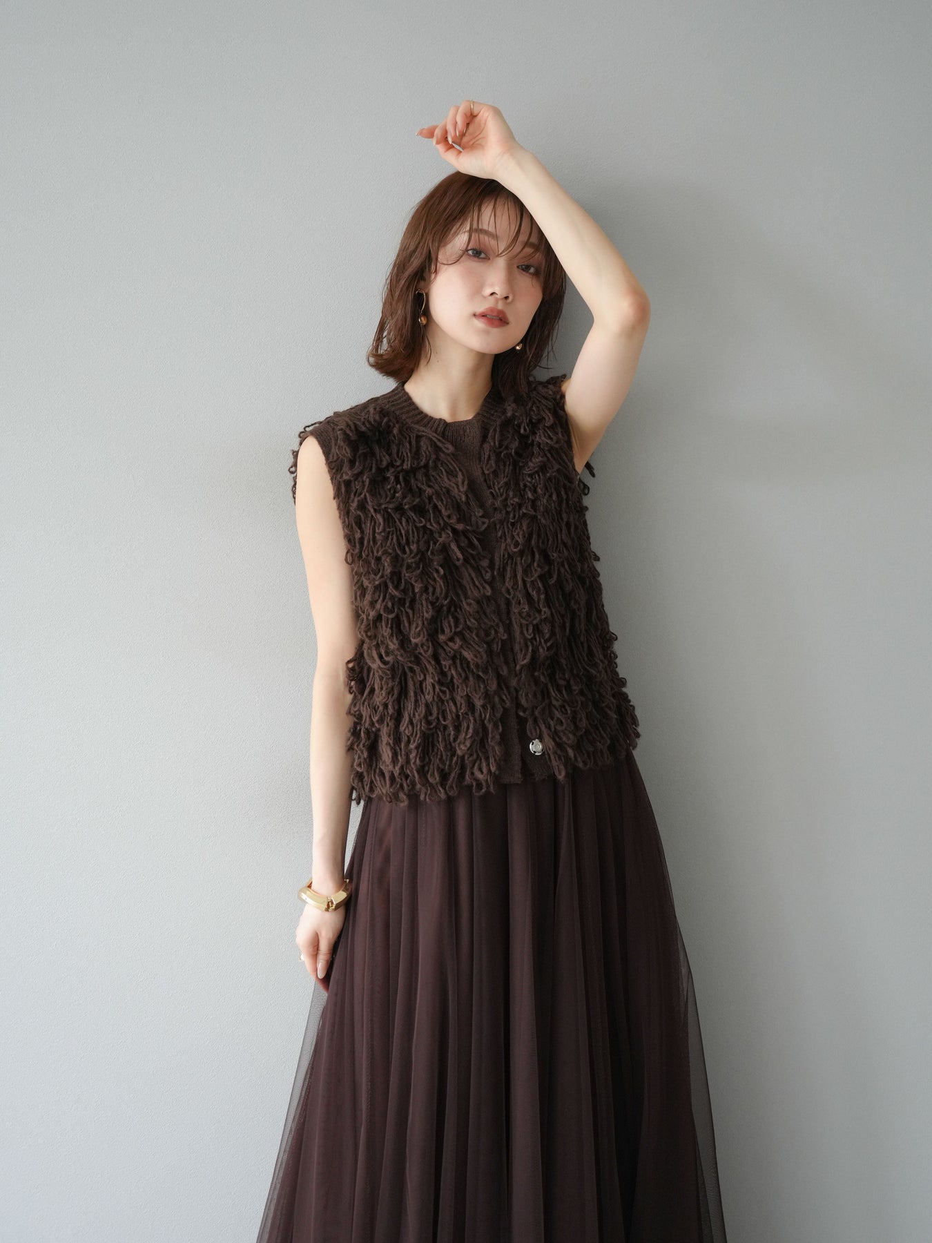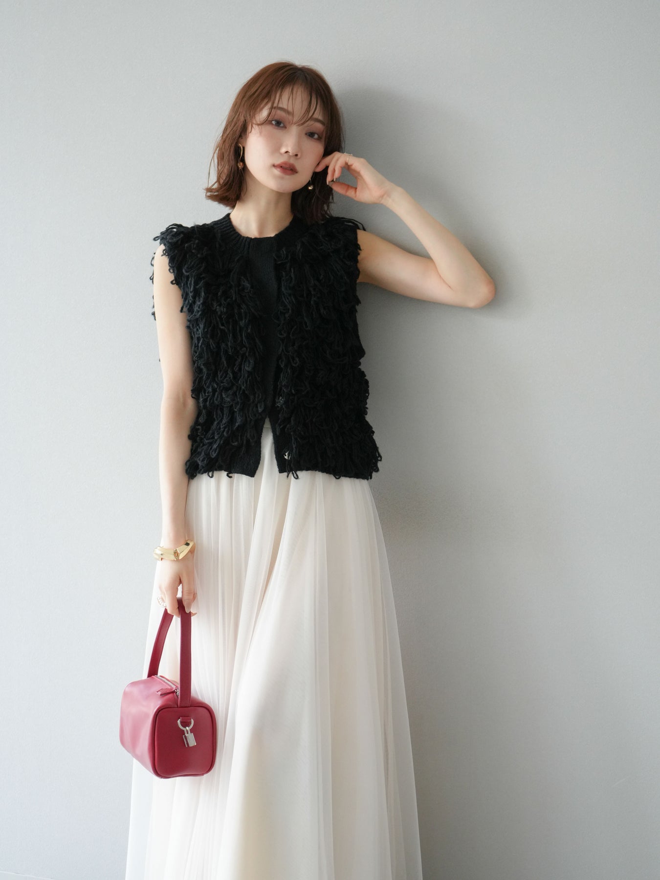 這款背心正面採用立體環狀針織。寬鬆的針織設計格外醒目,內搭簡潔的內搭也能為整體造型增添一抹優雅。正面配有連結,方便穿脫;敞開穿著時可展現休閒感,閉合穿著時則可展現俐落幹練的氣質。長度適中,可輕鬆搭配從褲裝到裙裝的各種下裝。換季時可作為輕薄的外搭,秋冬時可作為層疊造型的點綴,是一款四季皆宜的百搭單品。 *除下裝及吊帶背心(內搭)外,其他商品皆不包含內搭。