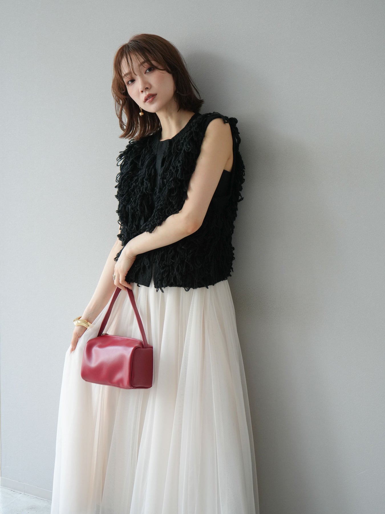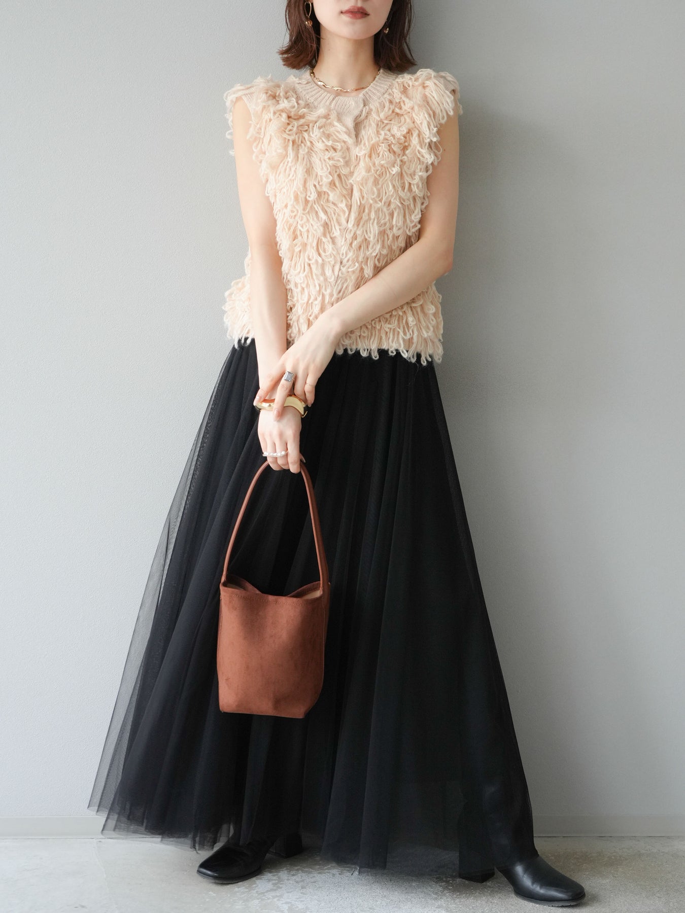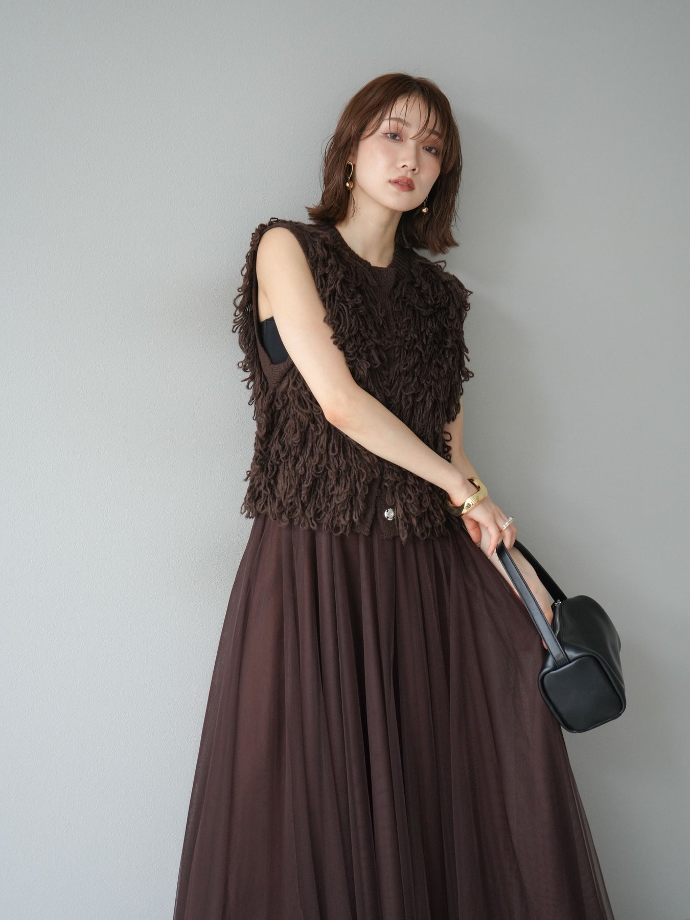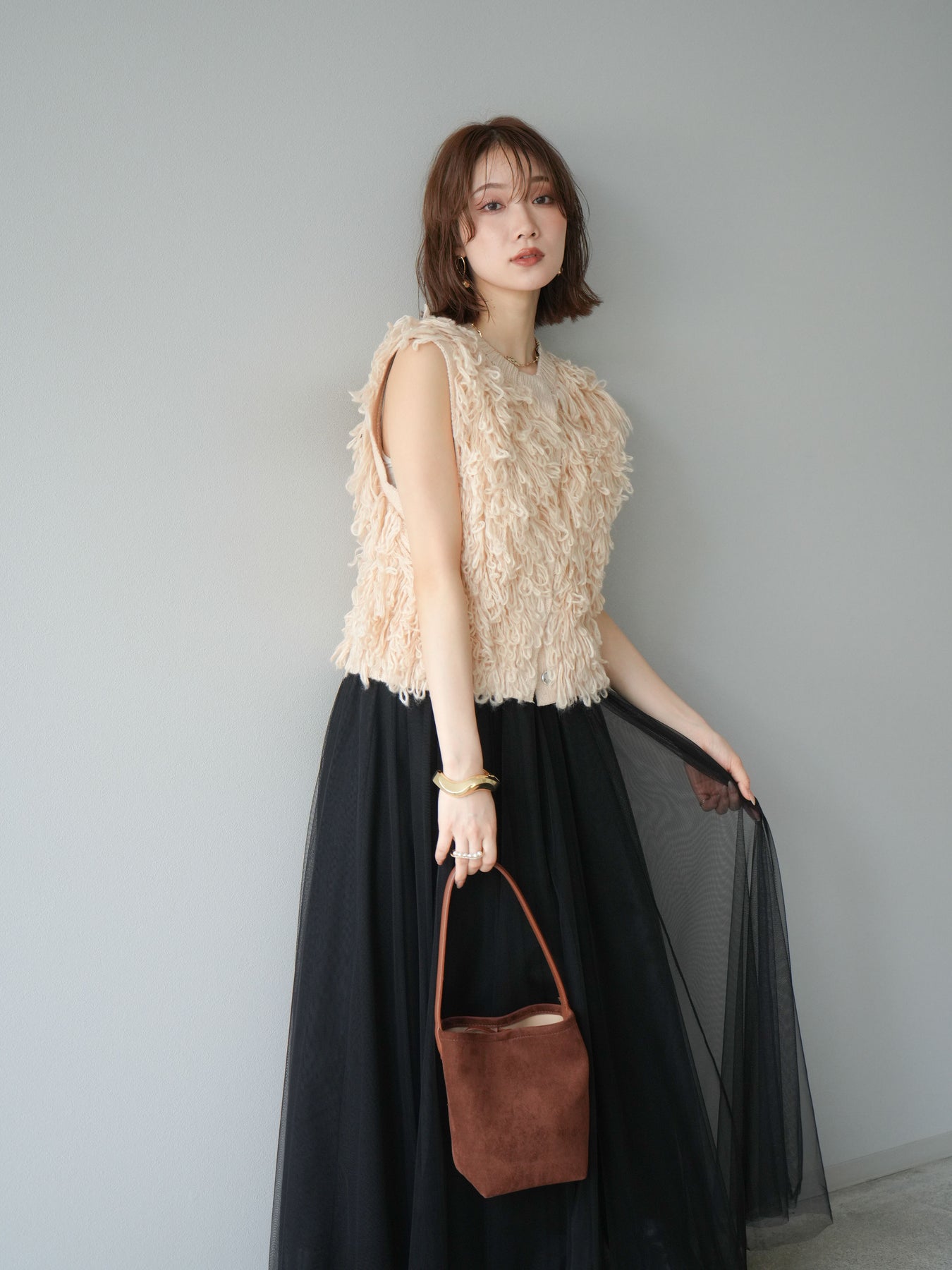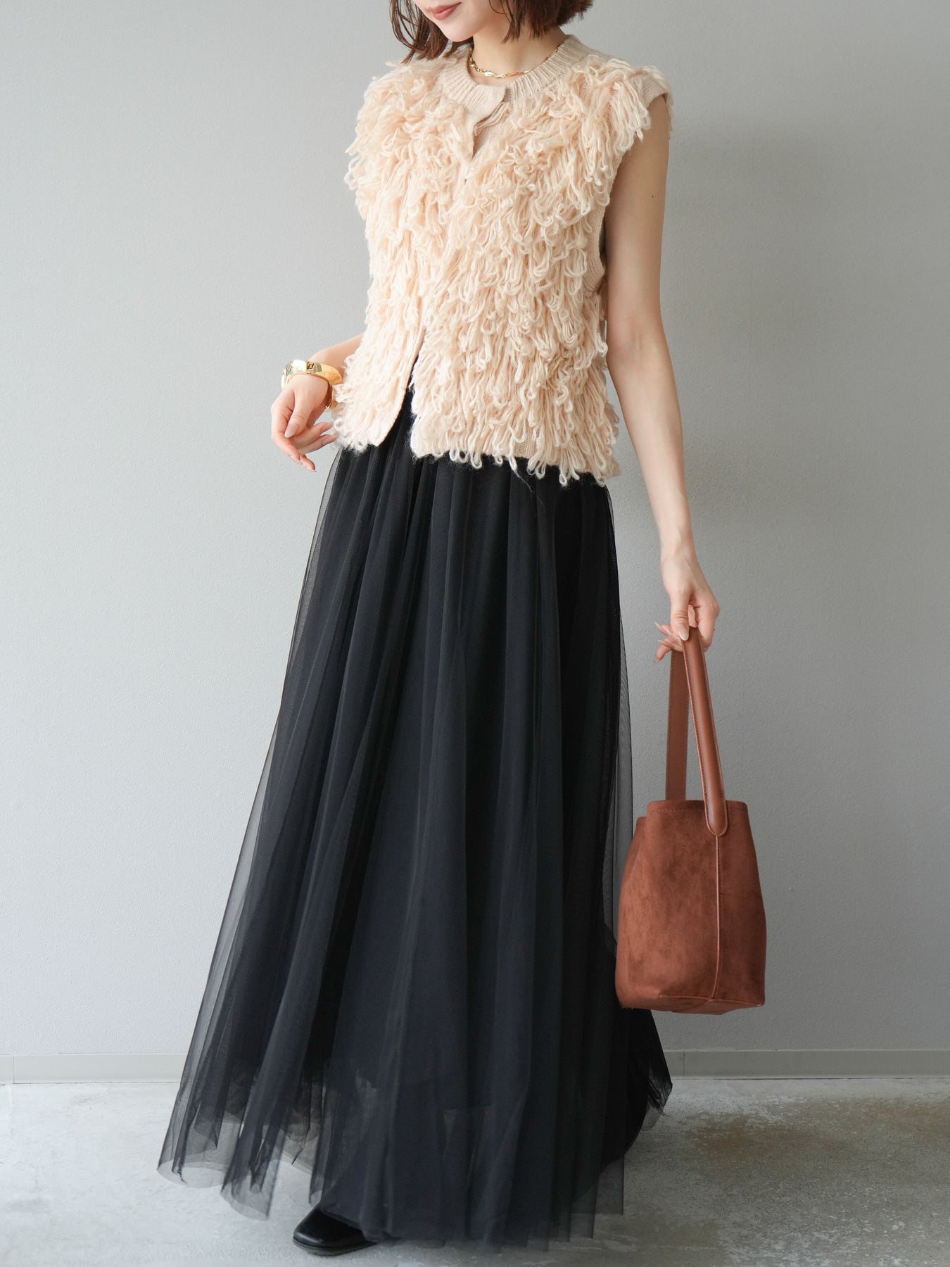 這款背心正面採用立體環狀針織。寬鬆的針織設計格外醒目,內搭簡潔的內搭也能為整體造型增添一抹優雅。正面配有連結,方便穿脫;敞開穿著時可展現休閒感,閉合穿著時則可展現俐落幹練的氣質。長度適中,可輕鬆搭配從褲裝到裙裝的各種下裝。換季時可作為輕薄的外搭,秋冬時可作為層疊造型的點綴,是一款四季皆宜的百搭單品。 *除下裝及吊帶背心(內搭)外,其他商品皆不包含內搭。