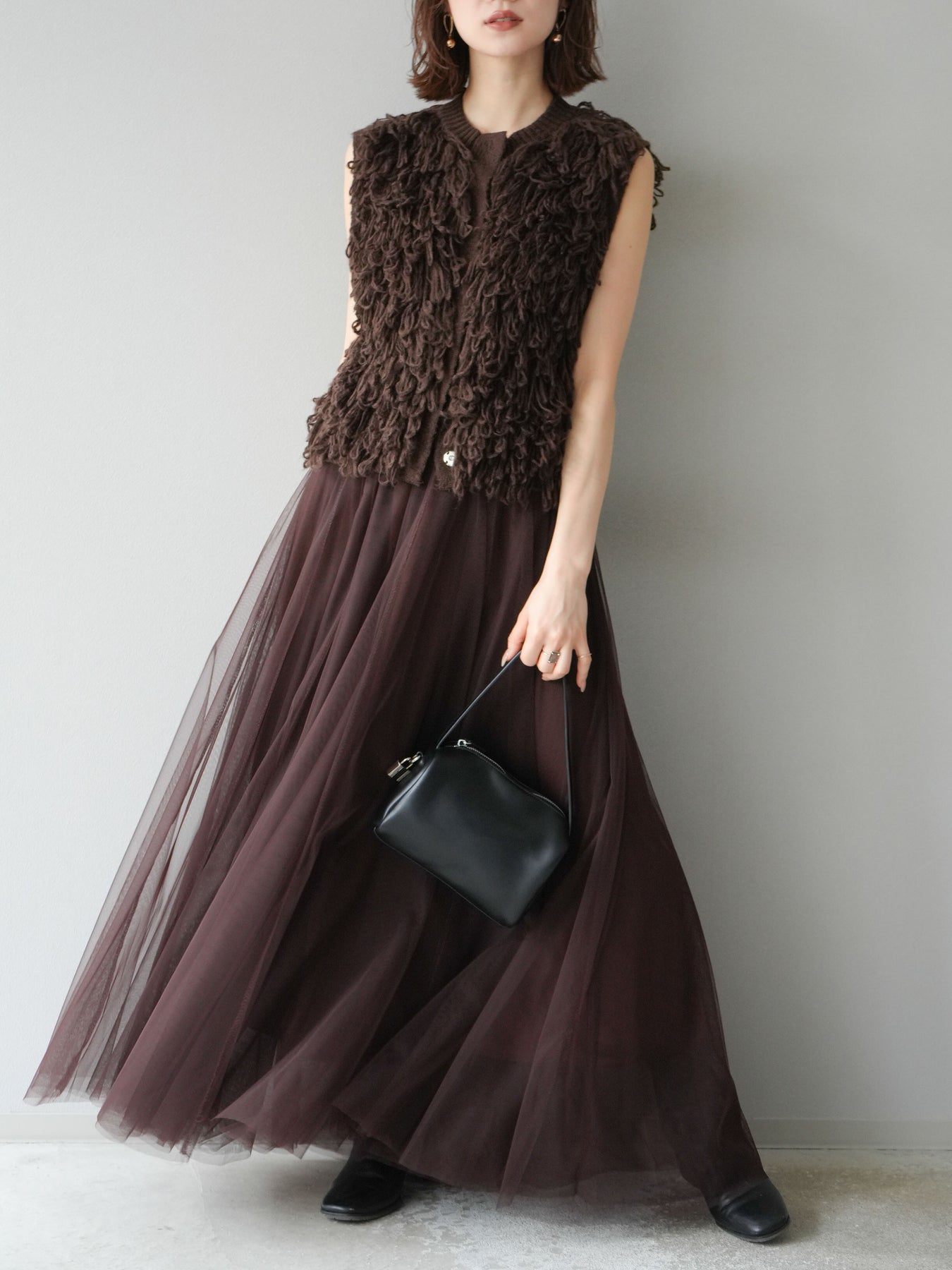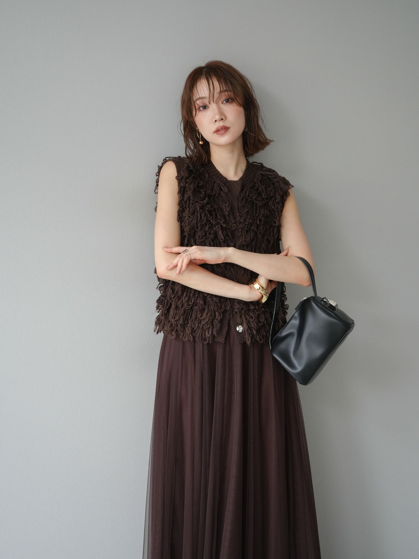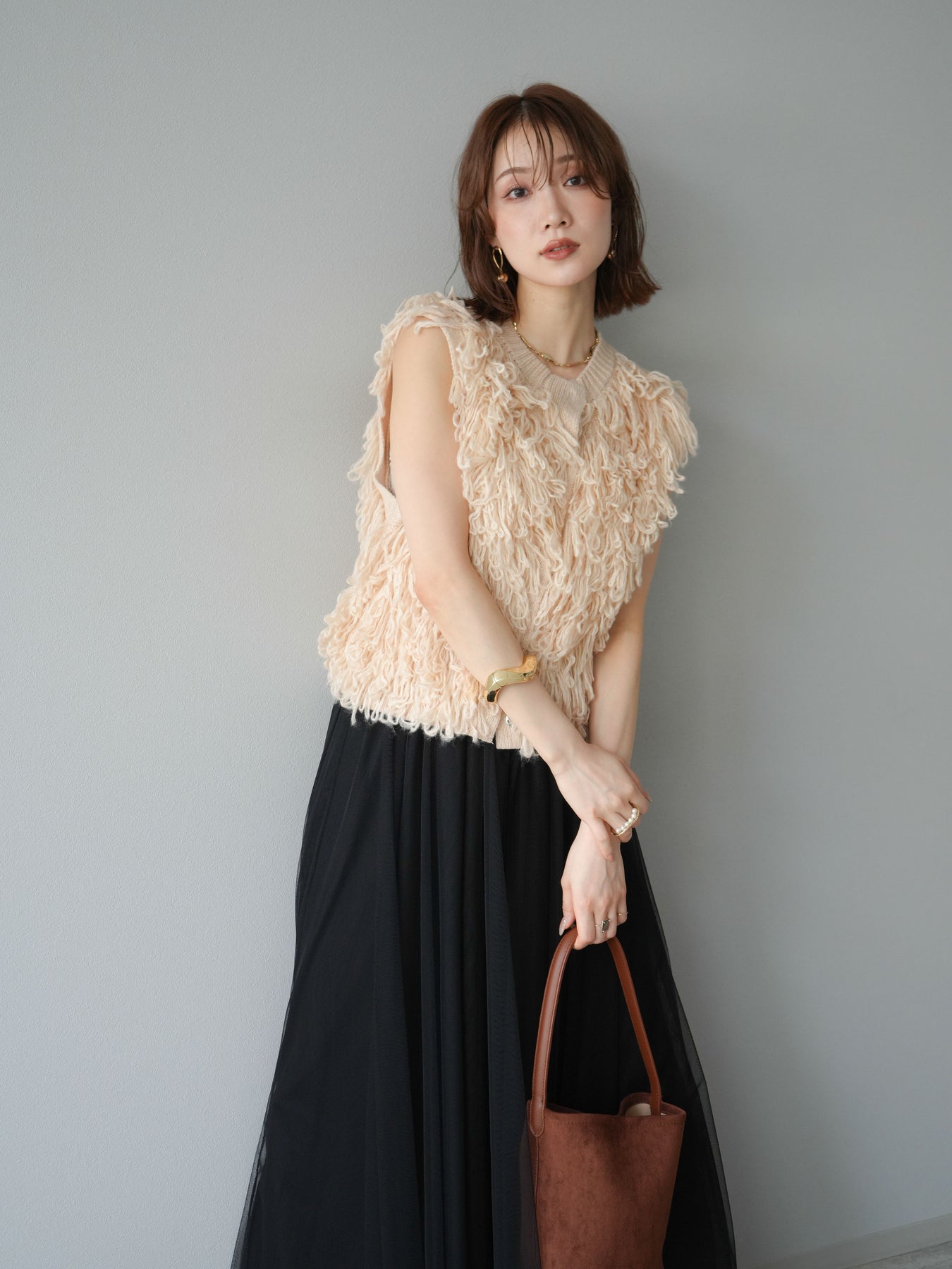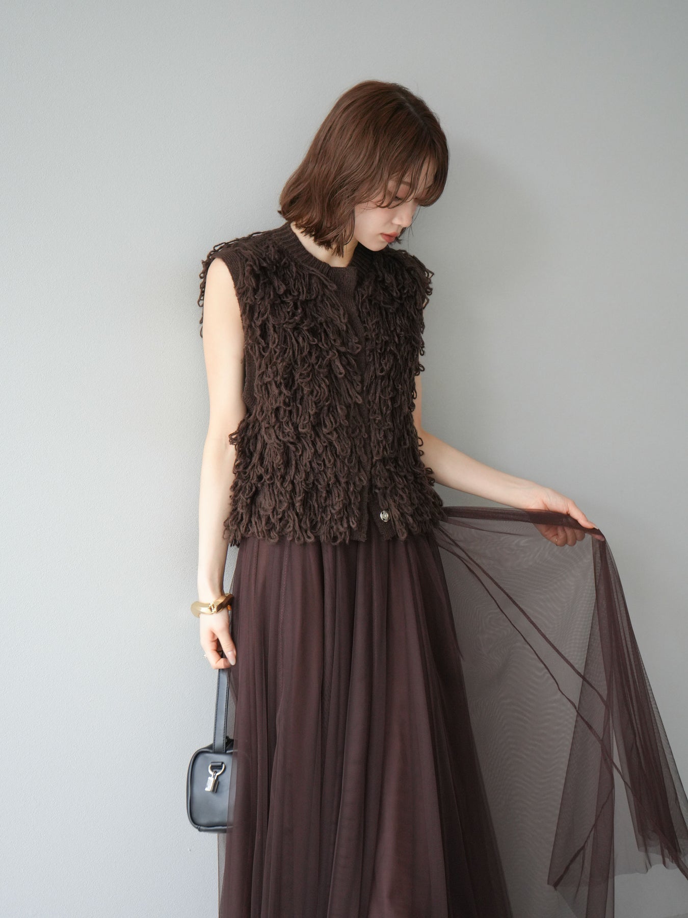 這款背心正面採用立體環狀針織。寬鬆的針織設計格外醒目,內搭簡潔的內搭也能為整體造型增添一抹優雅。正面配有連結,方便穿脫;敞開穿著時可展現休閒感,閉合穿著時則可展現俐落幹練的氣質。長度適中,可輕鬆搭配從褲裝到裙裝的各種下裝。換季時可作為輕薄的外搭,秋冬時可作為層疊造型的點綴,是一款四季皆宜的百搭單品。 *除下裝及吊帶背心(內搭)外,其他商品皆不包含內搭。