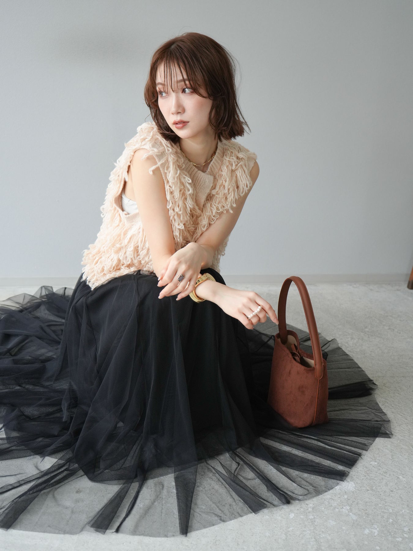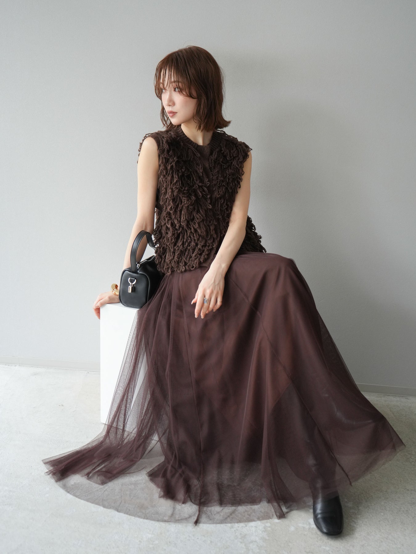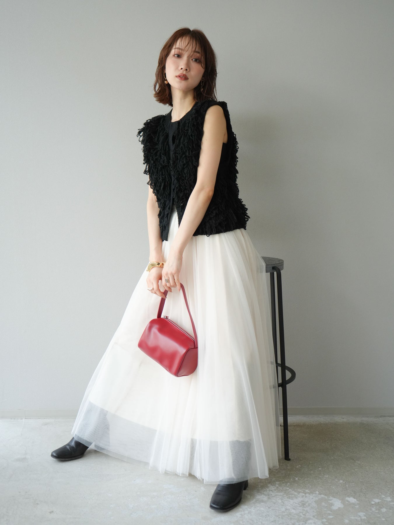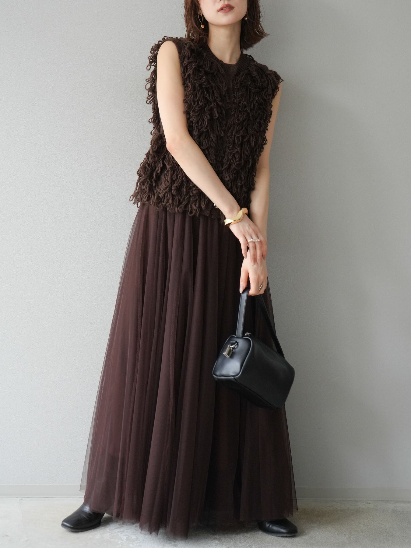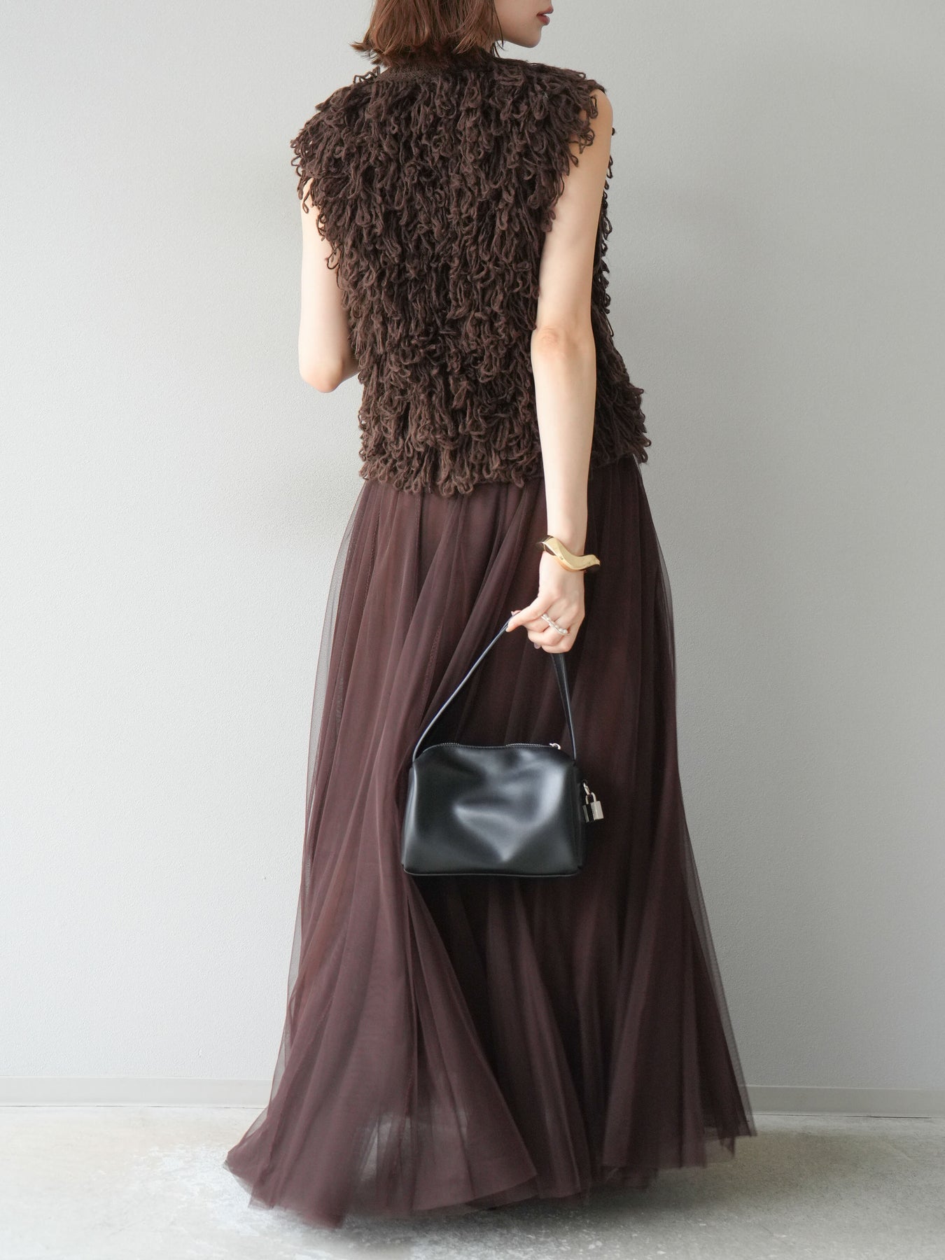 這款背心正面採用立體環狀針織。寬鬆的針織設計格外醒目,內搭簡潔的內搭也能為整體造型增添一抹優雅。正面配有連結,方便穿脫;敞開穿著時可展現休閒感,閉合穿著時則可展現俐落幹練的氣質。長度適中,可輕鬆搭配從褲裝到裙裝的各種下裝。換季時可作為輕薄的外搭,秋冬時可作為層疊造型的點綴,是一款四季皆宜的百搭單品。 *除下裝及吊帶背心(內搭)外,其他商品皆不包含內搭。